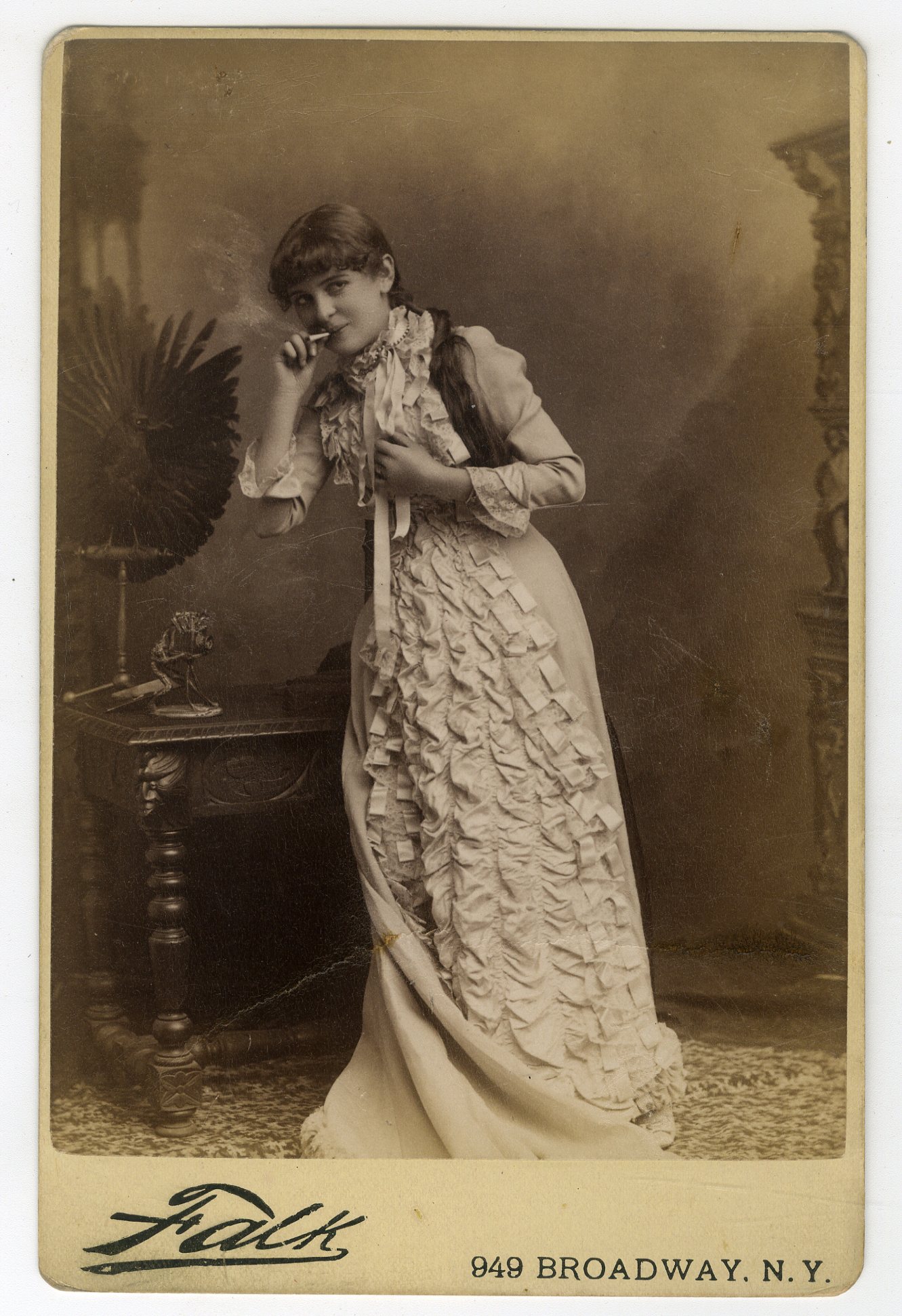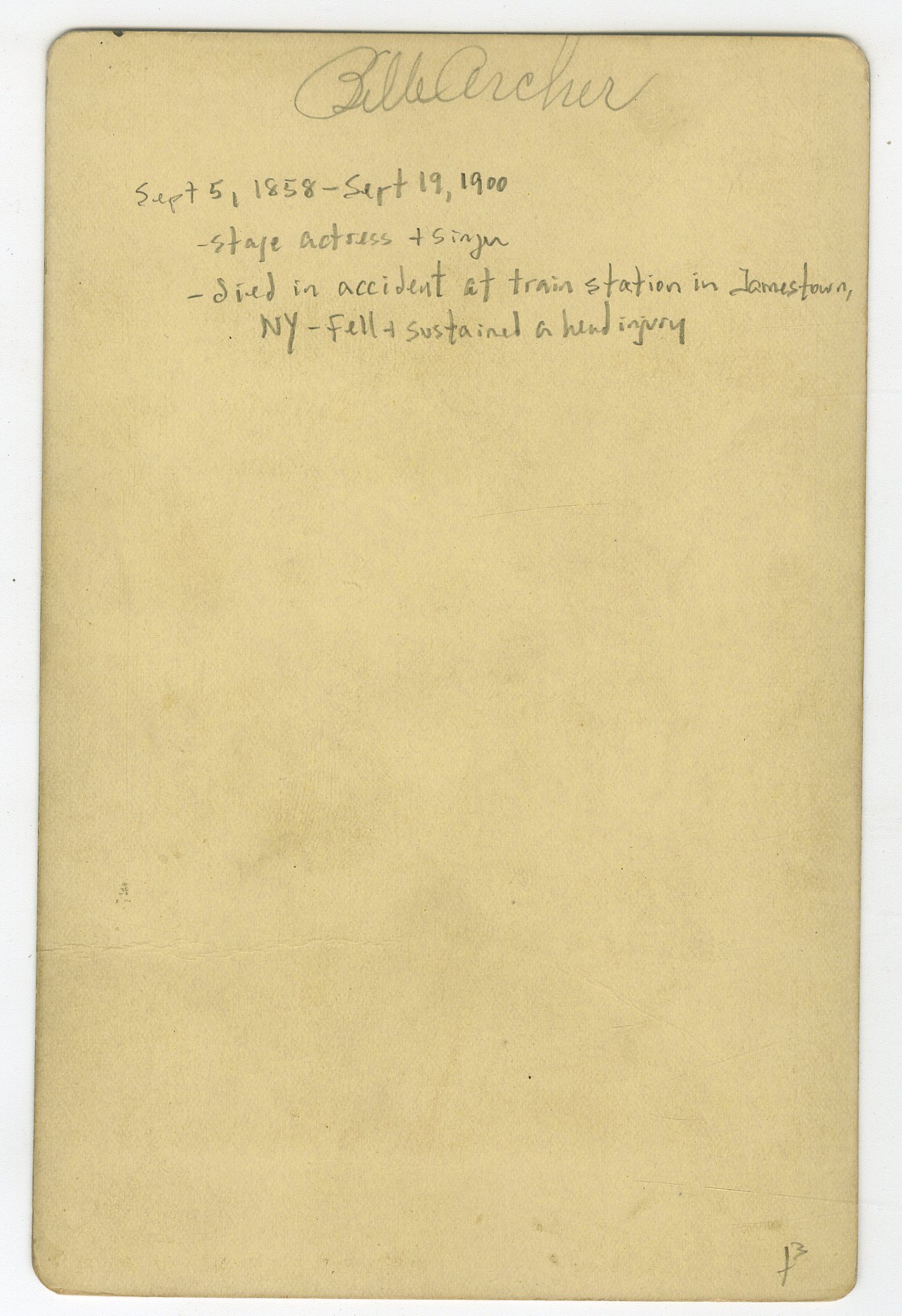 Act265. Falk, NY. Belle Archer (Sept. 5, 1858-Sept. 19, 1900). Stage actress & singer. Died in an accident at the train station in Jamestown, NY when she fell and sustained a head injury. There is an inch line abrasion in the image toward the lower left o/w VG. $75
