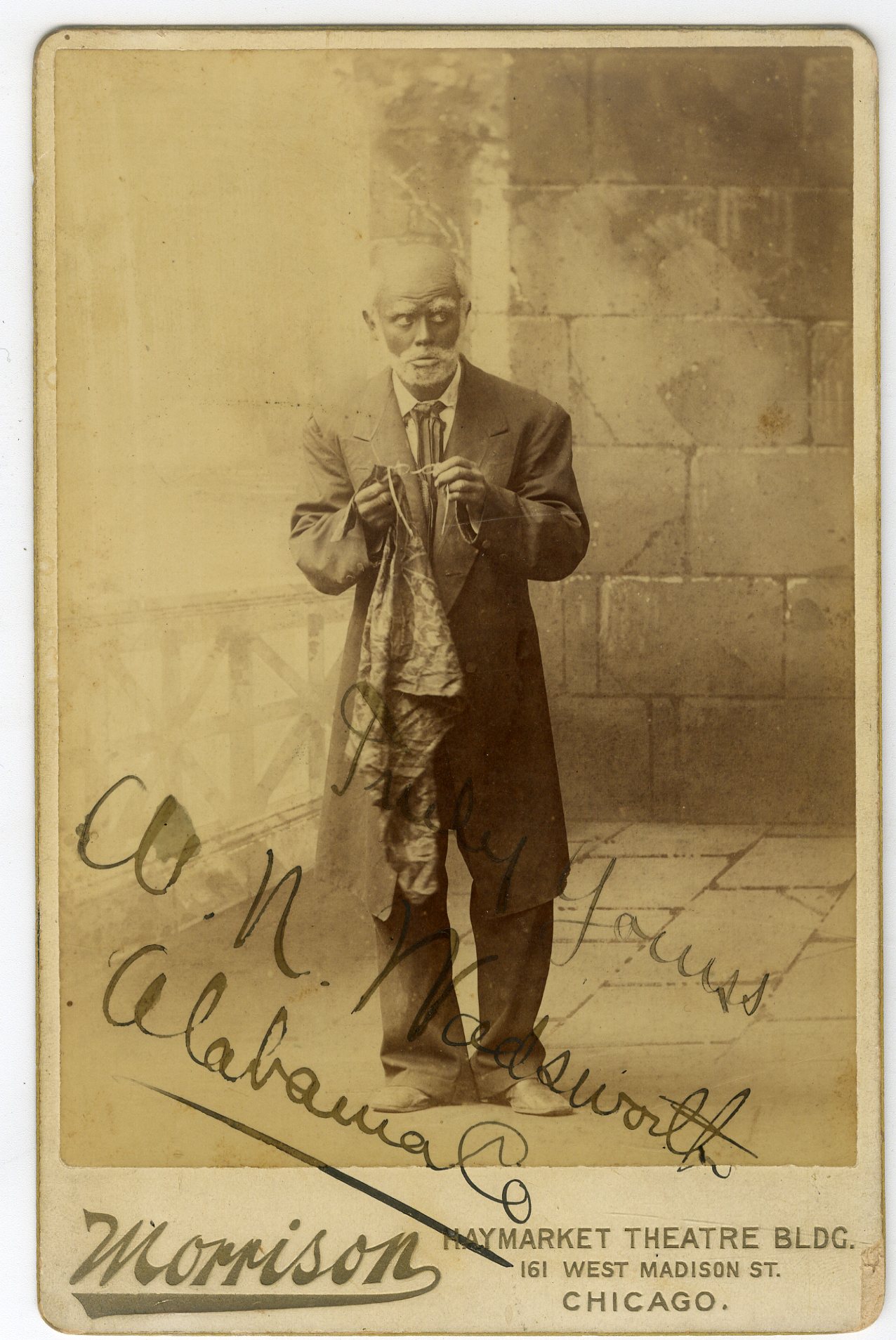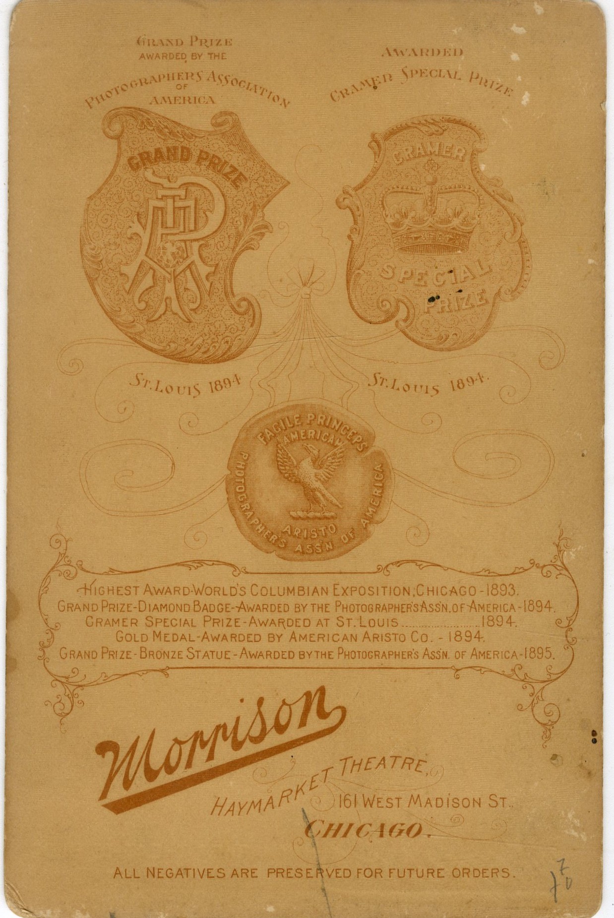 Act266. Morrison, Haymarket Theatre, Chicago. Inscribed “Truly Yours, W.N. Wadsworth, Alabama Co.” Cabinet card appears to be an African-American actor but could conceivably be someone in black face, although it would be a very convincing make-up job. VG. $150
