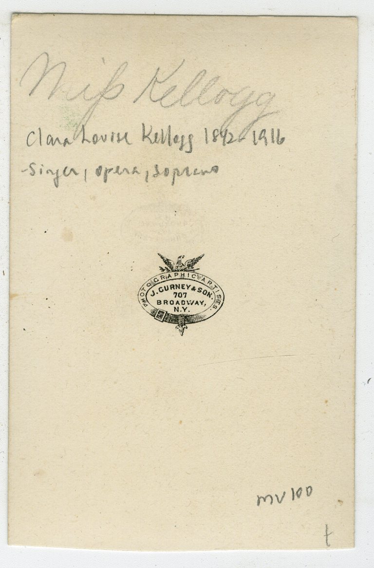 MU100. J. Gurney & Son, NY. Clara Louise Kellogg (1842-1916). Operatic soprano. CDV, trimmed at bottom. VG. $20