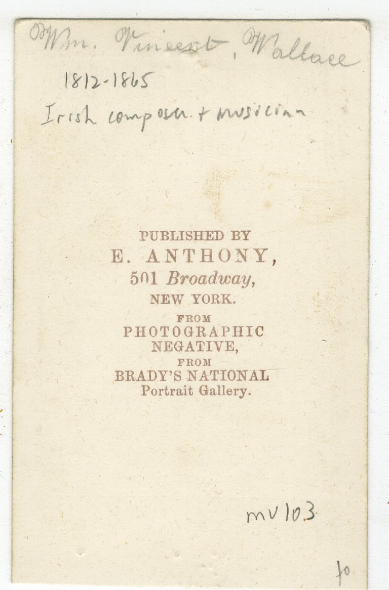 MU103. Photographic negative from Brady’s National Portrait Gallery, published by E. Anthony, NY. William Vincent Wallace (1812-1965), Irish composer and musician. Trimmed at bottom. VG. $25