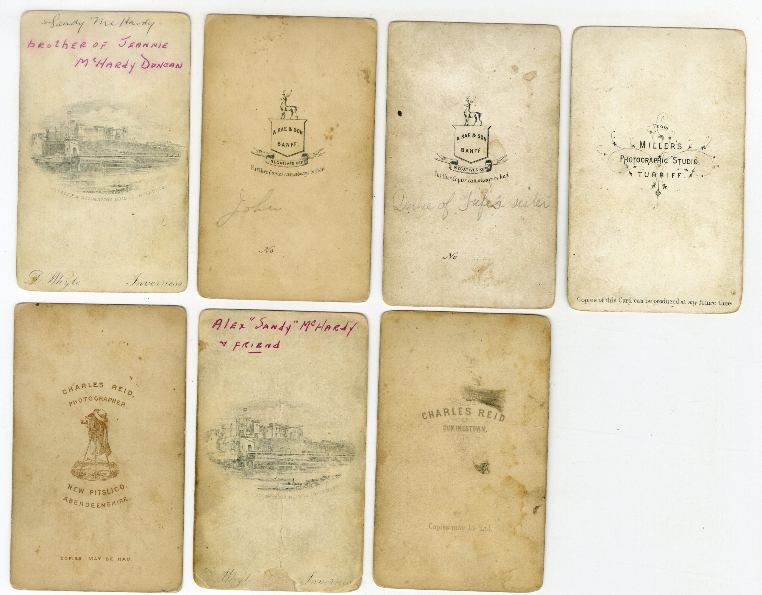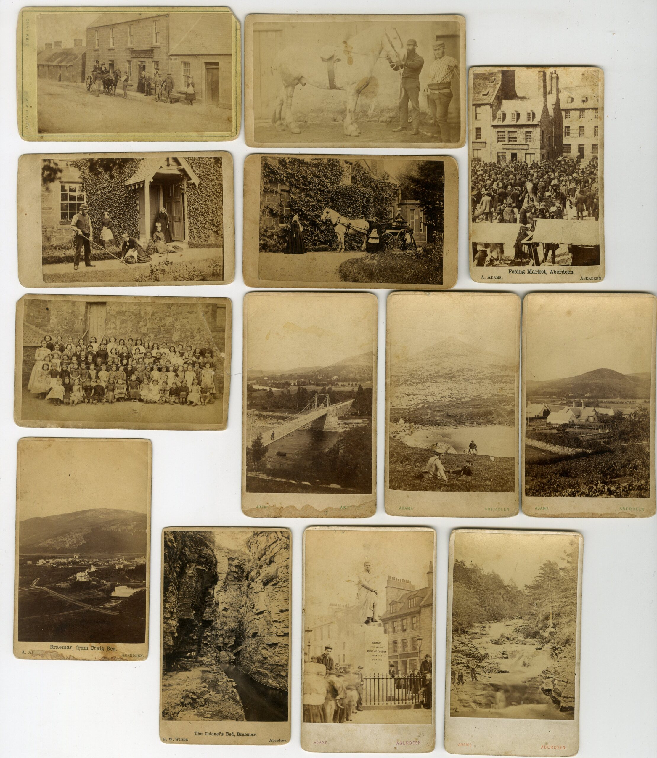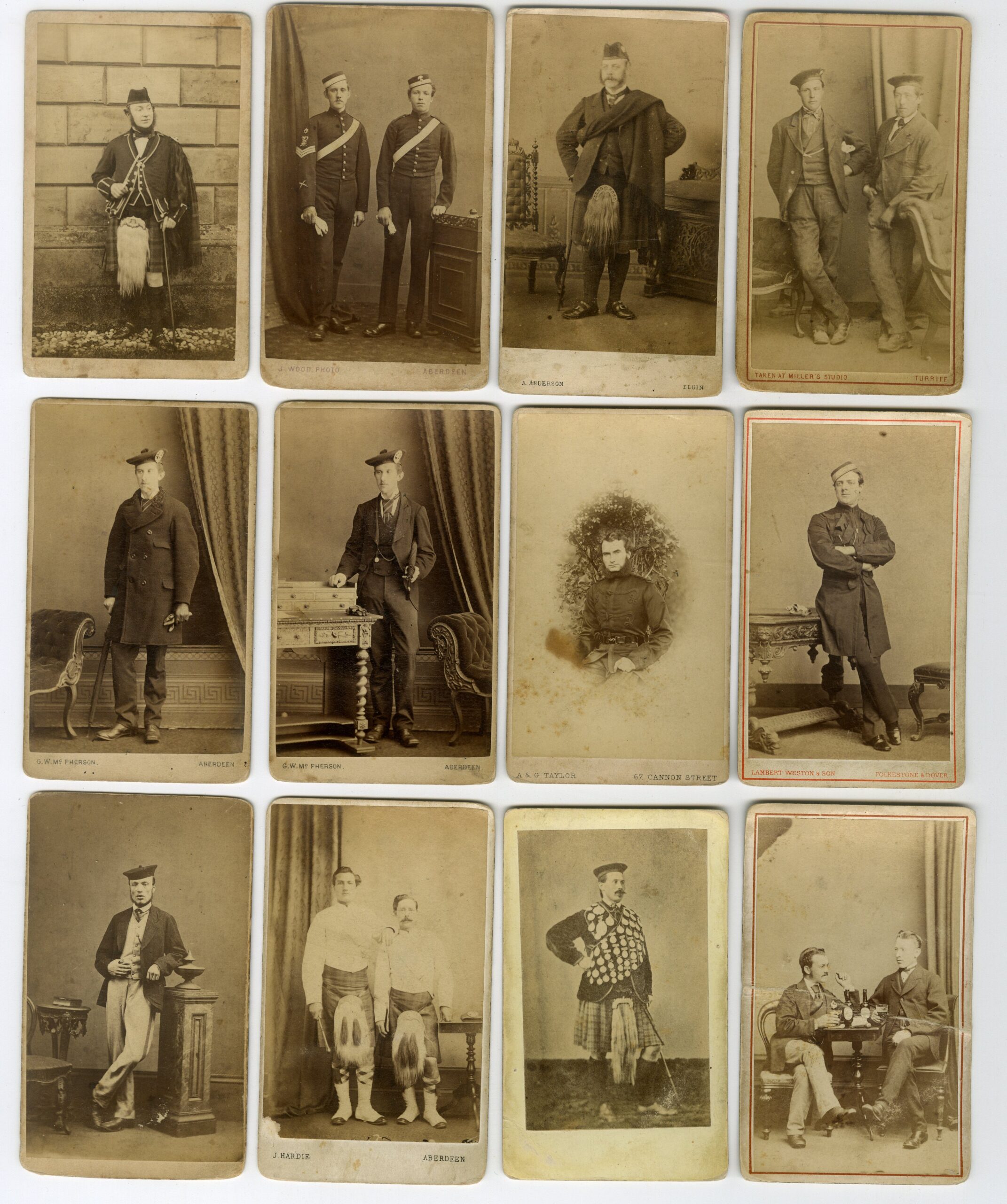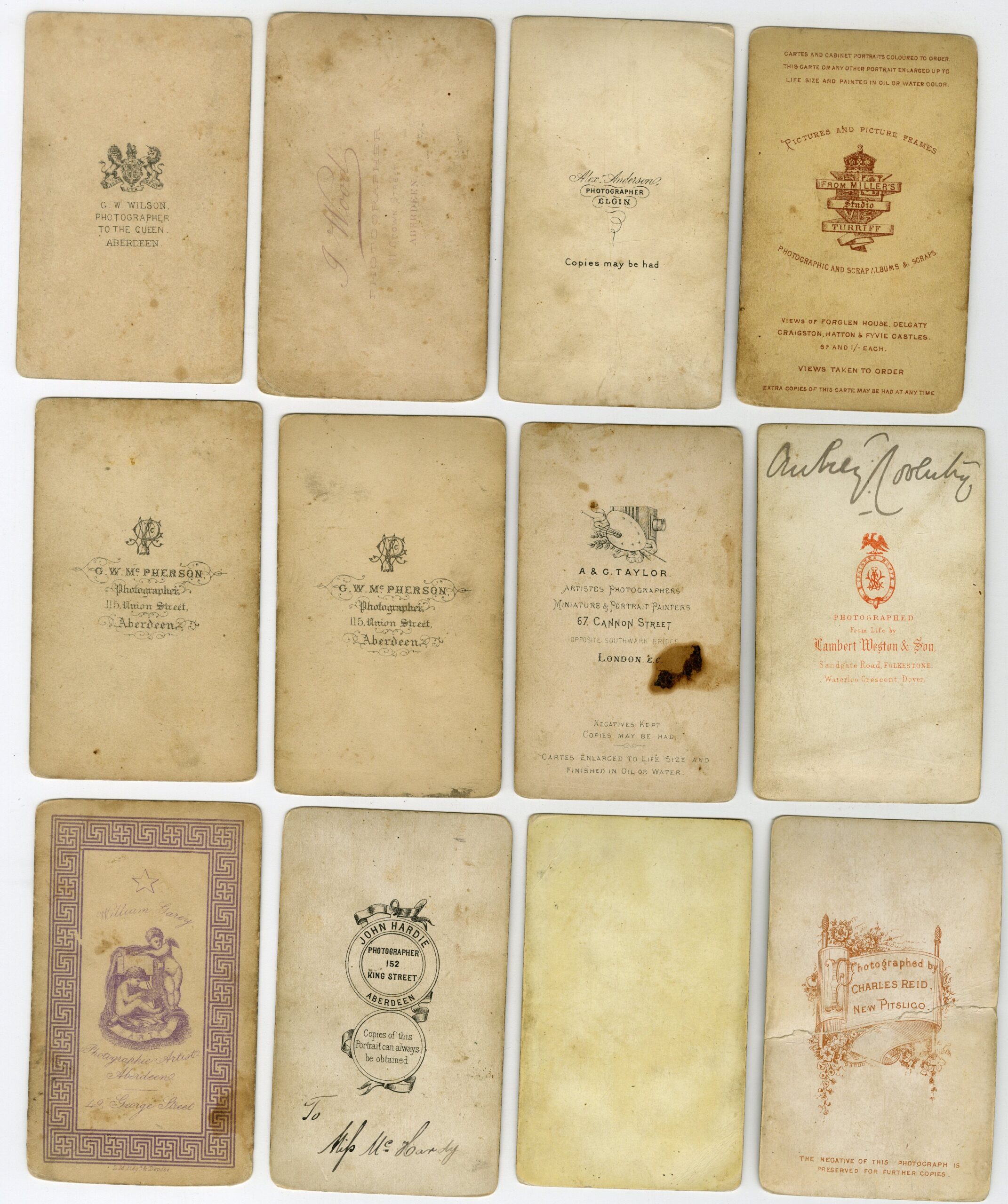 PPCDV293. SCOTLAND! CDV collection of 32 Scottish CDVs, both portraits and outdoor scenes. Photographers included: A. Rae & Son, Banff (2); D. Whyte, Inverness (1); Charles Reid, New Pitslico, Aberdeenshire (3); Charles Reid, Cuminestown (4); Miller’s, Turriff (2); J. Wood, Aberdeen (1); G.W. Wilson, Aberdeen (2); Alex Anderson, Elgin (1); G.W. McPherson, Aberdeen (2); QA&C Taylor, London (1); Lambert Weston & Son, Dover (1); John Hardie, Aberdeen (1); William Garey, Aberdeen (1); A. Adams, Aberdeen (7); Robert M. Penny, Aberdeenshire (1); & anonymous (1). Three of the CDVs have creases. A number have IDs on versos. G. $180