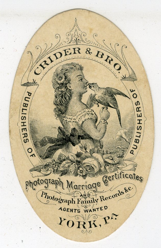 Photobuscard7. Here is a fine oval advertising card for “Crider & Bro. Publishers of Photograph Marriage Certificates and Photograph Family Records &c. Agents Wanted. York, Pa.” Measures 3.125″ x 2.” E. $85