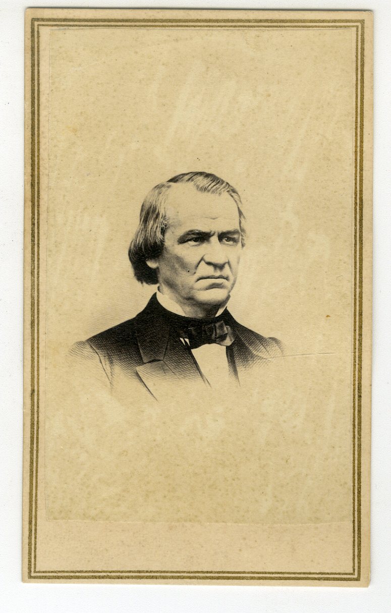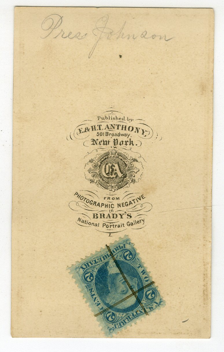 PR295. Brady’s National Portrait Gallery, published by E&HT Anthony. President Andrew Johnson. Cancelled 2-cent tax stamp on verso. VG. $125