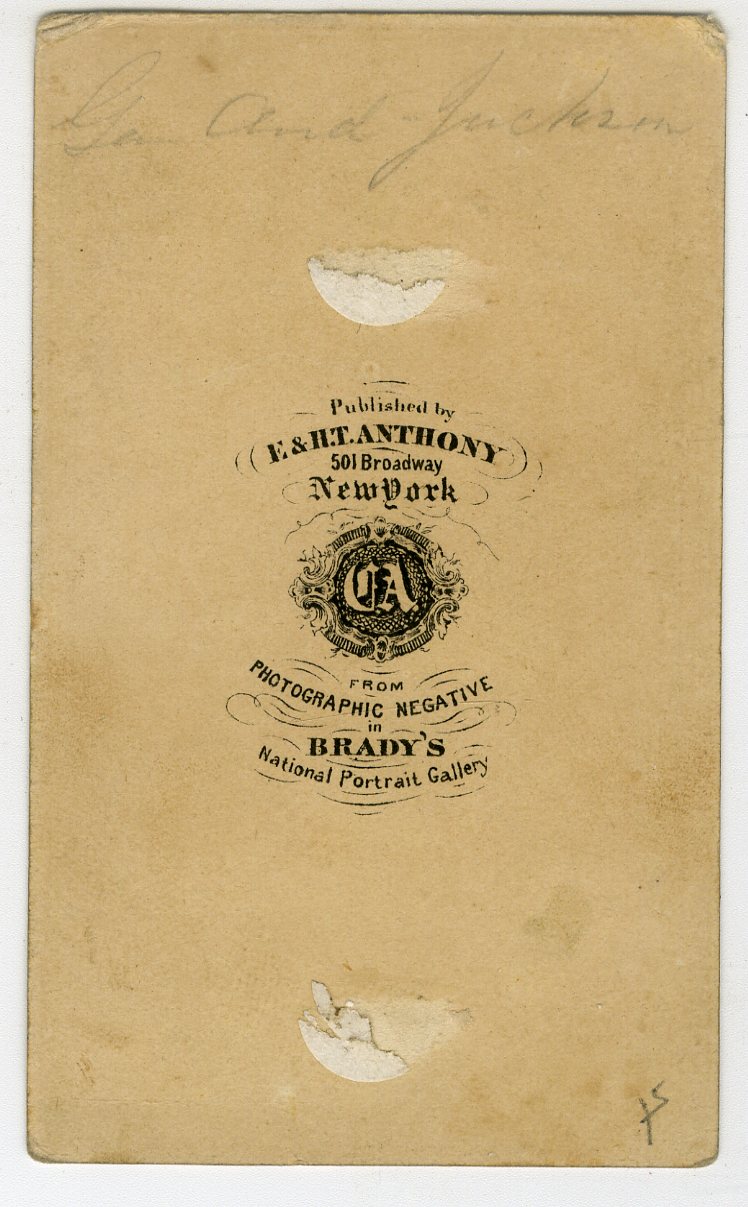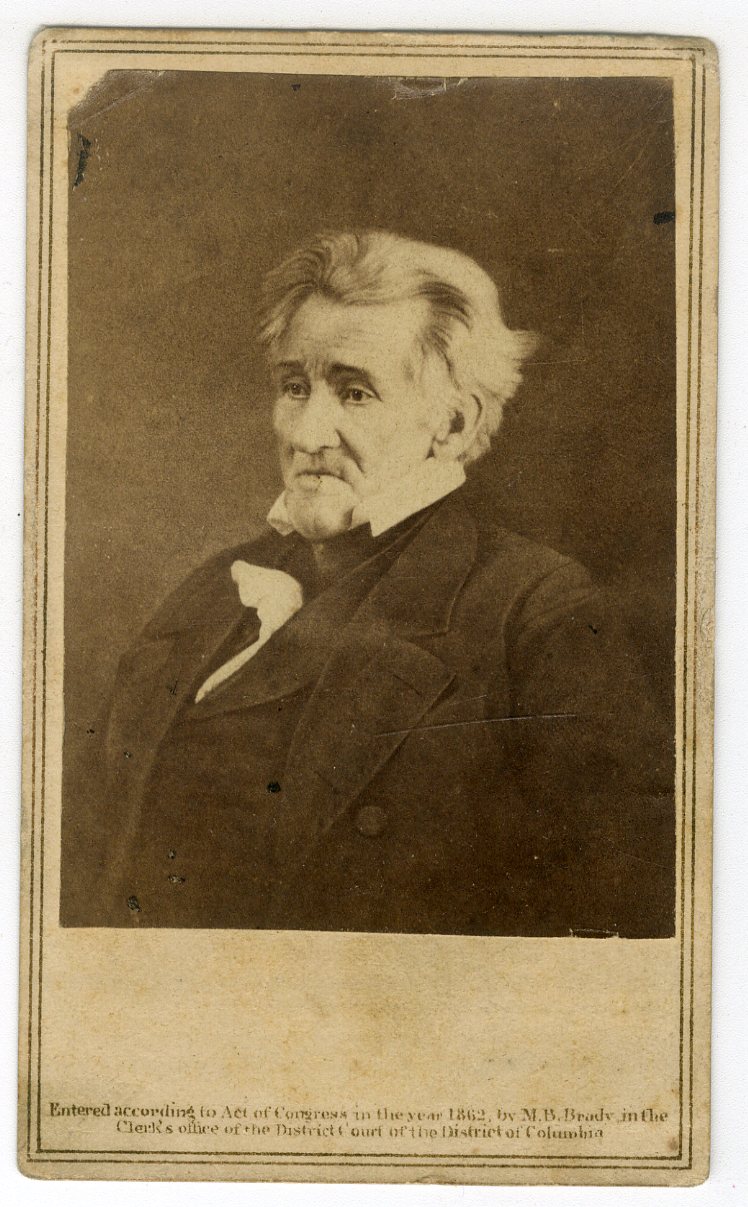 PR297. Brady’s National Portrait Gallery, published by E&HT Anthony. Andrew Jackson (March 15, 1767 – June 8, 1845) was the seventh president of the United States from 1829 to 1837. He rose to fame as a U.S. Army general and served in both houses of the U.S. Congress. His political philosophy, which dominated his presidency, became the basis for the rise of Jacksonian democracy. His legacy is controversial: he has been praised as an advocate for white working Americans and preserving the union of states, and criticized for his racist policies, particularly towards Native Americans. M.B. Brady’s 1862 copyright line bottom recto of this CDV image of an earlier daguerreotype of Jackson. G. $100