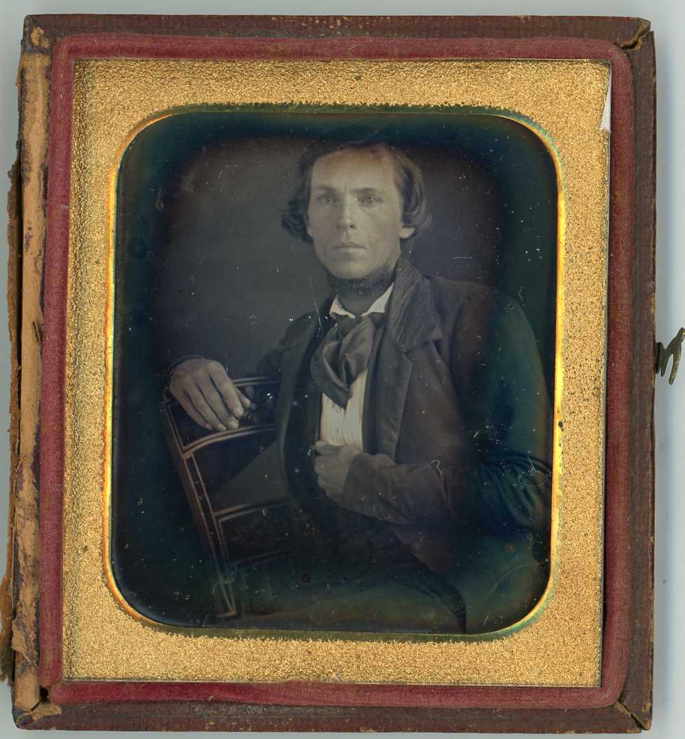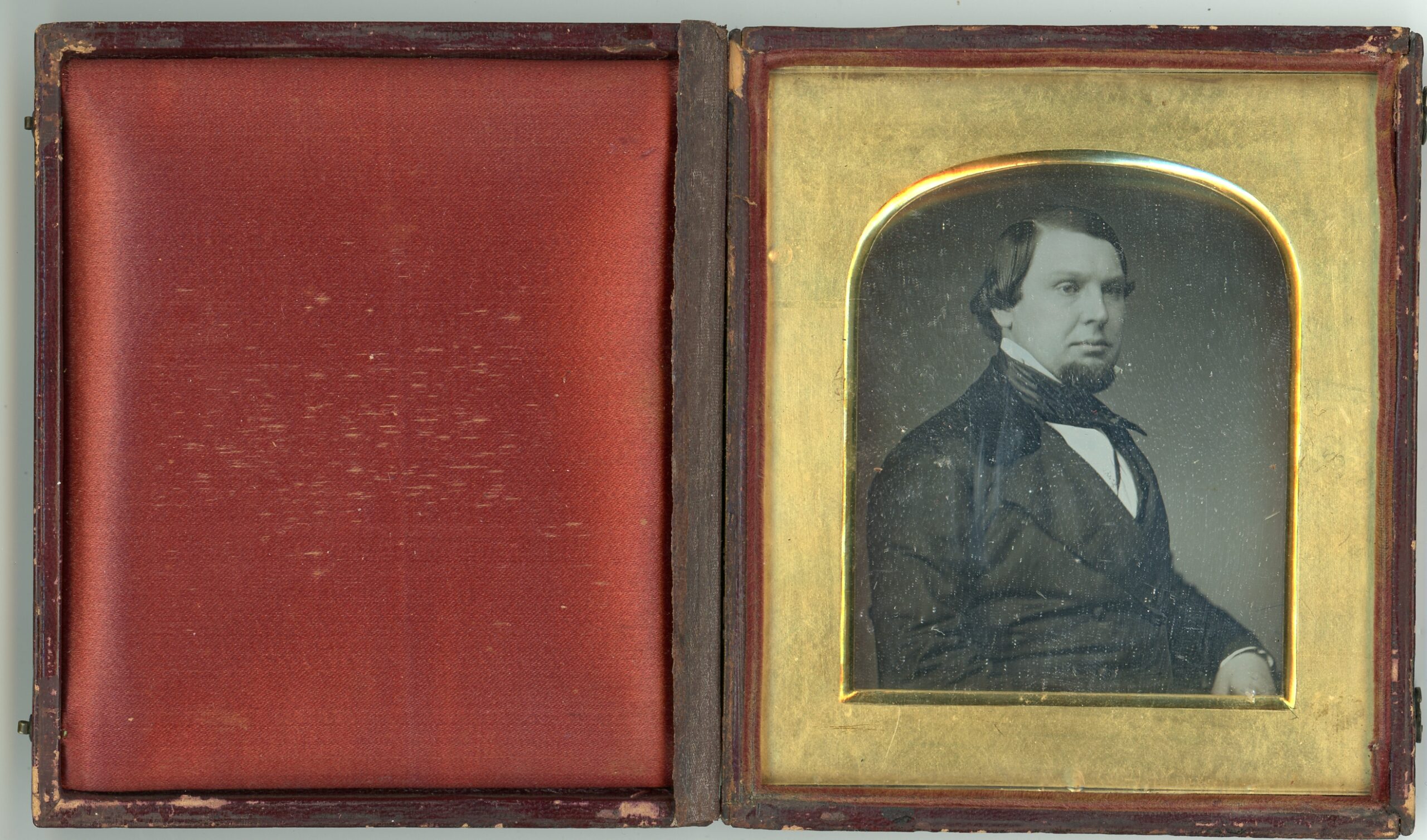 D1219. Sixth-plate daguerreotype of a gentleman with a chin beard. Resealed, housed in a half leather case. In the inside of the case is pasted some newsprint from July 16, 1850. VG. $85