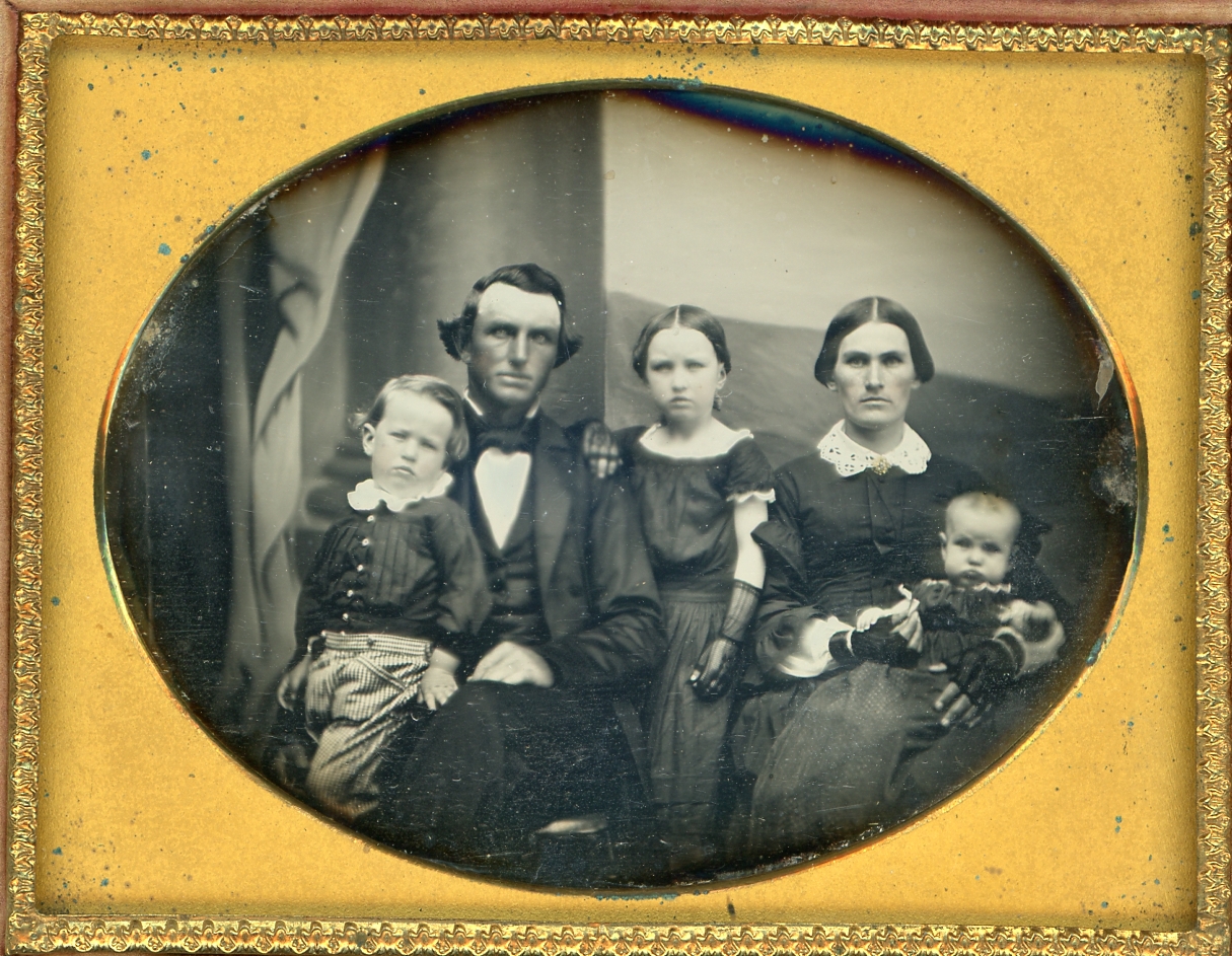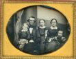 D1284. Fine sixth-plate daguerreotype of a family of six. Resealed, new glass, housed in a full leather case. VG. $375