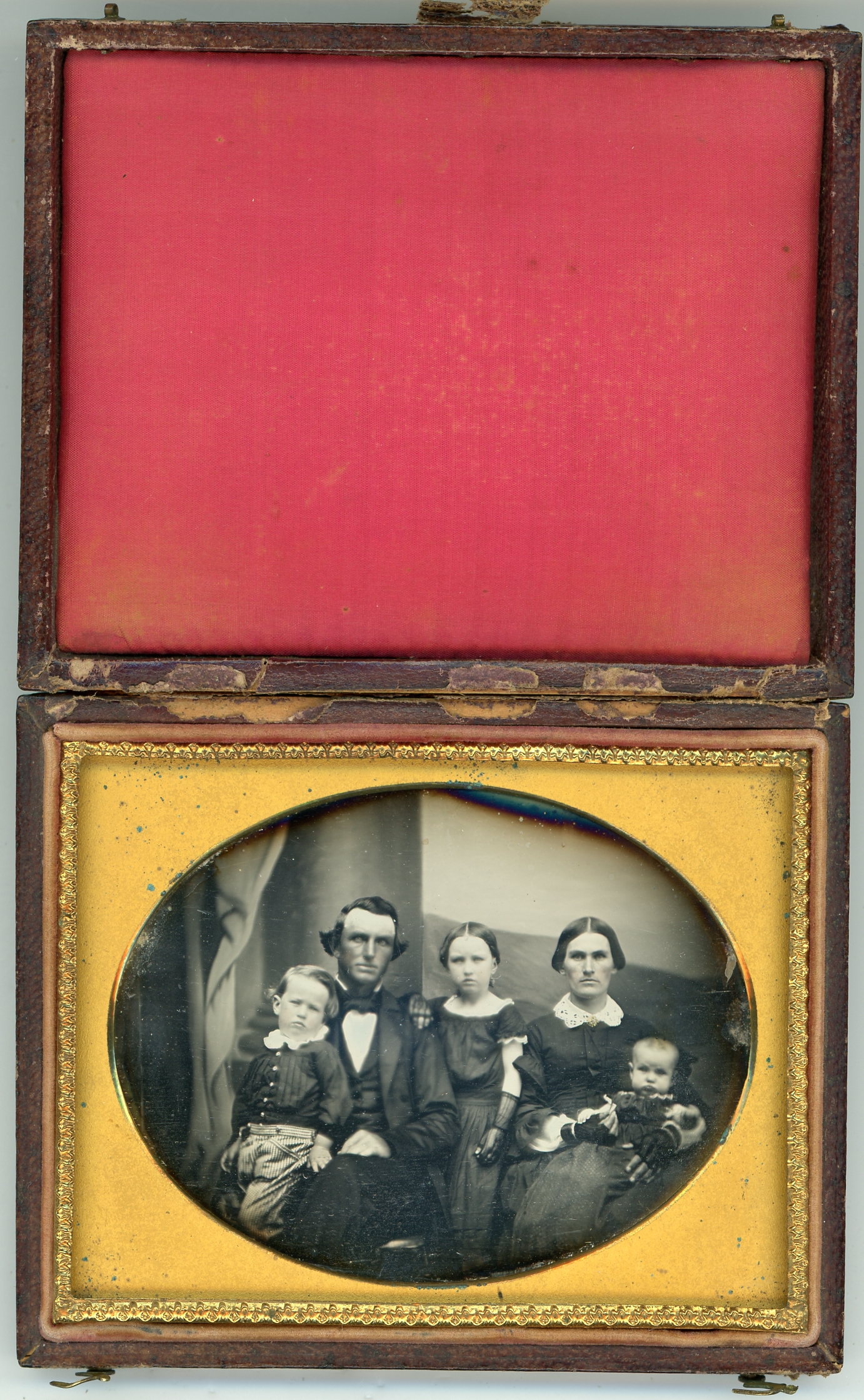 D1192. Group of 3 images of the same family. The first one is a quarter-plate daguerreotype by “Collins, 3d & Chestnut,” [Philadelphia]. This would be Thomas or David Collins. It is resealed and housed in a full leather case. The second image is a half-plate daguerreotype of the family, resealed and housed in a full leather case. There is a mat abrasion at top and a scratch down by the father’s knee coming in from the left of the image. The third image is a sixth-plate and could be described as a partially hidden father. This image is resealed and housed in a half leather case. VG. $1200