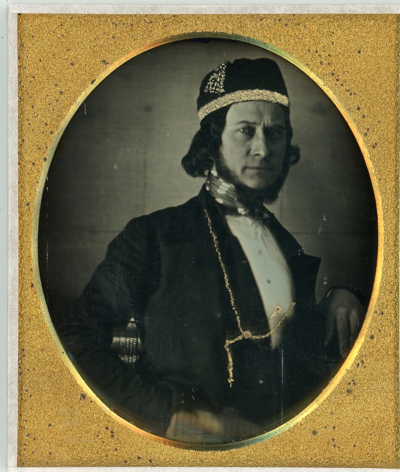 D1306. Sixth-plate daguerreotype of a bearded gentleman with long hair in what looks like an embroidered velvet cap and bright scarf around his neck. Resealed, housed in a full leather case. VG. $850