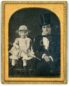 D1069. Sixth-plate daguerreotype of intense-looking father with his child. Resealed, housed in a full, split leather case. VG. $275