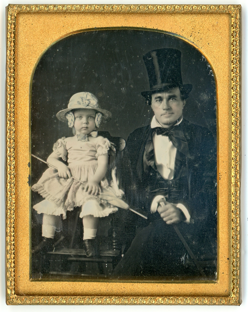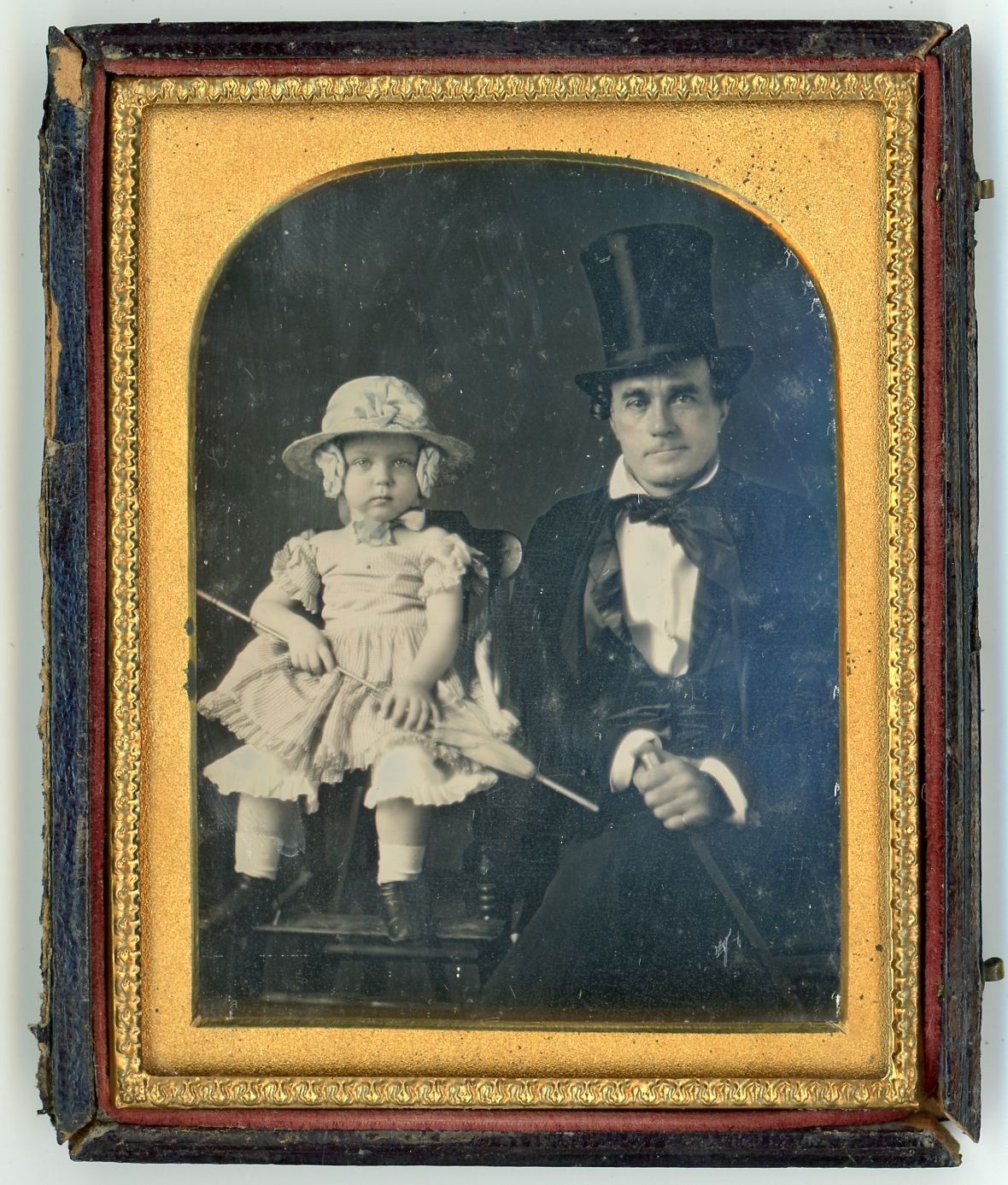 D1308. Quarter-plate daguerreotype of a well-dressed father and daughter. Resealed, housed in a half leather case with bottom slat loose. G. $500