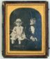 D1072. Pair of sixth-plate daguerreotypes. Left image shows a mother with son; right image shows the father with two sons, one the same as the son with the mother. Both images have been resealed. Housed in a full thermoplastic case (Berg 1-90, Beehive 1, Farm Motif). VG. $400