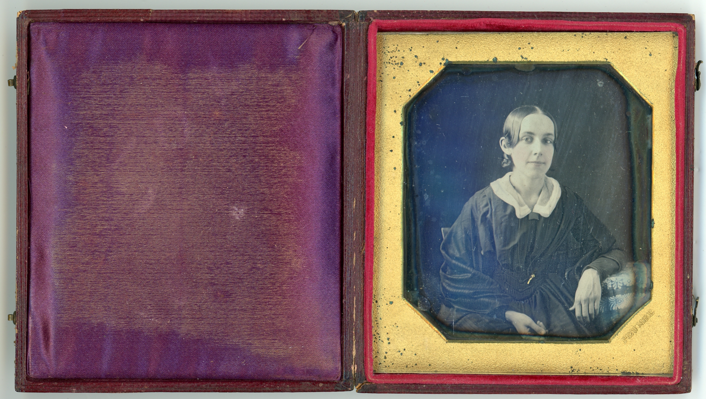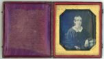 D952. Ninth-plate daguerreotype identified by original slip on velvet mat as “Susan Simmons, Sister of Cornelius Simmons.” Image has its original seals and is housed in a full leather case. VG. $150
