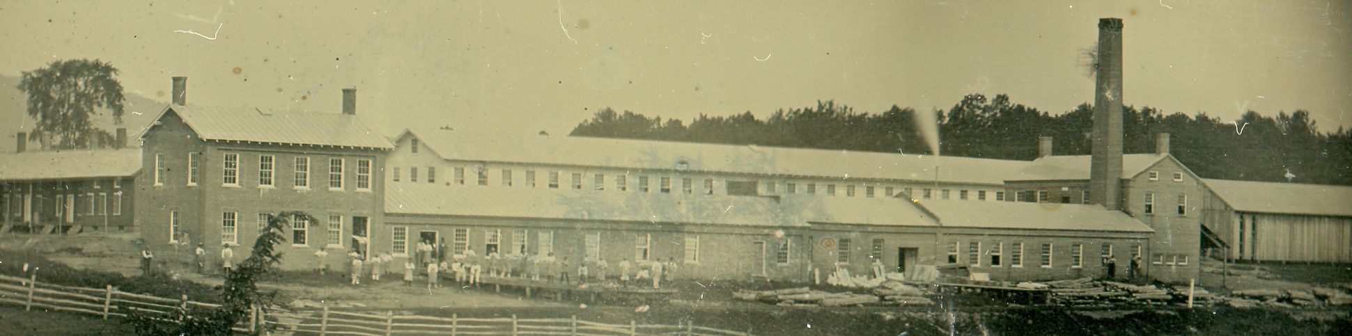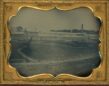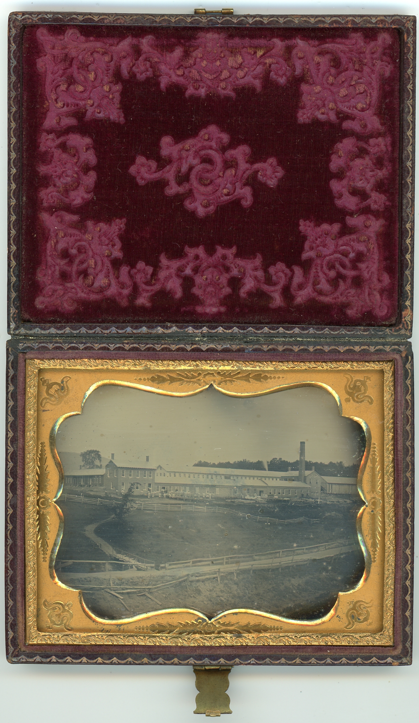 D1270. Quarter-plate daguerreotype of a factory. Workers have come out to pose in front. Resealed, housed in a full leather case. VG. $3500