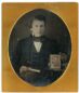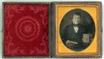 D1027. Sixth-plate daguerreotype of a gentleman. His hand rests on the tinted tablecloth by his side and his other hand hold a book in a vertical position. Resealed, housed in glass, mat, and preserver, no case. VG. $125