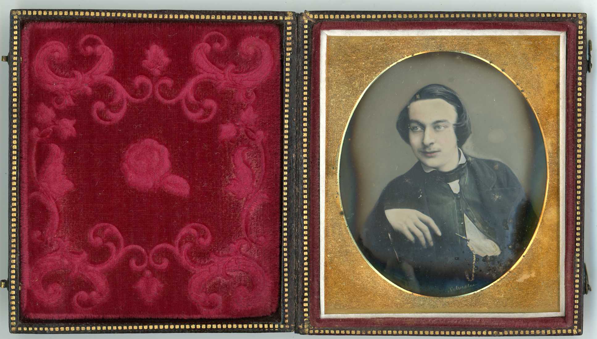 D1313. Sixth-plate tinted daguerreotype with “Silvester” etched in the plate at lower right center. No doubt an actor or mime. Resealed, housed in a full leather case. VG. $850