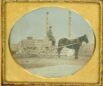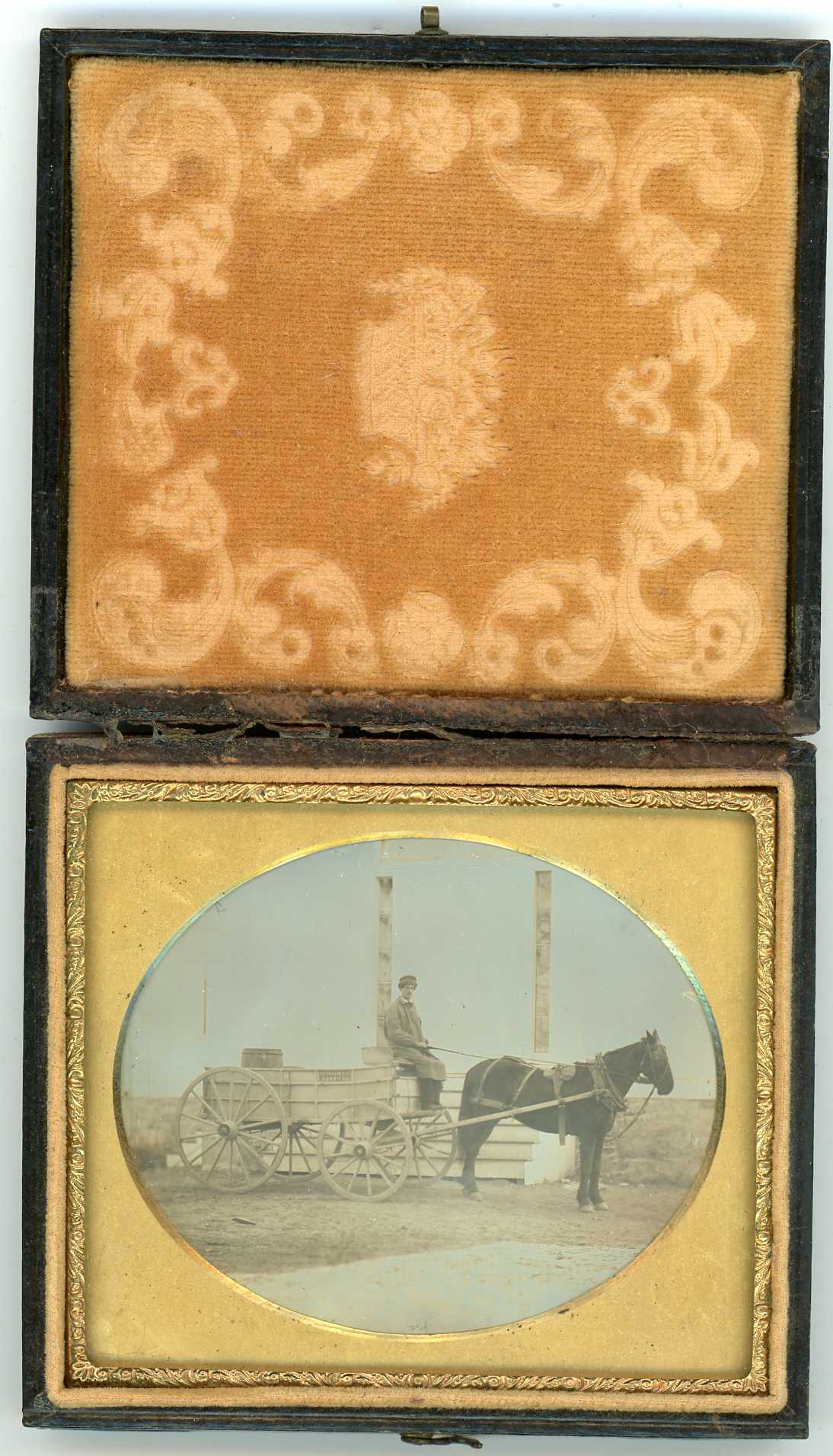 D773. Sixth-plate occupational daguerreotype. The cart reads “D & P Hildreth Beverly.” The 1850 Beverly, Massachusetts census contains the families of Daniel and Paul Hildreth living in the same dwelling. Both were soap chandlers, along with Daniel’s sons George and Daniel. Originally the occupation of chandler made candles and then extended to those who fashioned items used in church offerings, then to those who made soap and to ship’s chandlers who made and sold candles as well as other items to be used on ships. Resealed, housed in a full, split leather case. VG. $3500