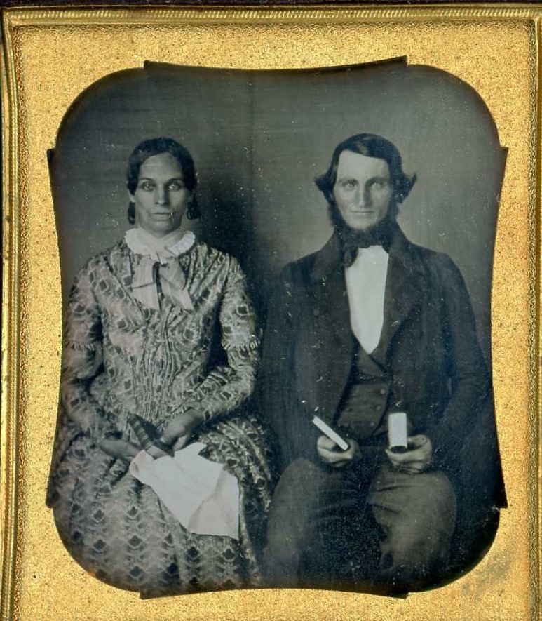 D368. Variant-sized quarter-plate daguerreotype (3 1/2″ x 4″) of a couple housed in a 10 1/2″ x 10″ ogee frame. She is holding a small book. VG. $250