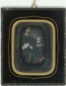 D1001. Sixth-plate post-mortem daguerreotype of a mother holding her infant. The look on her face tells us the child is deceased. Resealed, housed in a full leather case. VG. $300