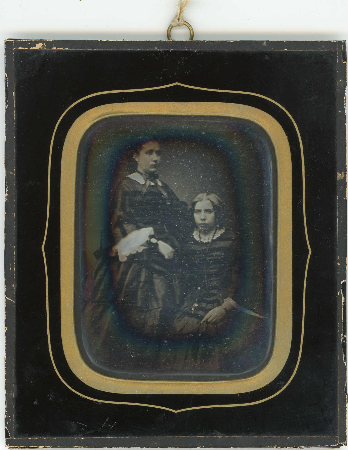 D1223. Sixth-plate daguerreotype of two young women, likely sisters. Resealed, housed in a half leather case. G. $65