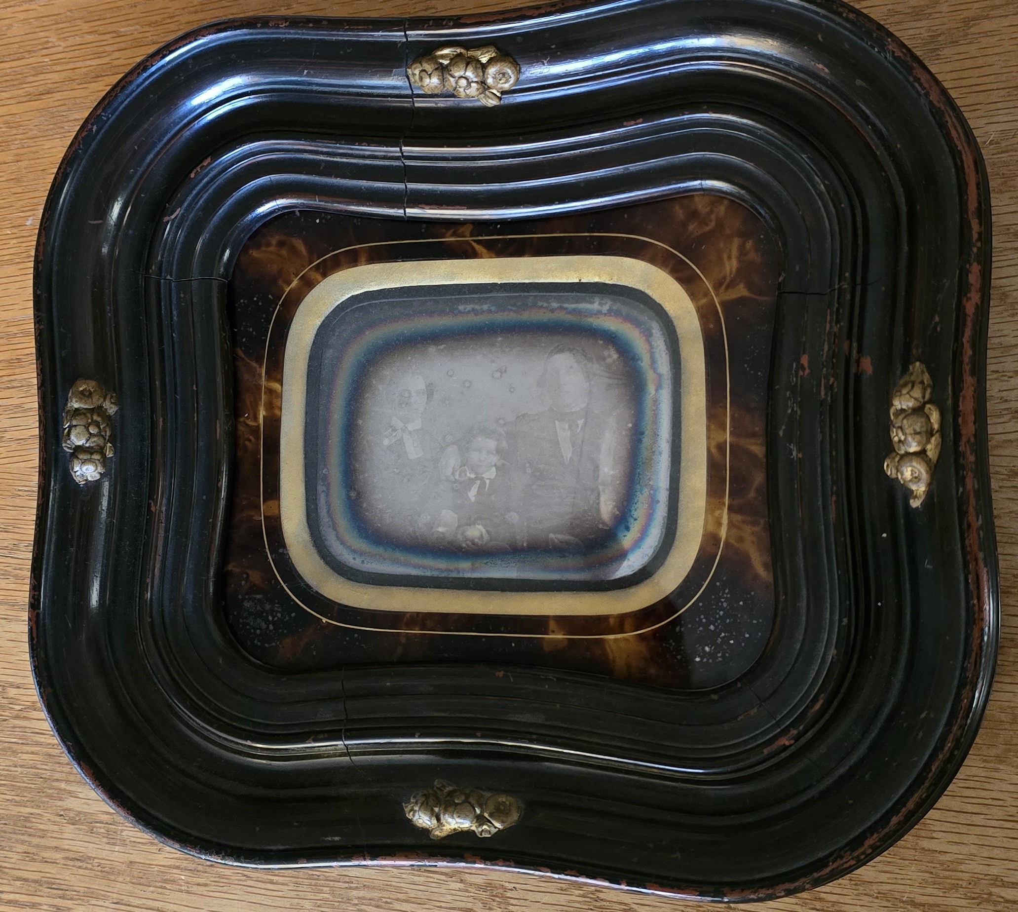 D1320. European daguerreotype of a family. Boy is holding either an apple or a ball. Image opening is 4″ x 3″ and the entire frame is 8″ x 9.” The image is housed in a passe-partout mat and an elaborate thermoplastic frame. The thermoplastic frame has several cracks but is solid. VG. $325