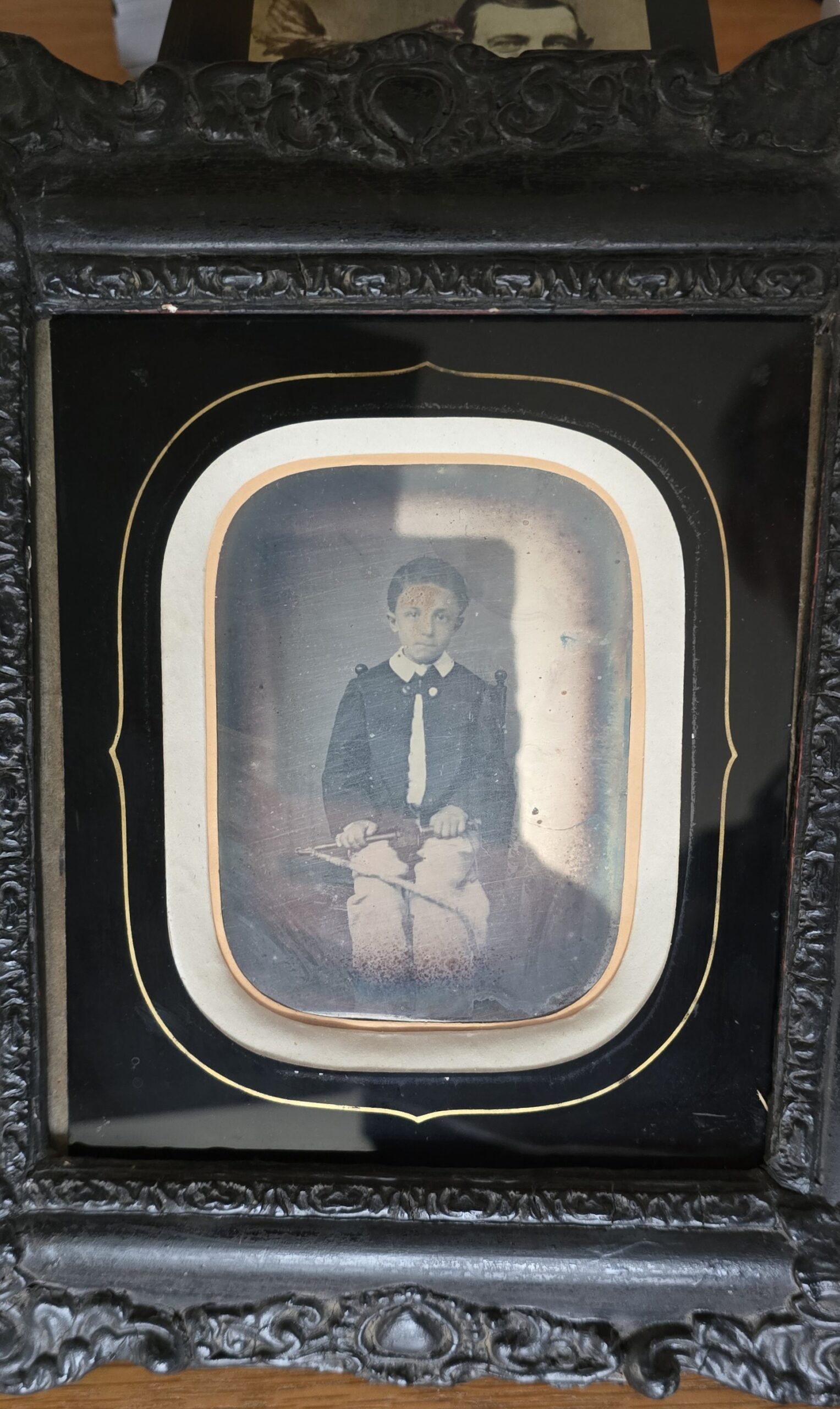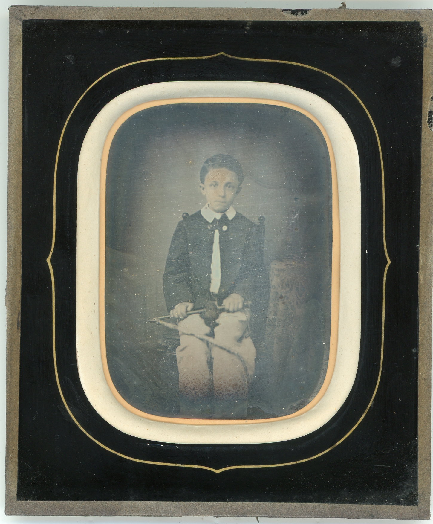 D1321. European daguerreotype of boy with a whip. Image opening measures 3.75″ x 2.75″ and the frame measures 8.5″ x 8.” Image in passe-partout frame inside a wood and thermoplastic frame. VG. $375