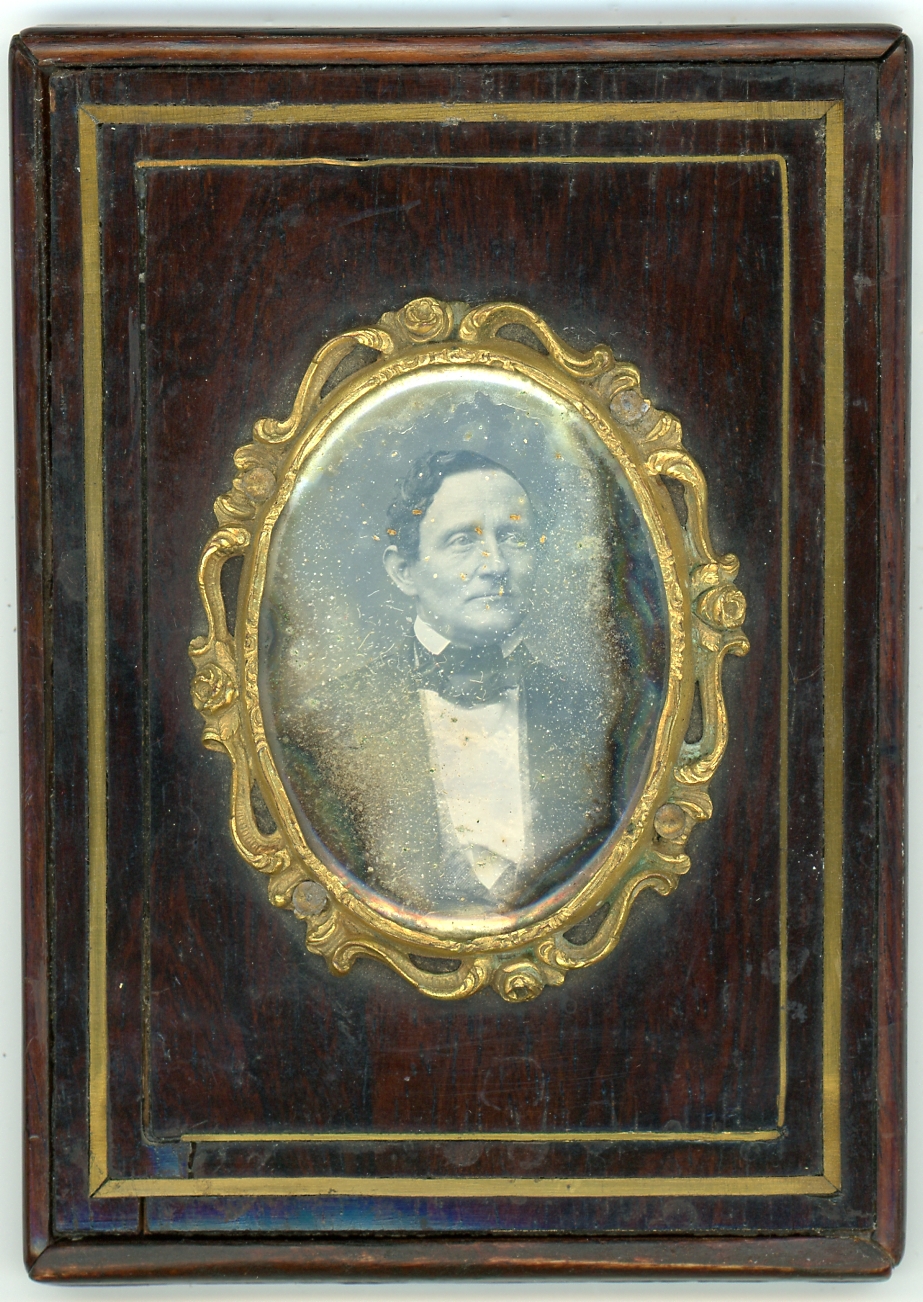 D1242. Ninth-plate “Beard Patentee” daguerreotype. There were a number of such ‘patentees’ in the early 1840’s so the photographer of this image is unknown. On the back of the gilt brass image package is “T. Wharton, No. 791. 24 August 1841,” which is the information indicating that the case design and patent is by Thomas Wharton on that date. All of the daguerreotypes made after August 1841 throughout Beard’s commercial empire appear in these Wharton gilt brass (sometimes copper) pinchbeck cases, or pans stamped with the oval design. The case is intact but the cover of the case and the bottom of the case rails are separated at top when opened. G. $450