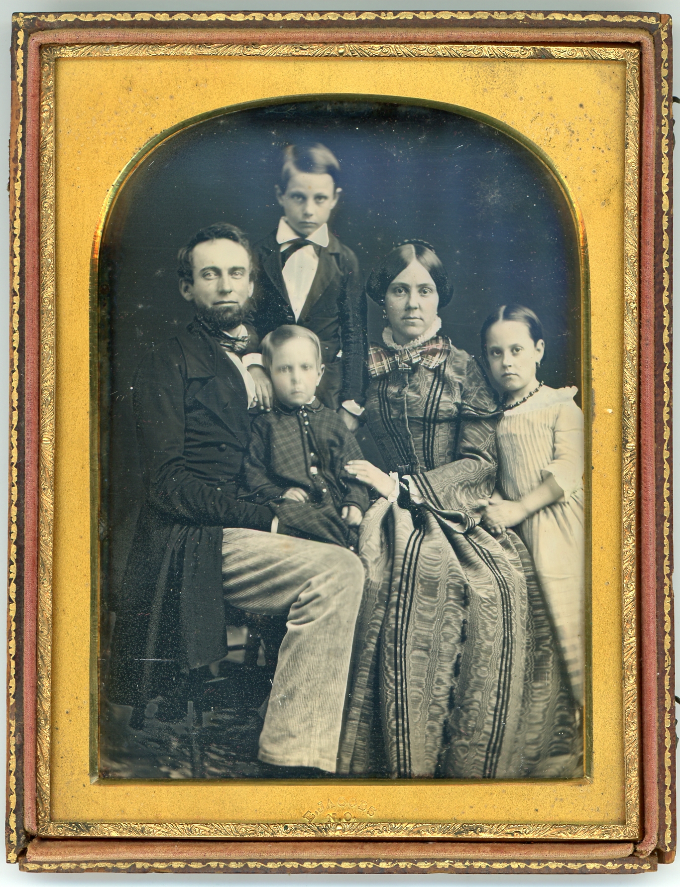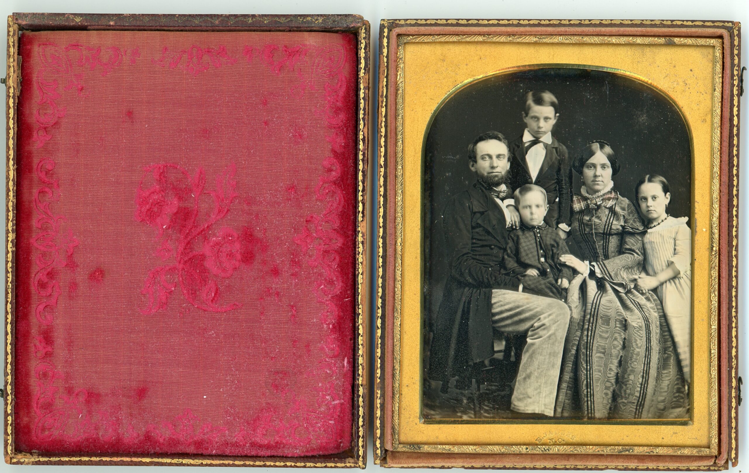 D1322. E. Jacobs, New Orleans. Half-plate daguerreotype of a family of five. Jacobs operated in N.O. from 1844-1861. Resealed, housed in a full, split leather case. The case has a repaired slat. The red velvet cushion is shedding some red dust. VG. $850