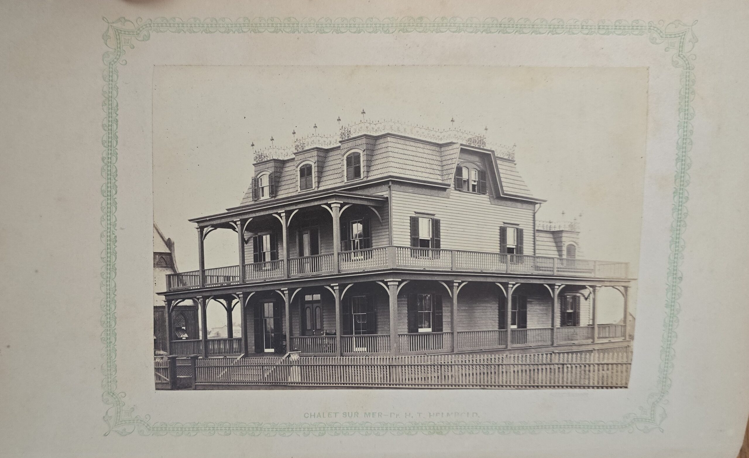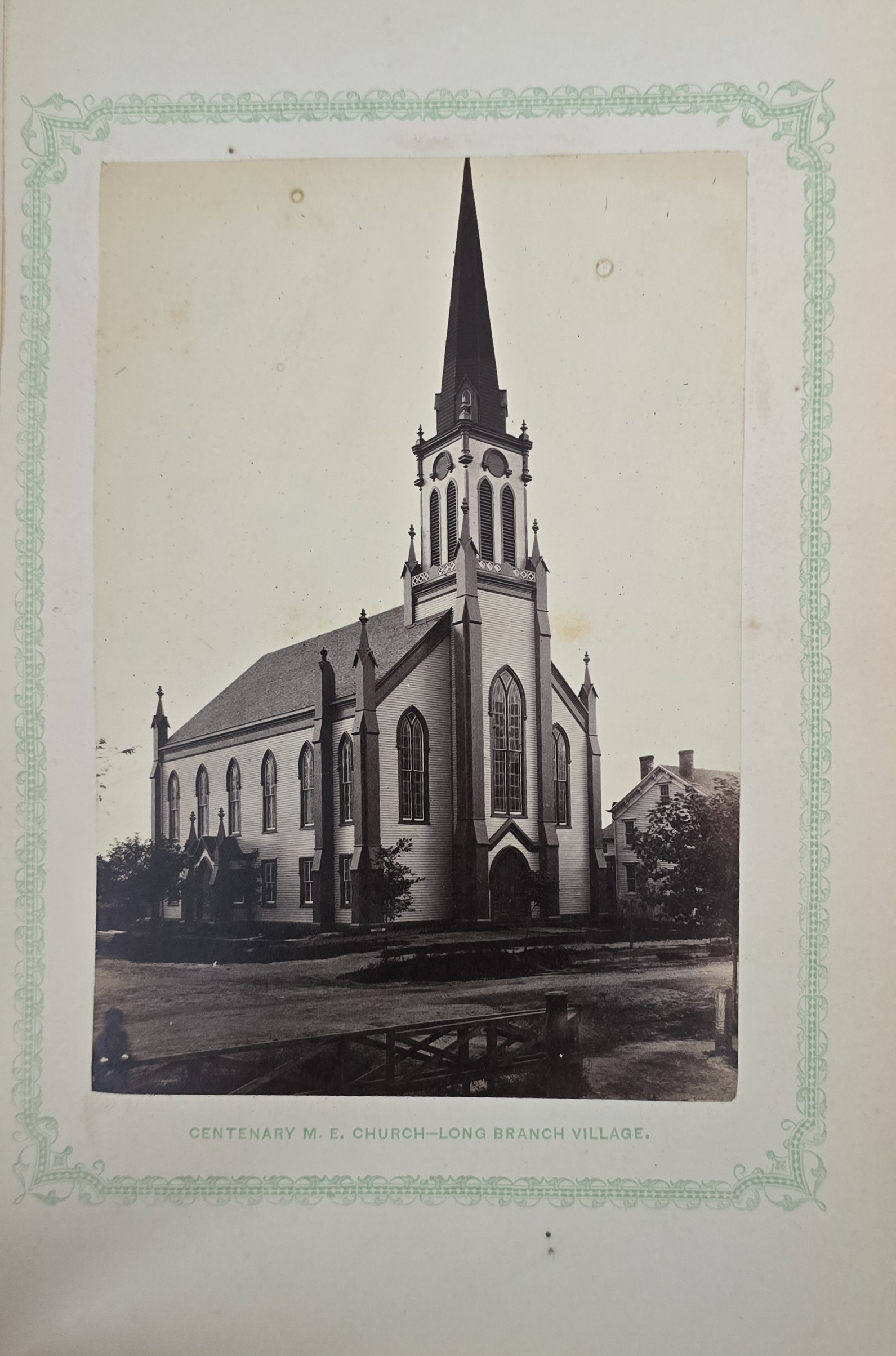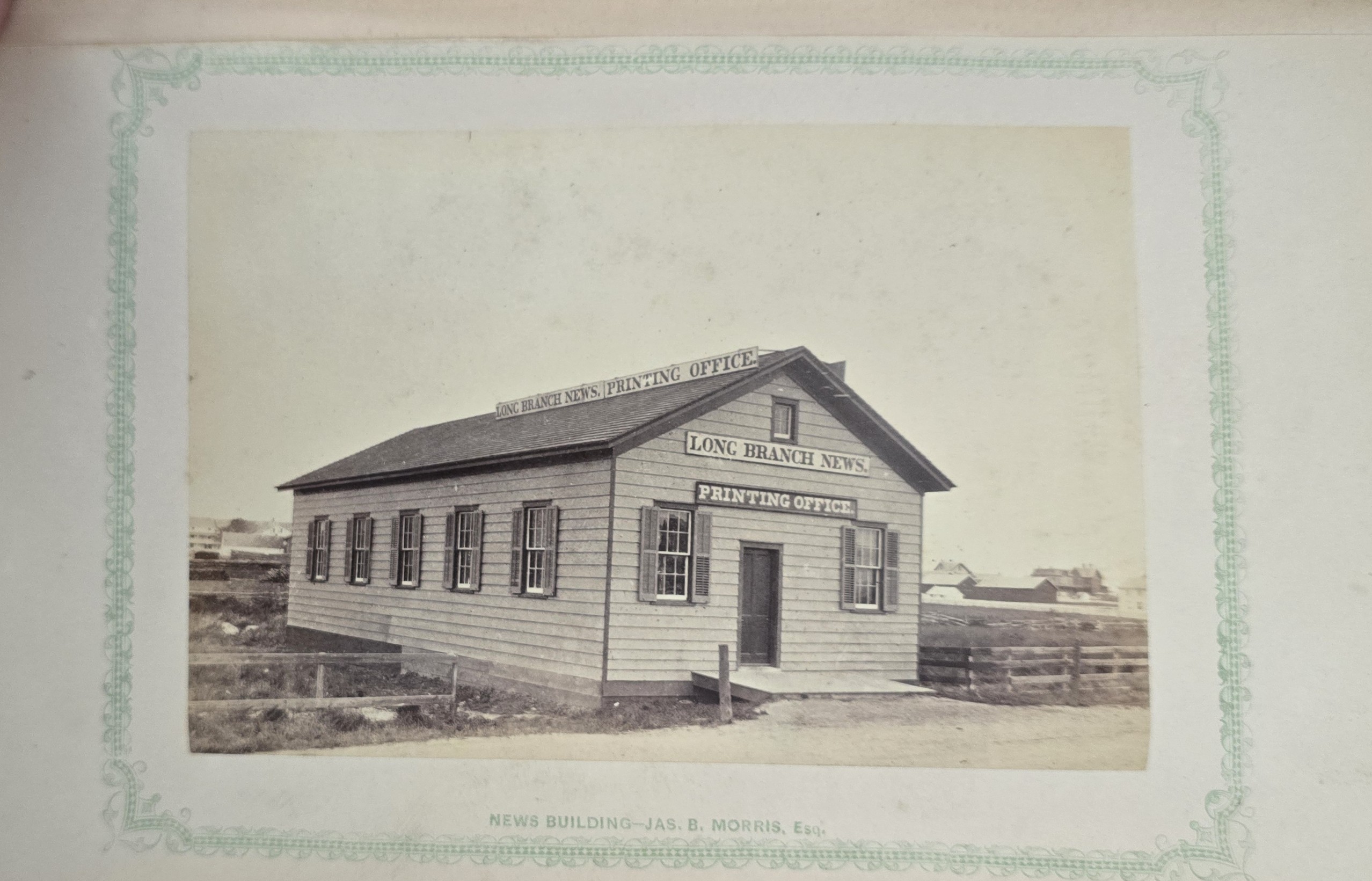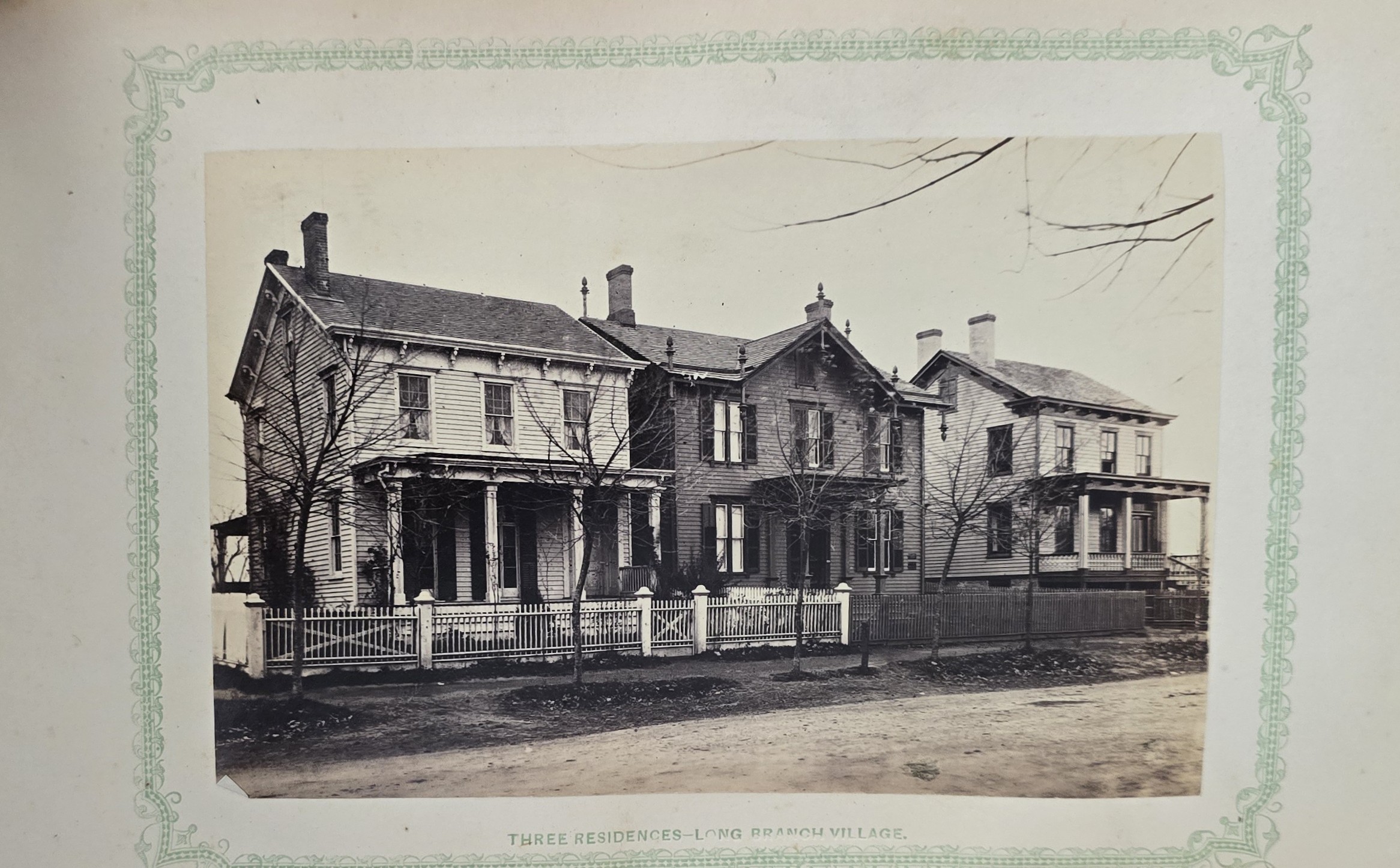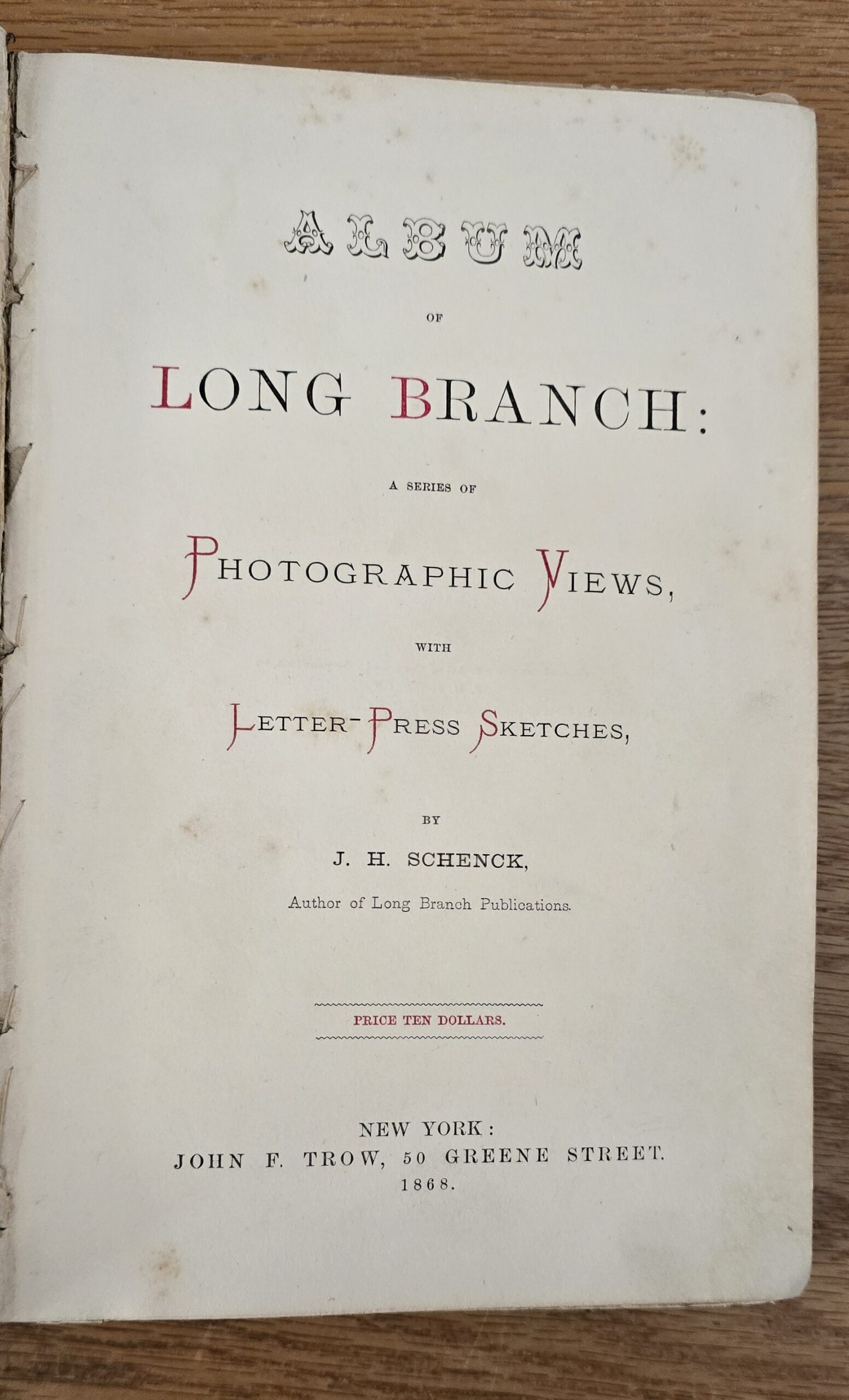 Schenck, J.H. Album of Long Branch: a Series of Photographic Views, with Letter-Press Sketches. New York: John F. Trow, 1868. First edition of this rare photographic book with 74 (of 78) albumen photos of homes and buildings of this beautiful Victorian sea-side community. Octavo. 161, [1, blank] pages. Title-page printed in red and black. With thirty-seven (of thirty-nine) inserted leaves of two albumen photographs each, all reckoned within pagination. Publisher’s full green cloth over beveled boards, covers decoratively ruled and stamped in blind, front cover and spine lettered in gilt. Binding worn and soiled, text shaken with several loose pages (some of which are torn and otherwise damaged), lacking mounted photographic leaves (pages 11/12 and 143/144), as well as text leaf 145/146. Still, a fair copy of this very rare and lovely book.