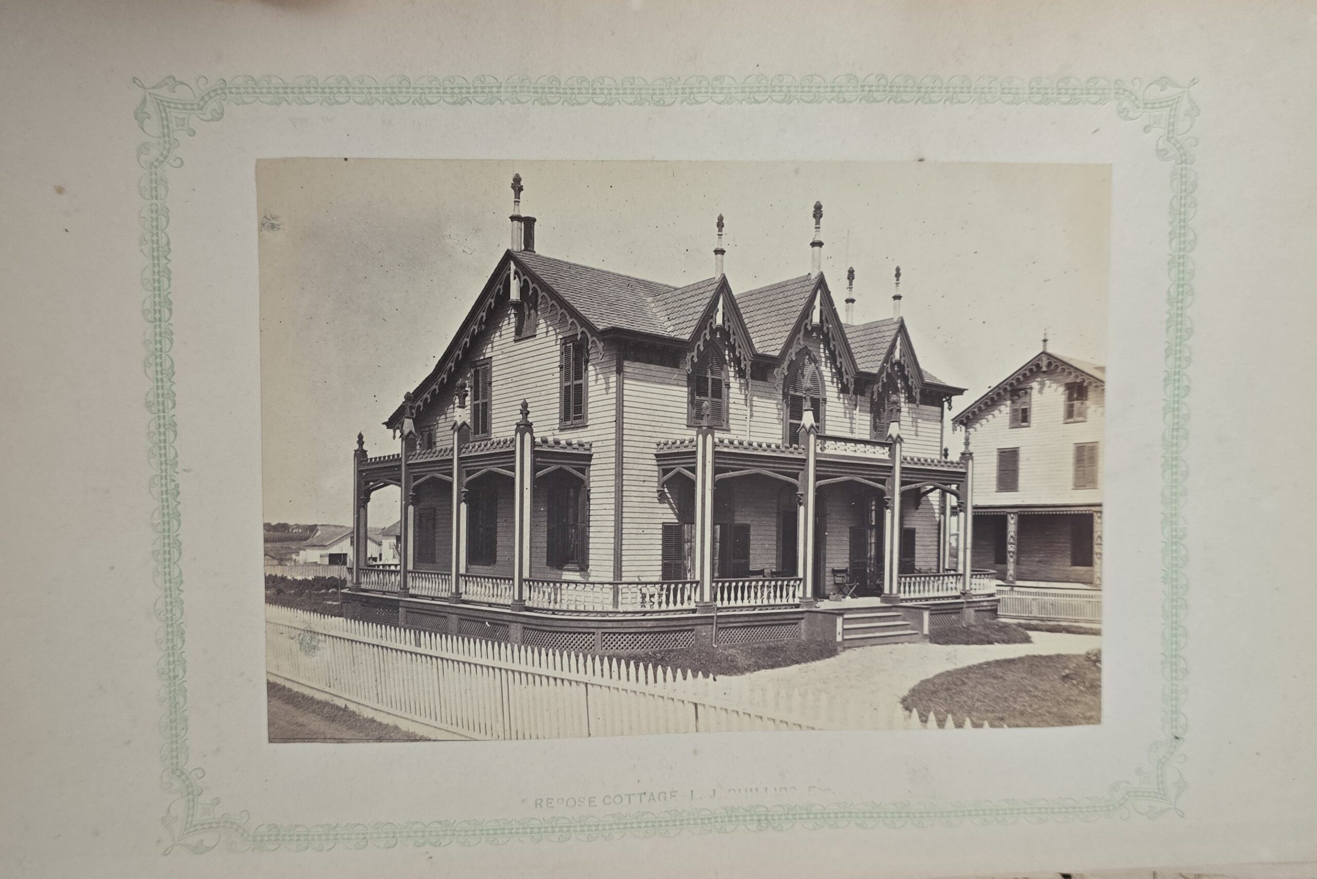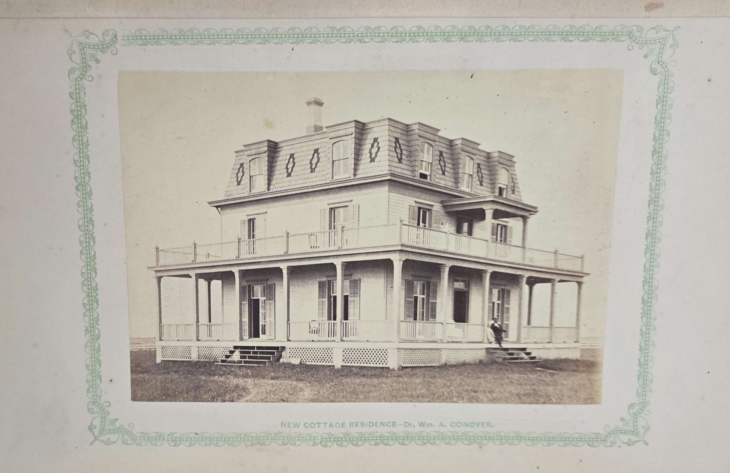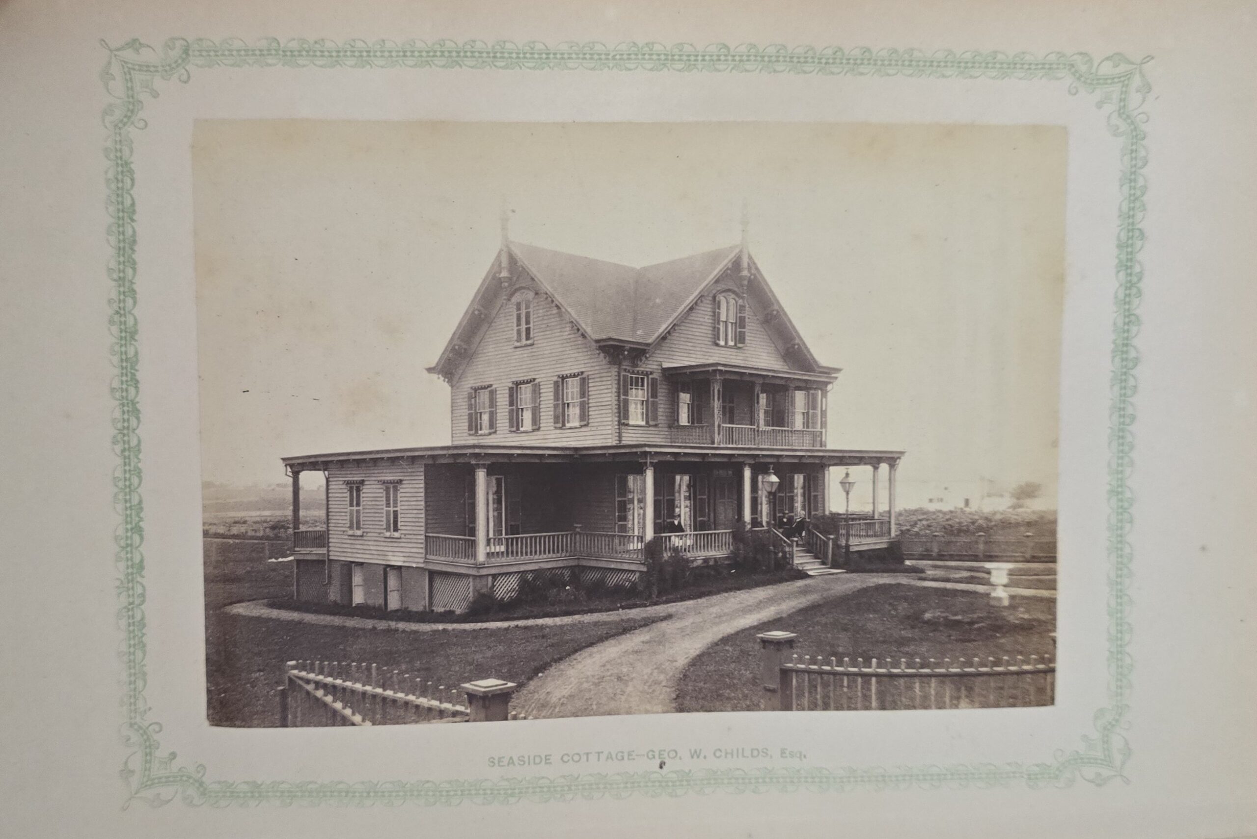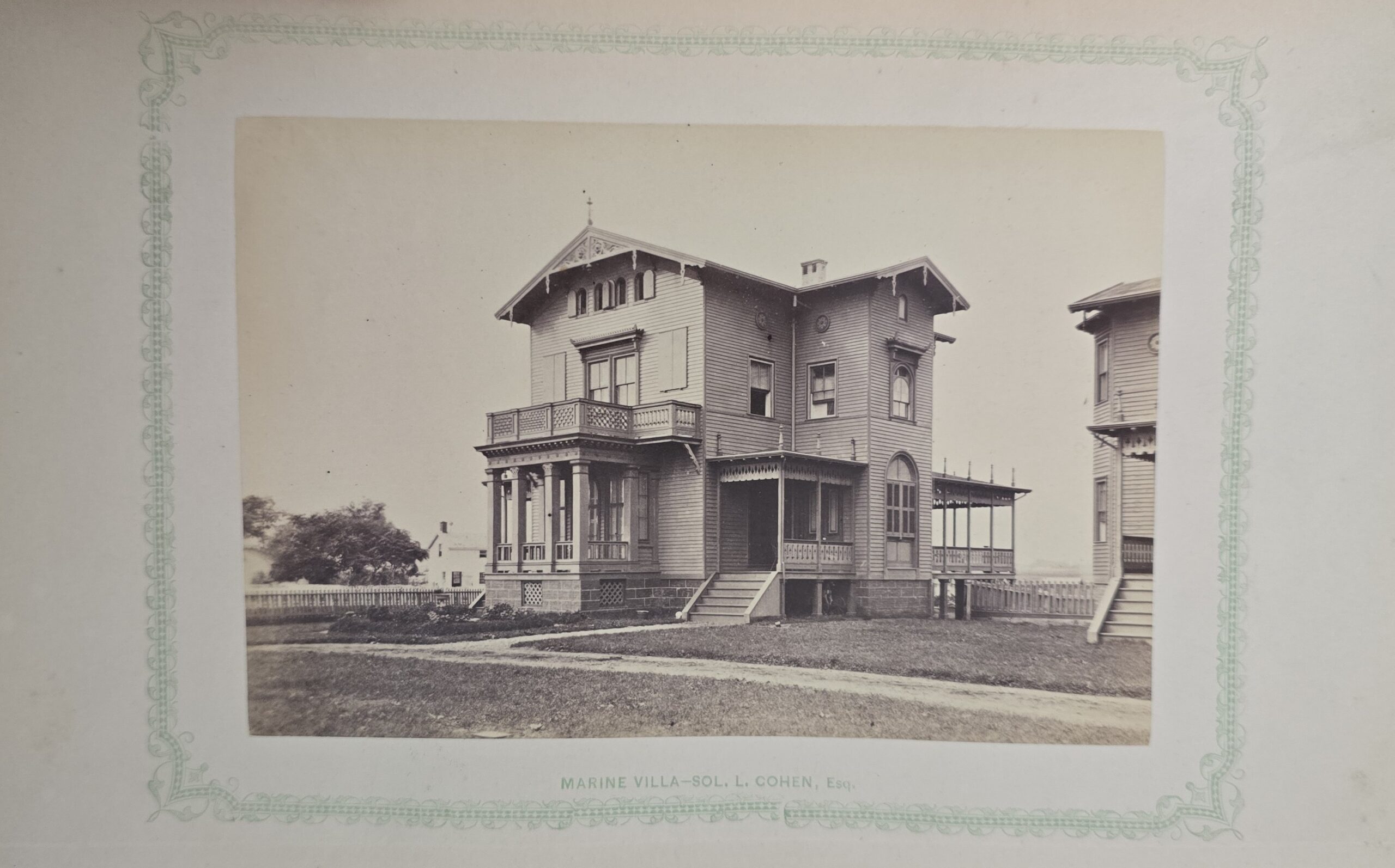 Schenck, J.H. Album of Long Branch: a Series of Photographic Views, with Letter-Press Sketches. New York: John F. Trow, 1868. First edition of this rare photographic book with 74 (of 78) albumen photos of homes and buildings of this beautiful Victorian sea-side community. Octavo. 161, [1, blank] pages. Title-page printed in red and black. With thirty-seven (of thirty-nine) inserted leaves of two albumen photographs each, all reckoned within pagination. Publisher’s full green cloth over beveled boards, covers decoratively ruled and stamped in blind, front cover and spine lettered in gilt. Binding worn and soiled, text shaken with several loose pages (some of which are torn and otherwise damaged), lacking mounted photographic leaves (pages 11/12 and 143/144), as well as text leaf 145/146. Still, a fair copy of this very rare and lovely book.