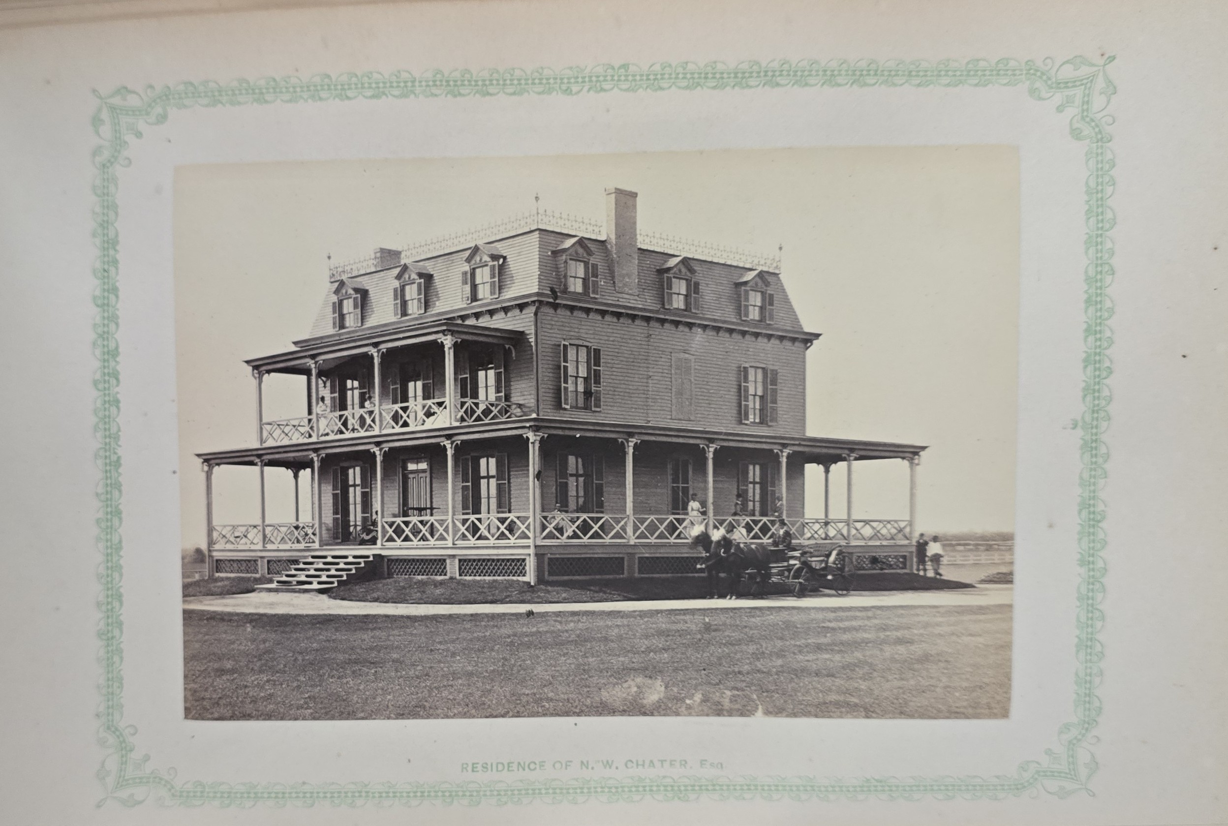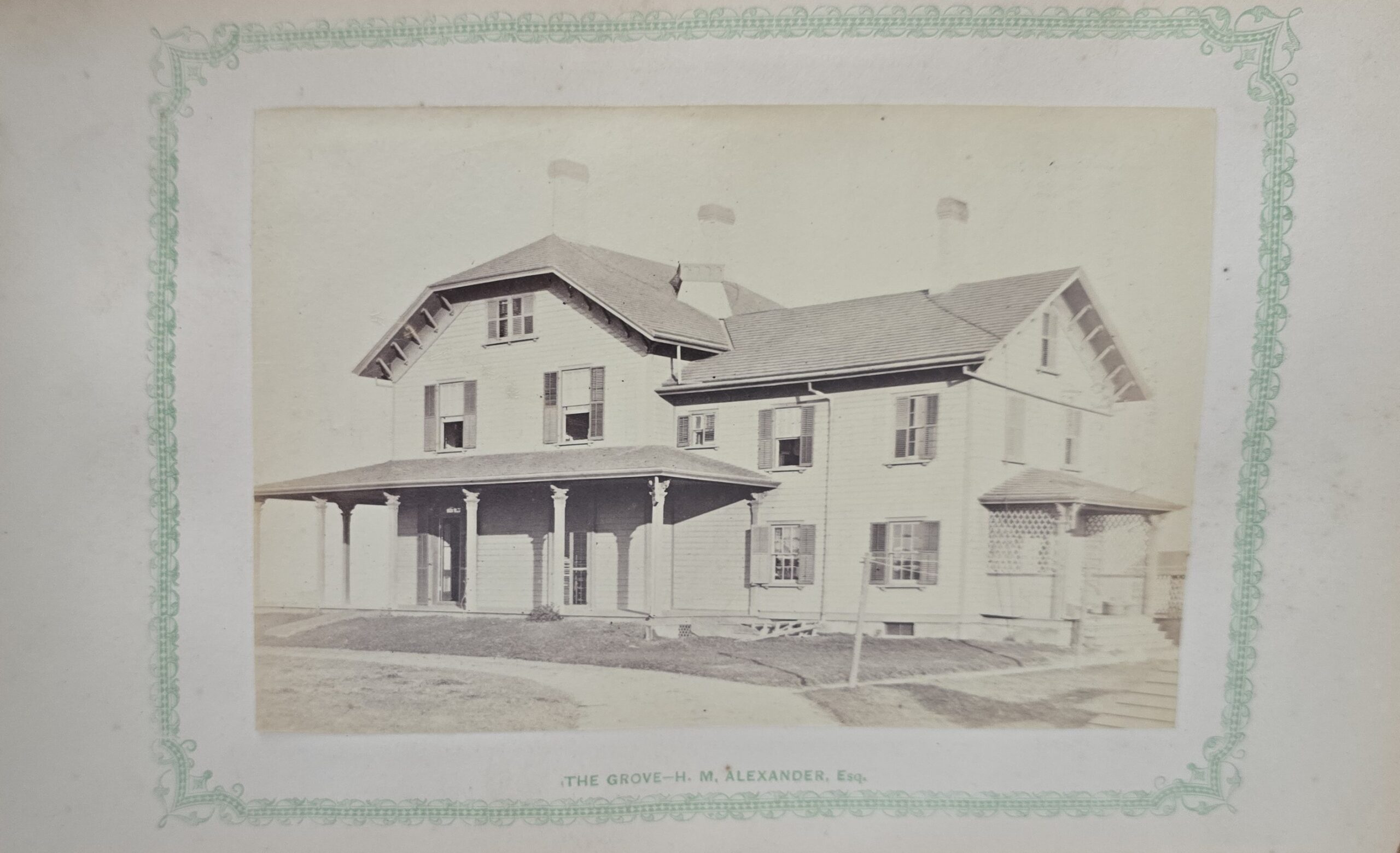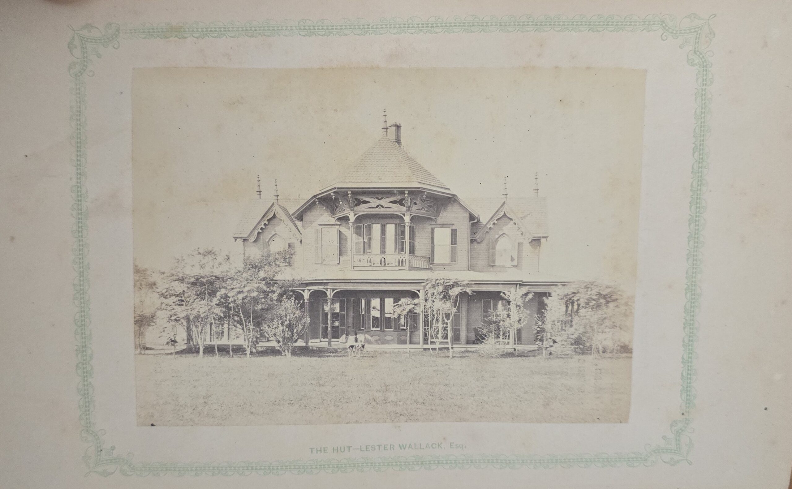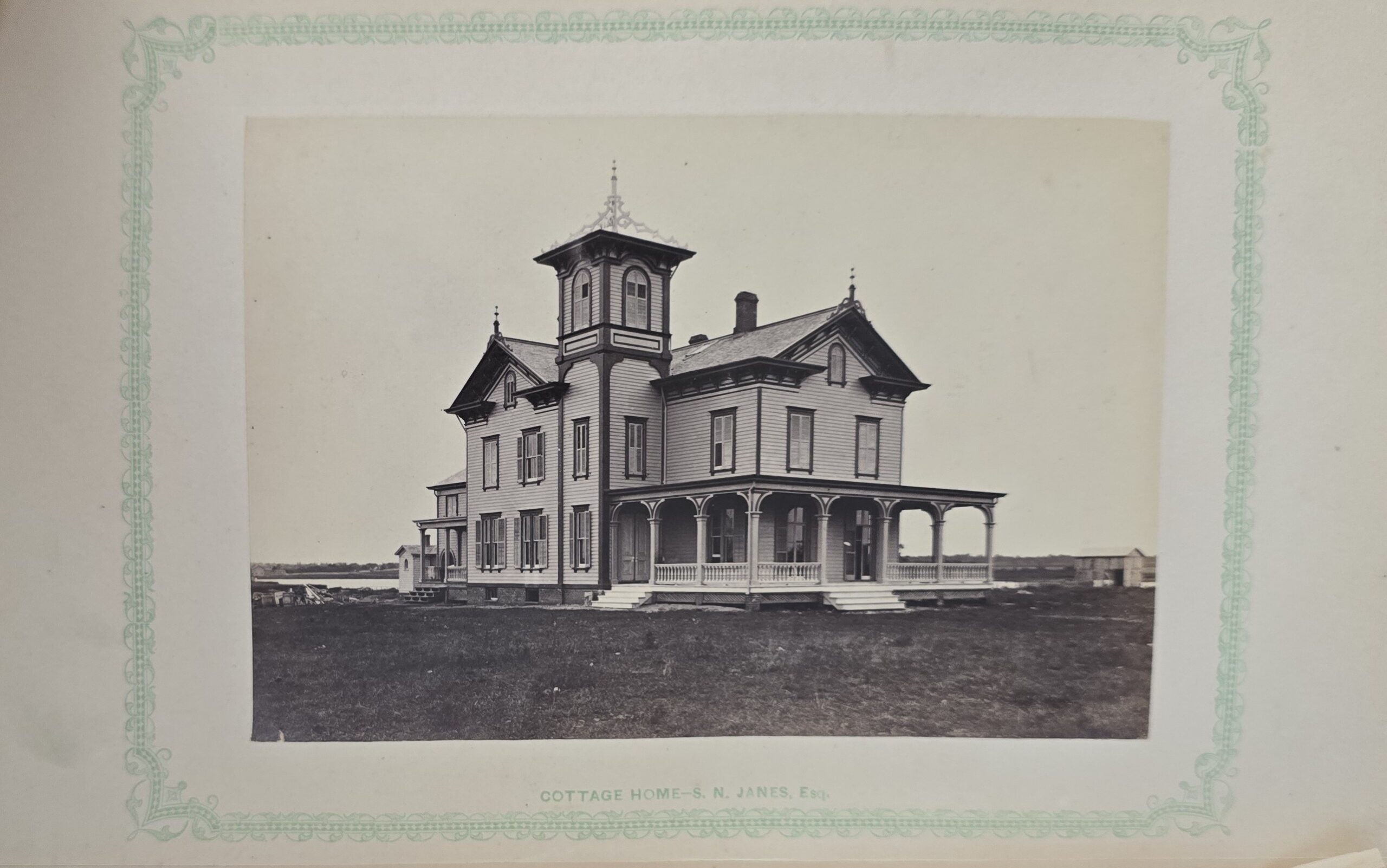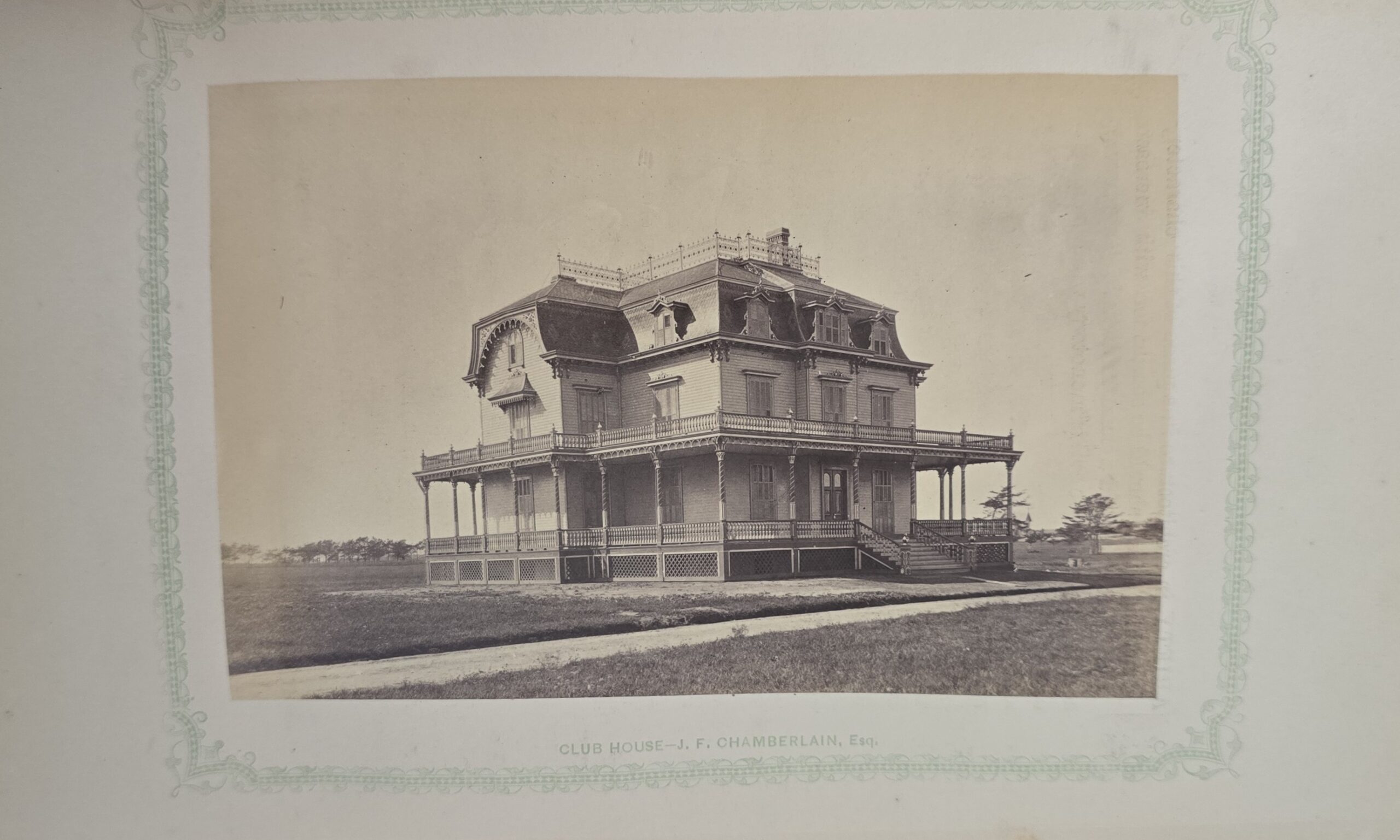 Schenck, J.H. Album of Long Branch: a Series of Photographic Views, with Letter-Press Sketches. New York: John F. Trow, 1868. First edition of this rare photographic book with 74 (of 78) albumen photos of homes and buildings of this beautiful Victorian sea-side community. Octavo. 161, [1, blank] pages. Title-page printed in red and black. With thirty-seven (of thirty-nine) inserted leaves of two albumen photographs each, all reckoned within pagination. Publisher’s full green cloth over beveled boards, covers decoratively ruled and stamped in blind, front cover and spine lettered in gilt. Binding worn and soiled, text shaken with several loose pages (some of which are torn and otherwise damaged), lacking mounted photographic leaves (pages 11/12 and 143/144), as well as text leaf 145/146. Still, a fair copy of this very rare and lovely book.