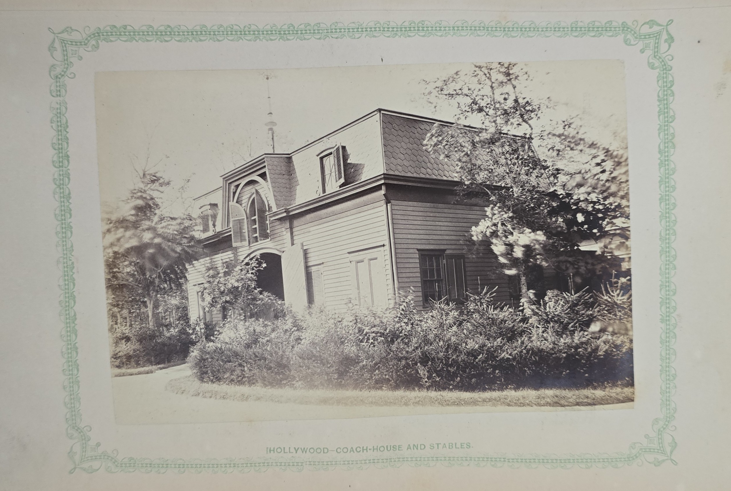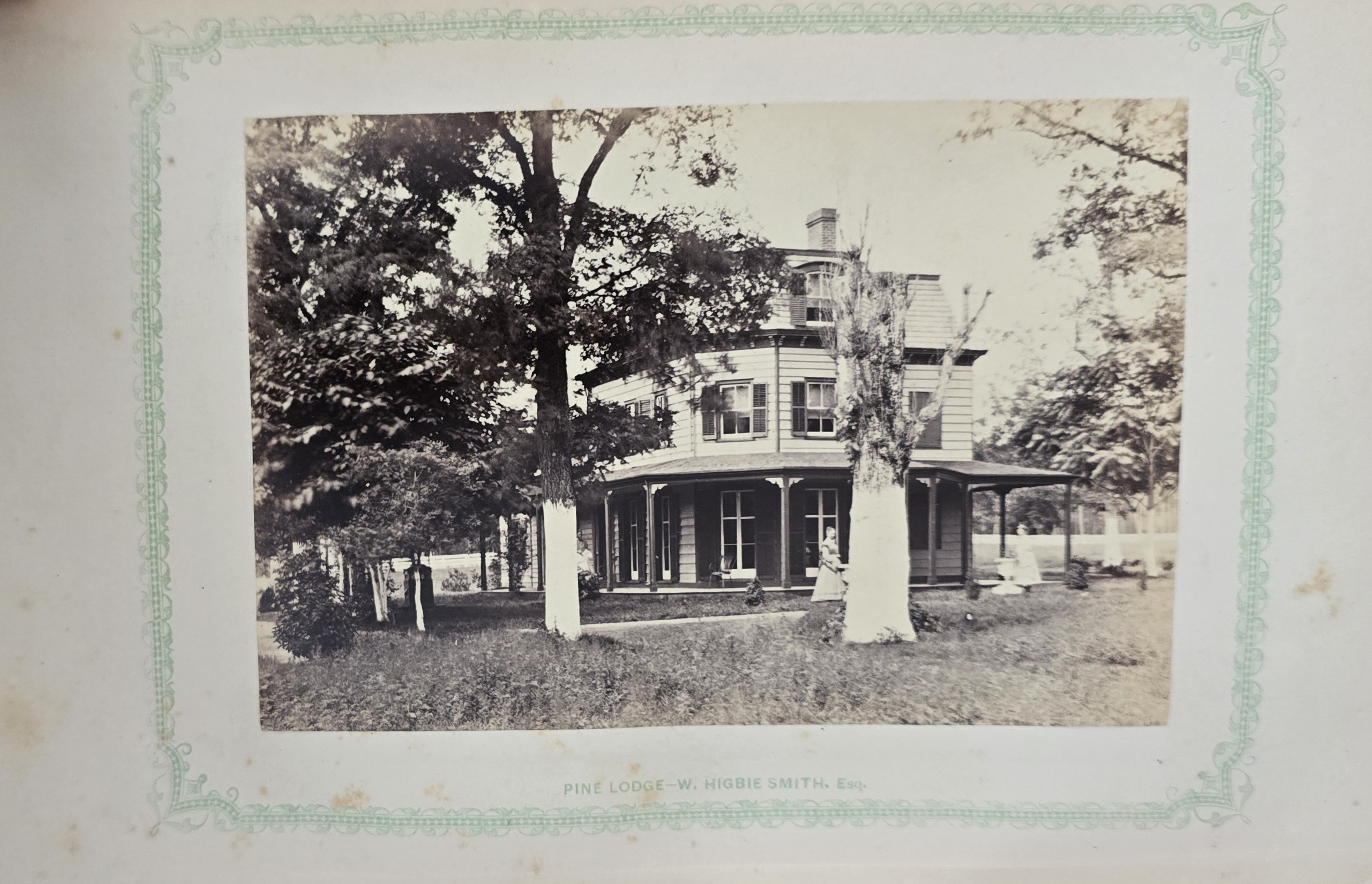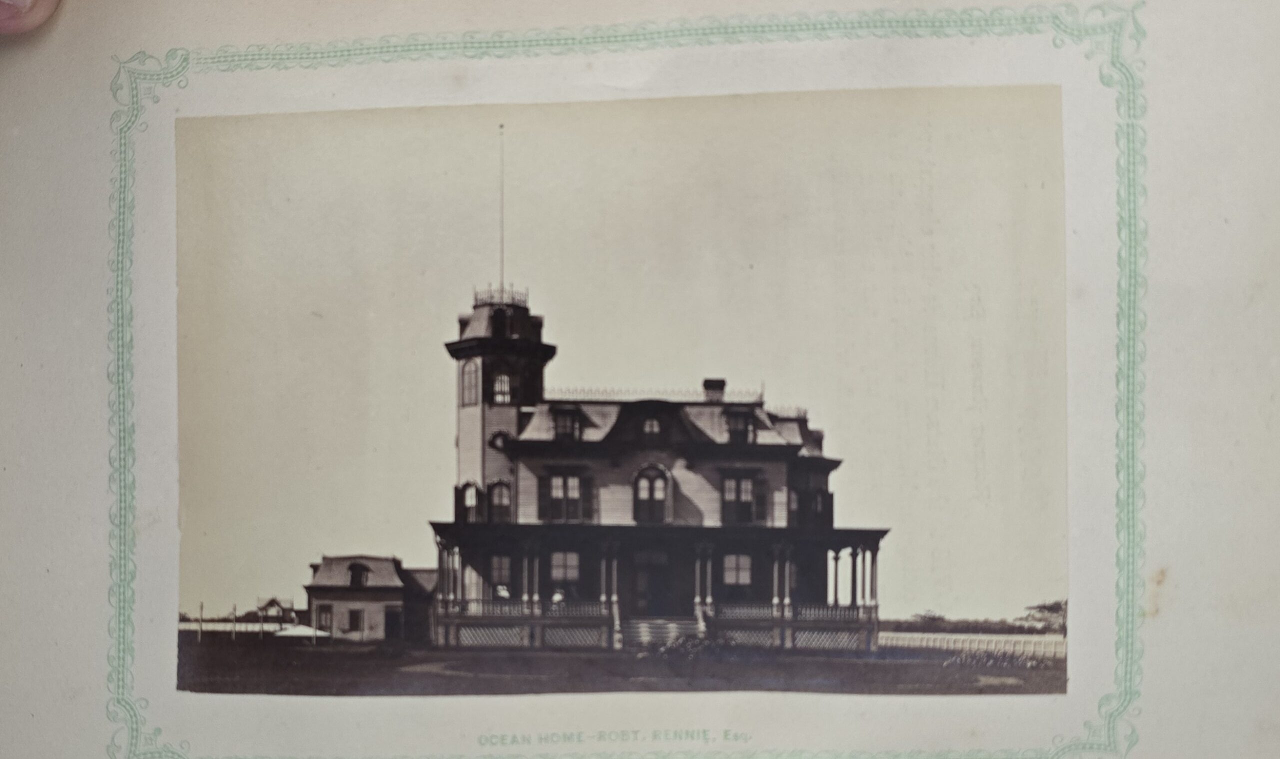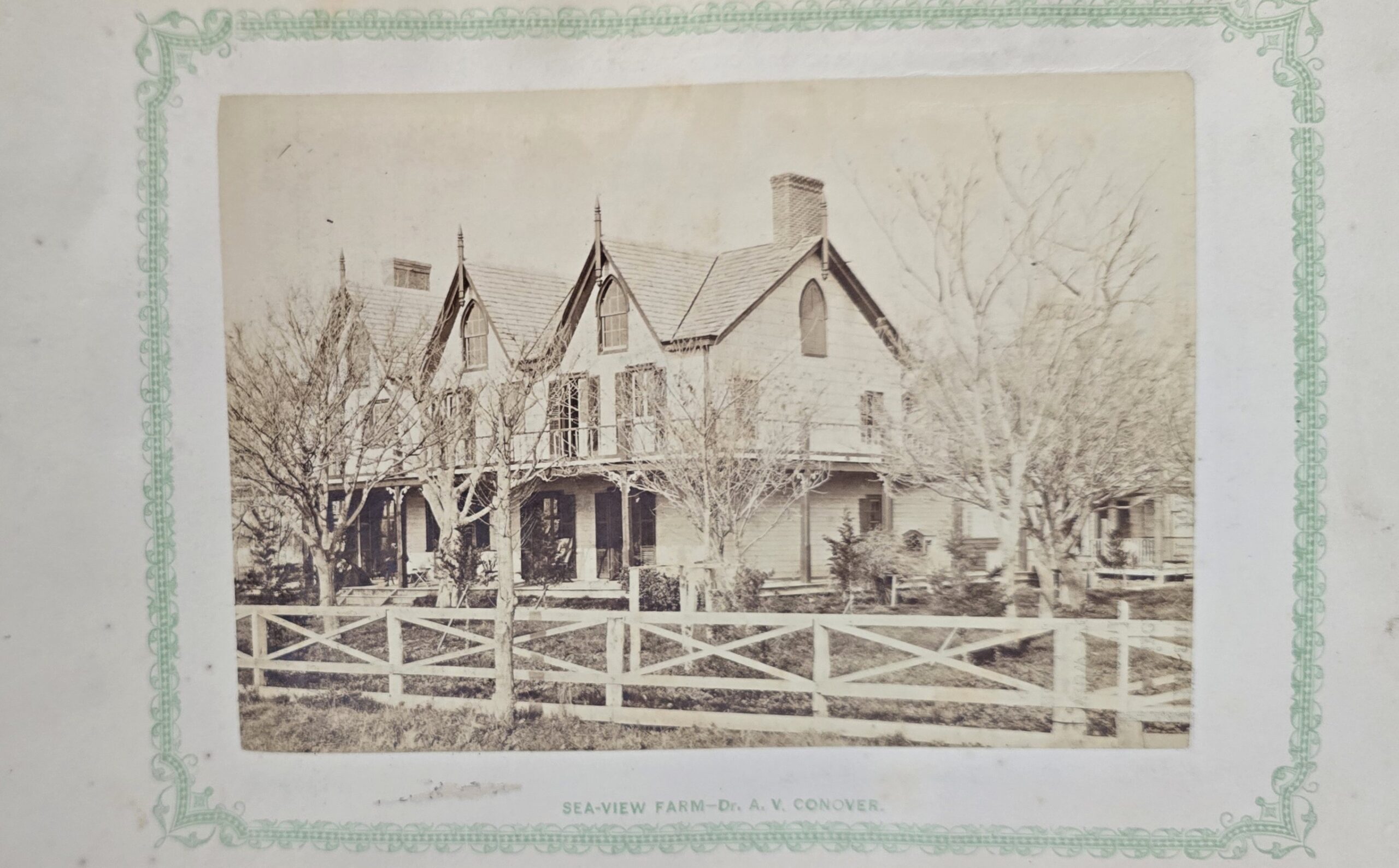 Schenck, J.H. Album of Long Branch: a Series of Photographic Views, with Letter-Press Sketches. New York: John F. Trow, 1868. First edition of this rare photographic book with 74 (of 78) albumen photos of homes and buildings of this beautiful Victorian sea-side community. Octavo. 161, [1, blank] pages. Title-page printed in red and black. With thirty-seven (of thirty-nine) inserted leaves of two albumen photographs each, all reckoned within pagination. Publisher’s full green cloth over beveled boards, covers decoratively ruled and stamped in blind, front cover and spine lettered in gilt. Binding worn and soiled, text shaken with several loose pages (some of which are torn and otherwise damaged), lacking mounted photographic leaves (pages 11/12 and 143/144), as well as text leaf 145/146. Still, a fair copy of this very rare and lovely book.