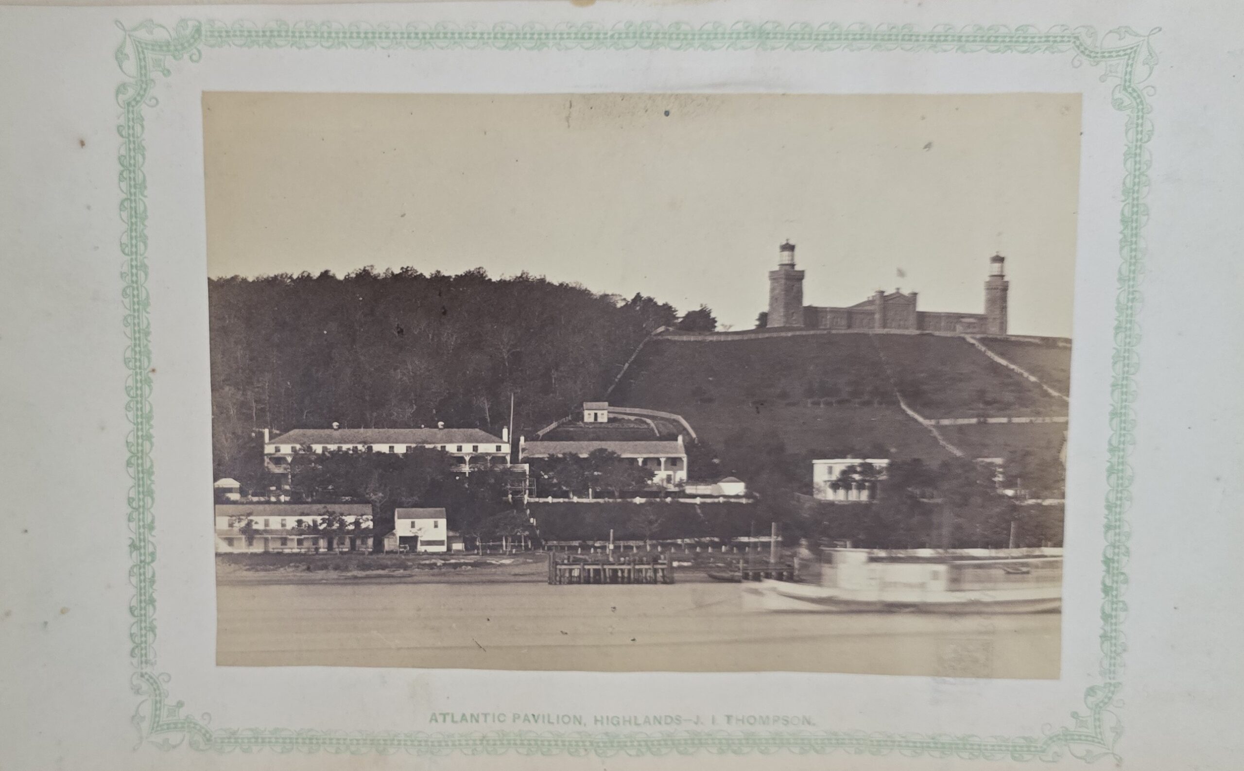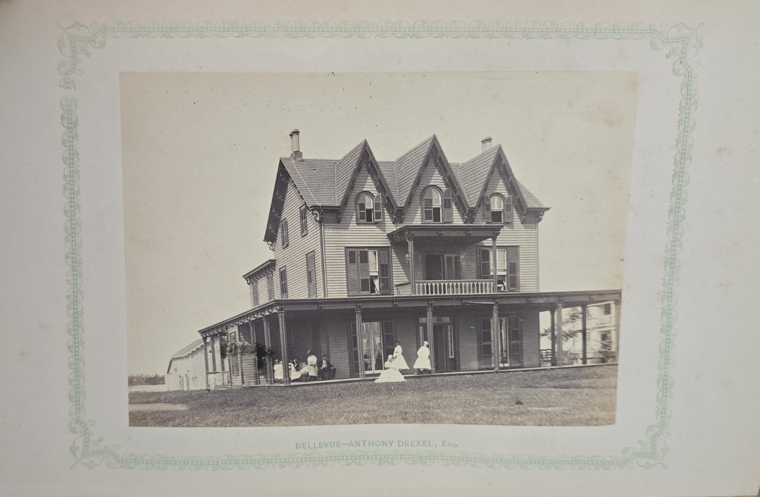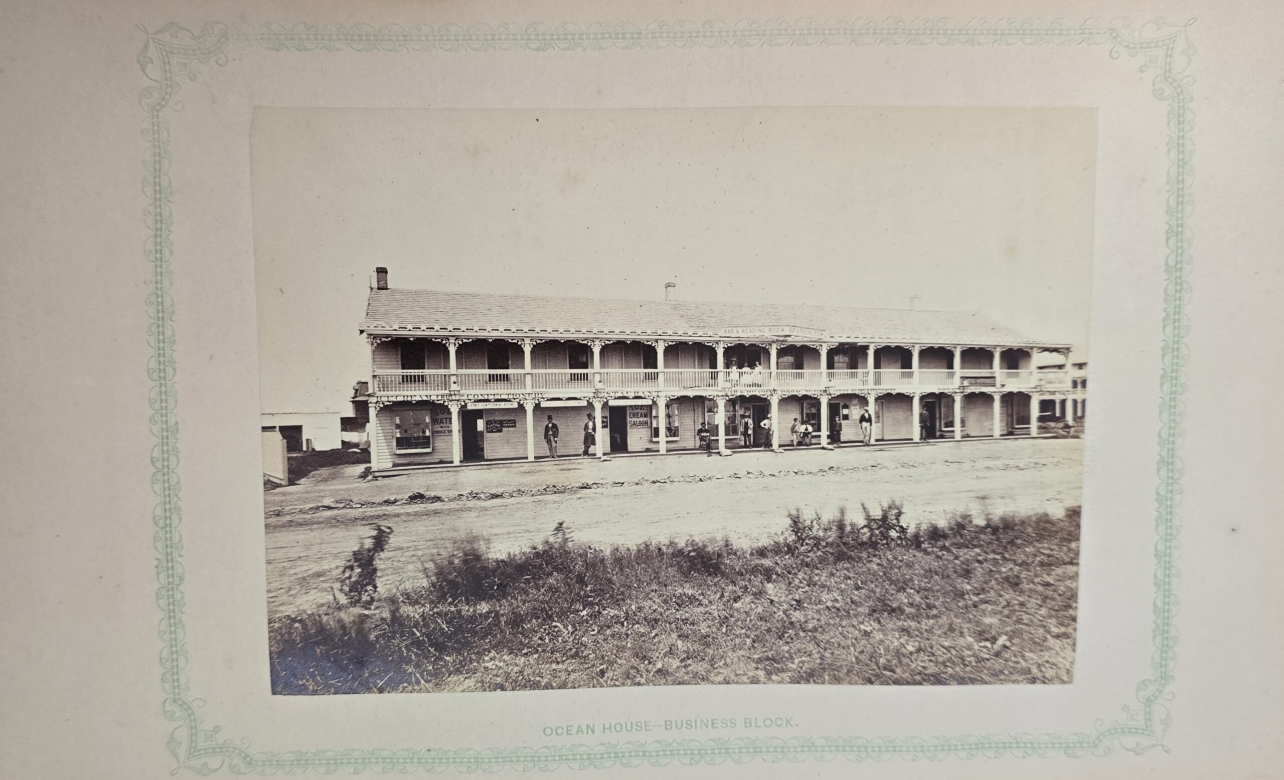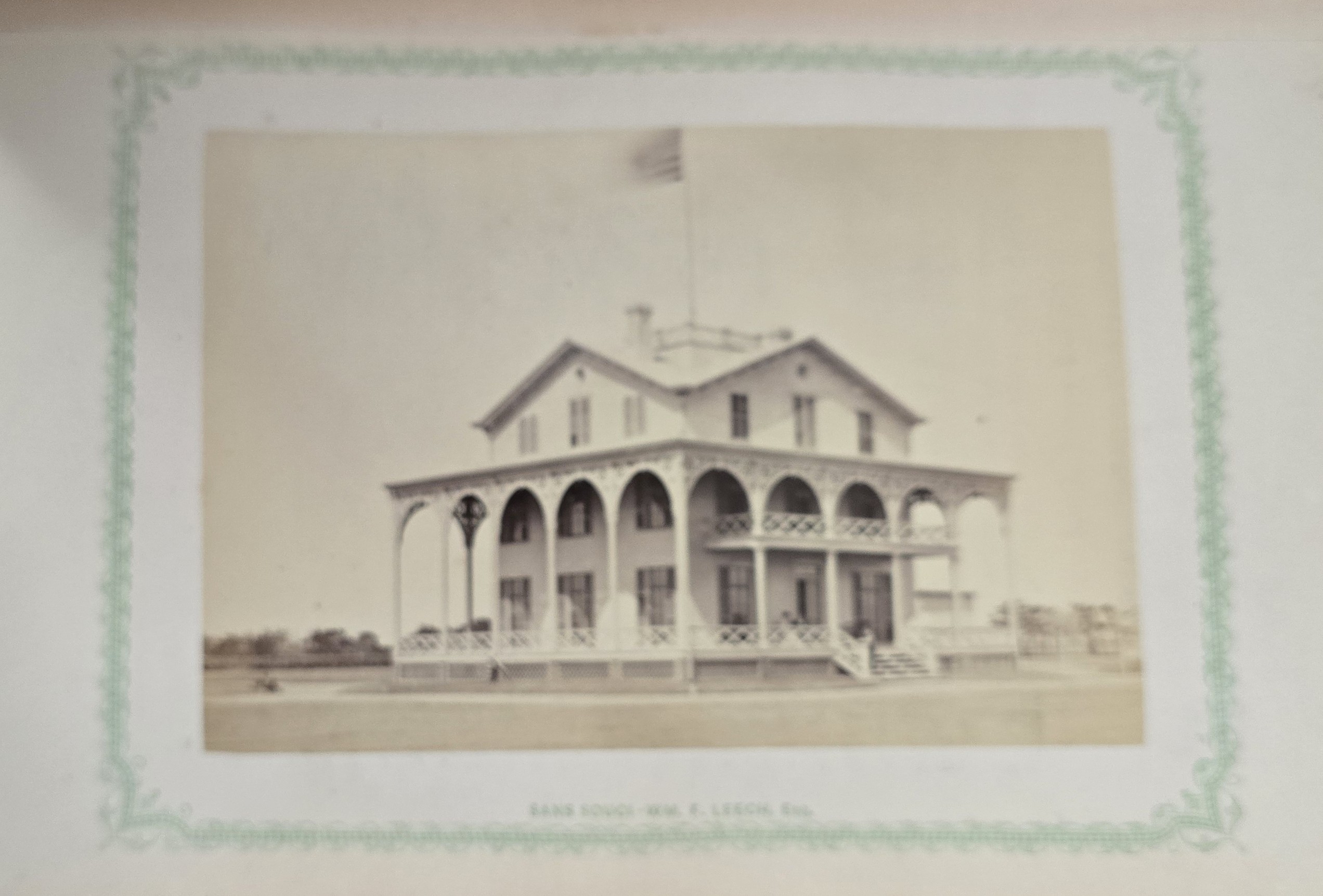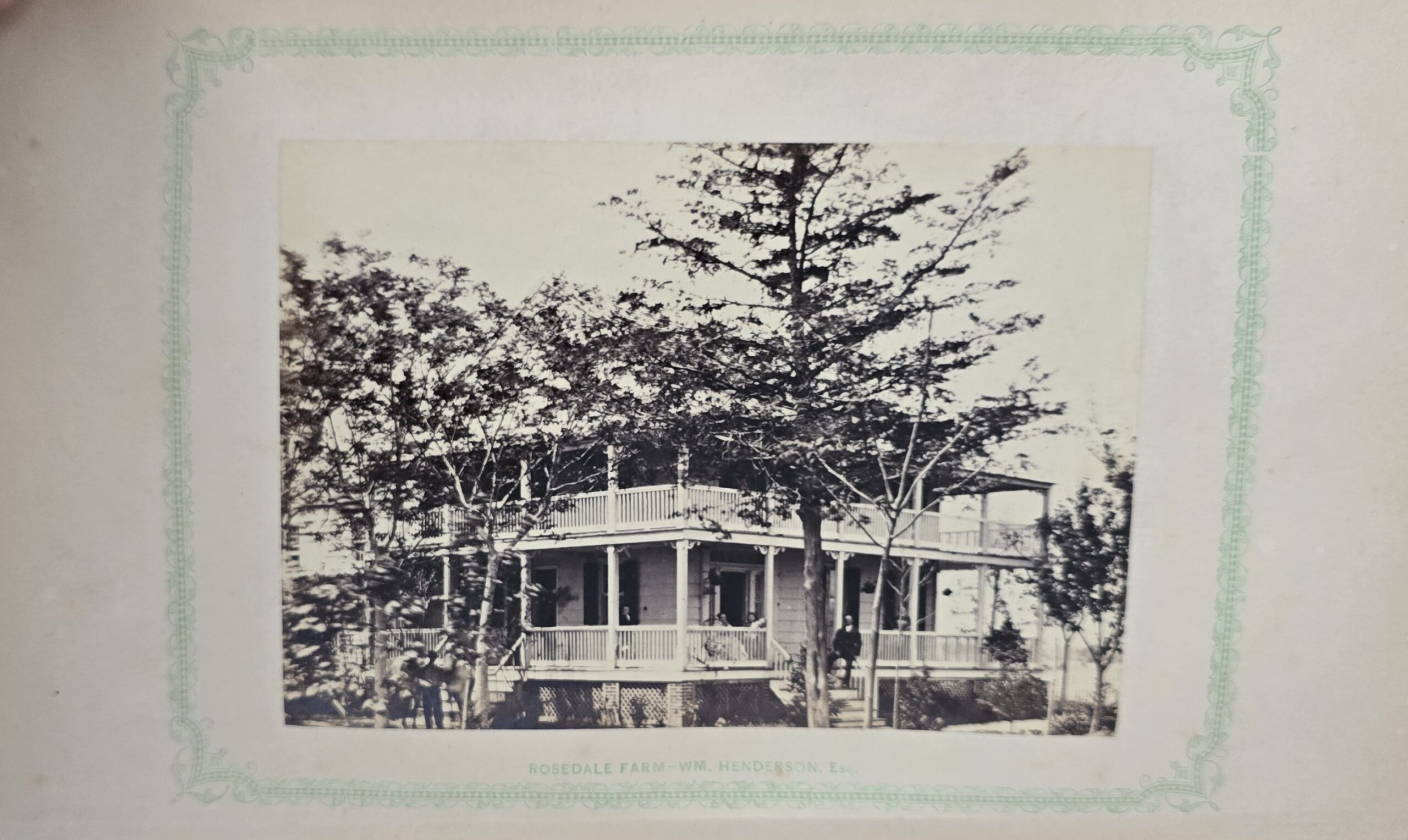 Schenck, J.H. Album of Long Branch: a Series of Photographic Views, with Letter-Press Sketches. New York: John F. Trow, 1868. First edition of this rare photographic book with 74 (of 78) albumen photos of homes and buildings of this beautiful Victorian sea-side community. Octavo. 161, [1, blank] pages. Title-page printed in red and black. With thirty-seven (of thirty-nine) inserted leaves of two albumen photographs each, all reckoned within pagination. Publisher’s full green cloth over beveled boards, covers decoratively ruled and stamped in blind, front cover and spine lettered in gilt. Binding worn and soiled, text shaken with several loose pages (some of which are torn and otherwise damaged), lacking mounted photographic leaves (pages 11/12 and 143/144), as well as text leaf 145/146. Still, a fair copy of this very rare and lovely book.