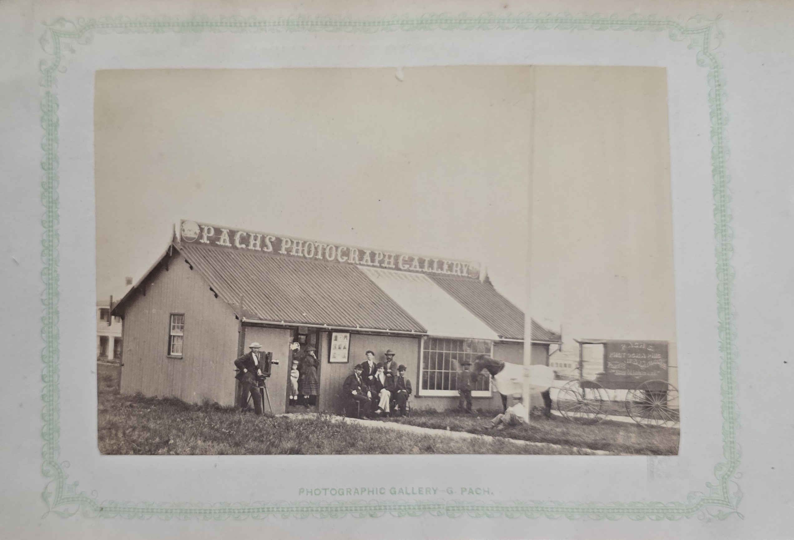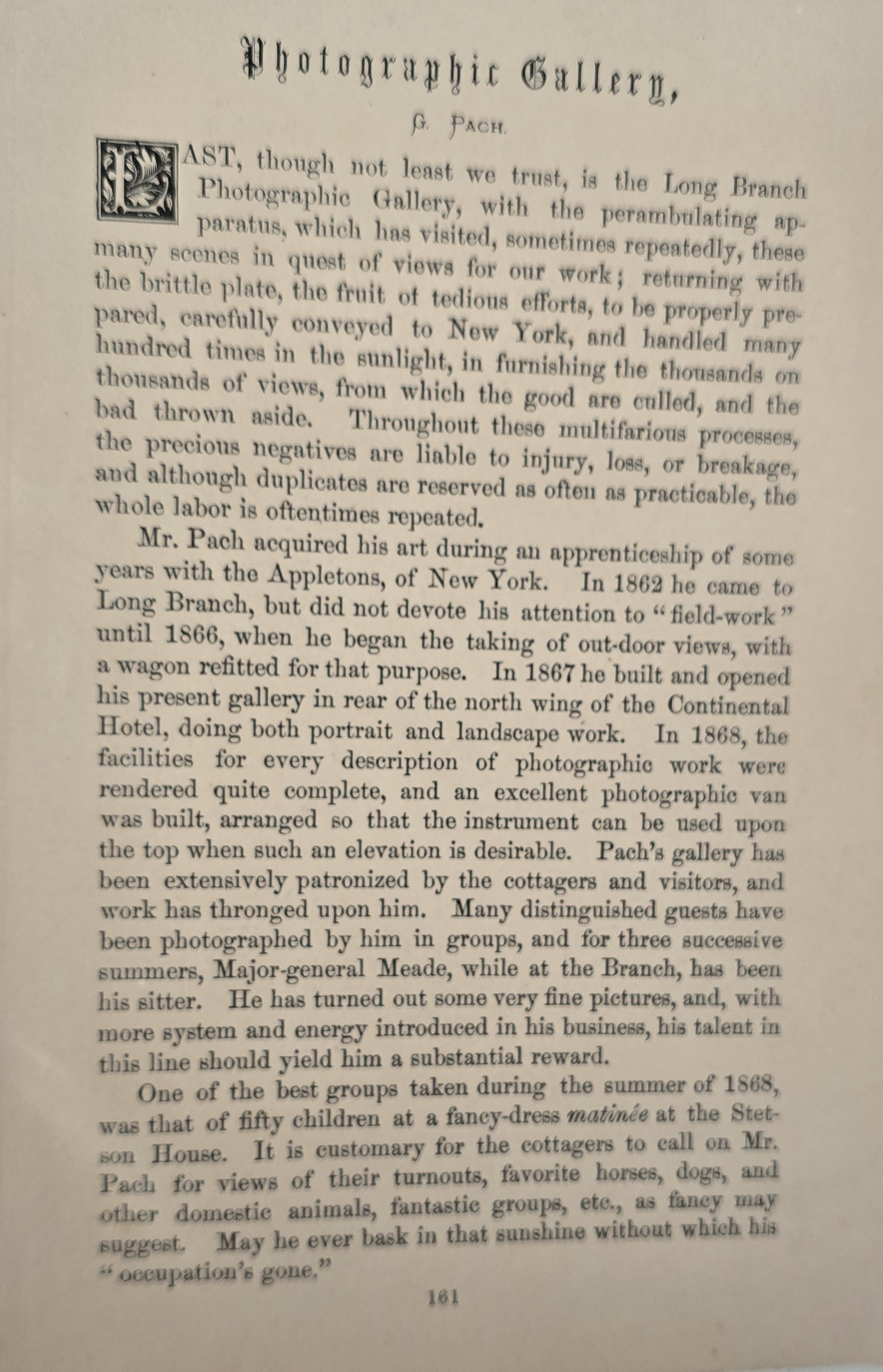 More Information: The photos were done by G.W. Pach (the final photograph is of him standing with his camera in front of his sky-lit studio with his wagon), and are quite nice. The photos depict a large variety of different architectural styles used in the buildings at Long Branch, each with a page of letter-press description. In the preface, Pach describes his difficulty in obtaining good negatives in the sometimes windy and inclement weather of Long Branch. Pach and his brothers eventually established one of the most successful photographic studios in New York City of the late nineteenth-century. A true rarity: this is only the second copy to appear at auction in the last fifty years. Sabin 77561. Images are E, book is Fair. $3500