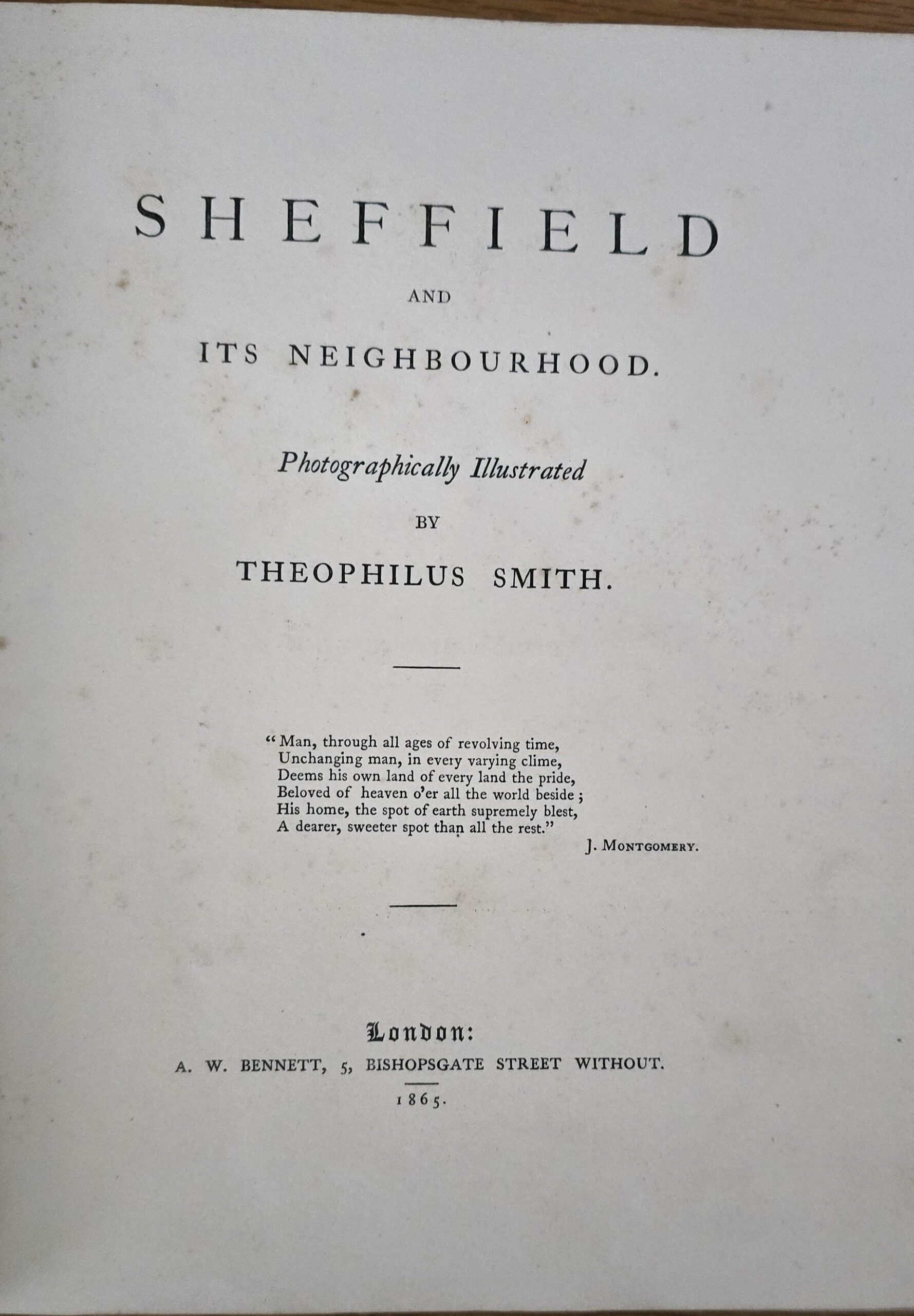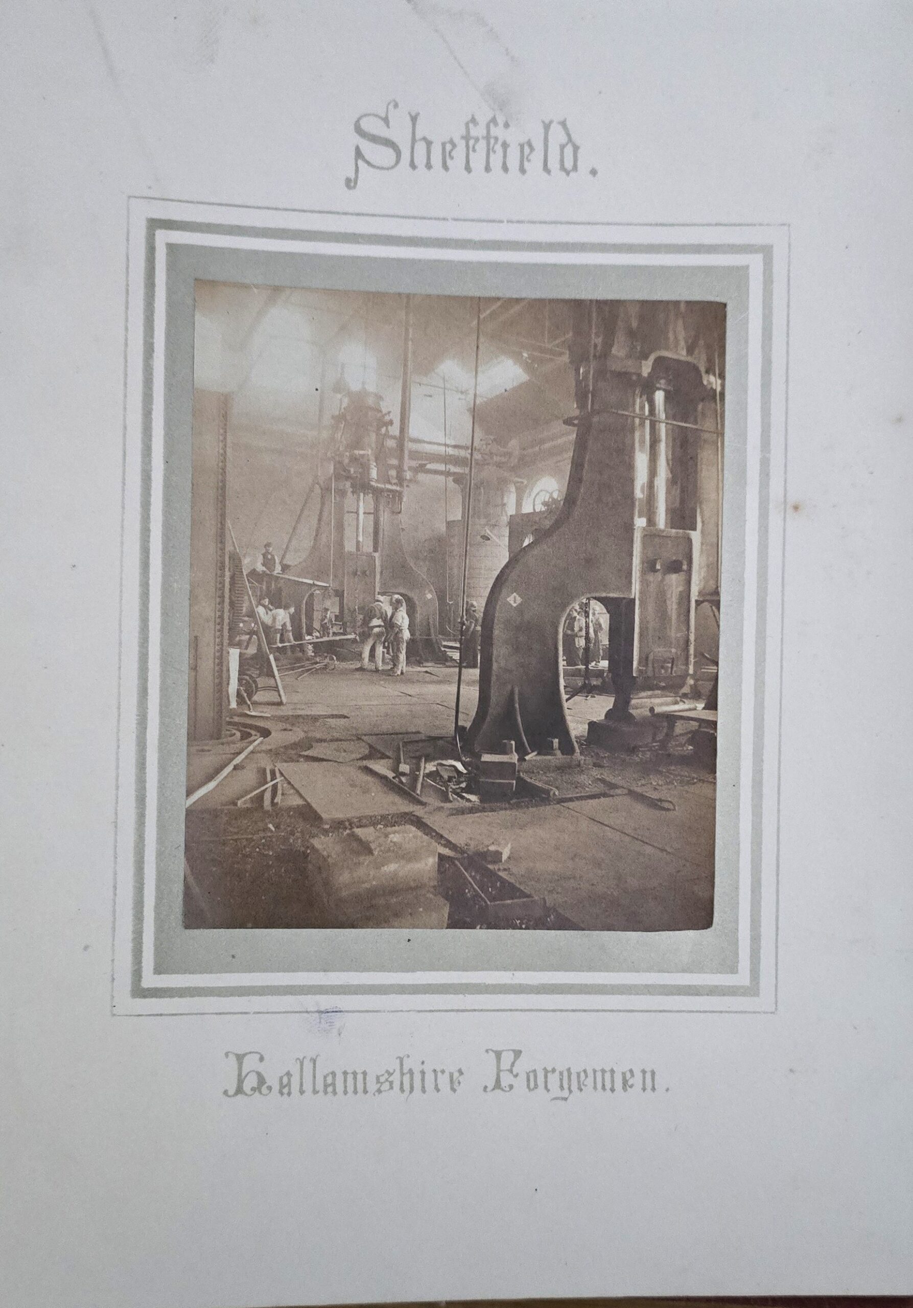 Smith, Theophilus. Sheffield and its Neighbourhood Illustrated. London: A.W. Bennett, 1865. (xii) + 132 pp with 16 mounted albumen photos and 11 wood engraving illustrations. First edition of a scarce but well-known book, especially notable for the oft-reproduced frontispiece view of a huge steam-hammer entitled “Ballamshire Foregmen.” Gernsheim points out that Smith was about the earliest photographer to overcome the difficulties of photographing men at work in interiors (History p. 265) and Truthful Lens 150 (and Fig. 48) includes the present with the comment “the view of the Ballamshire Forgemen is one of the early steps towards using photographs as a tool for social documentation.” 1 plate separated. A.E.G. Corners bumped. G. $750
