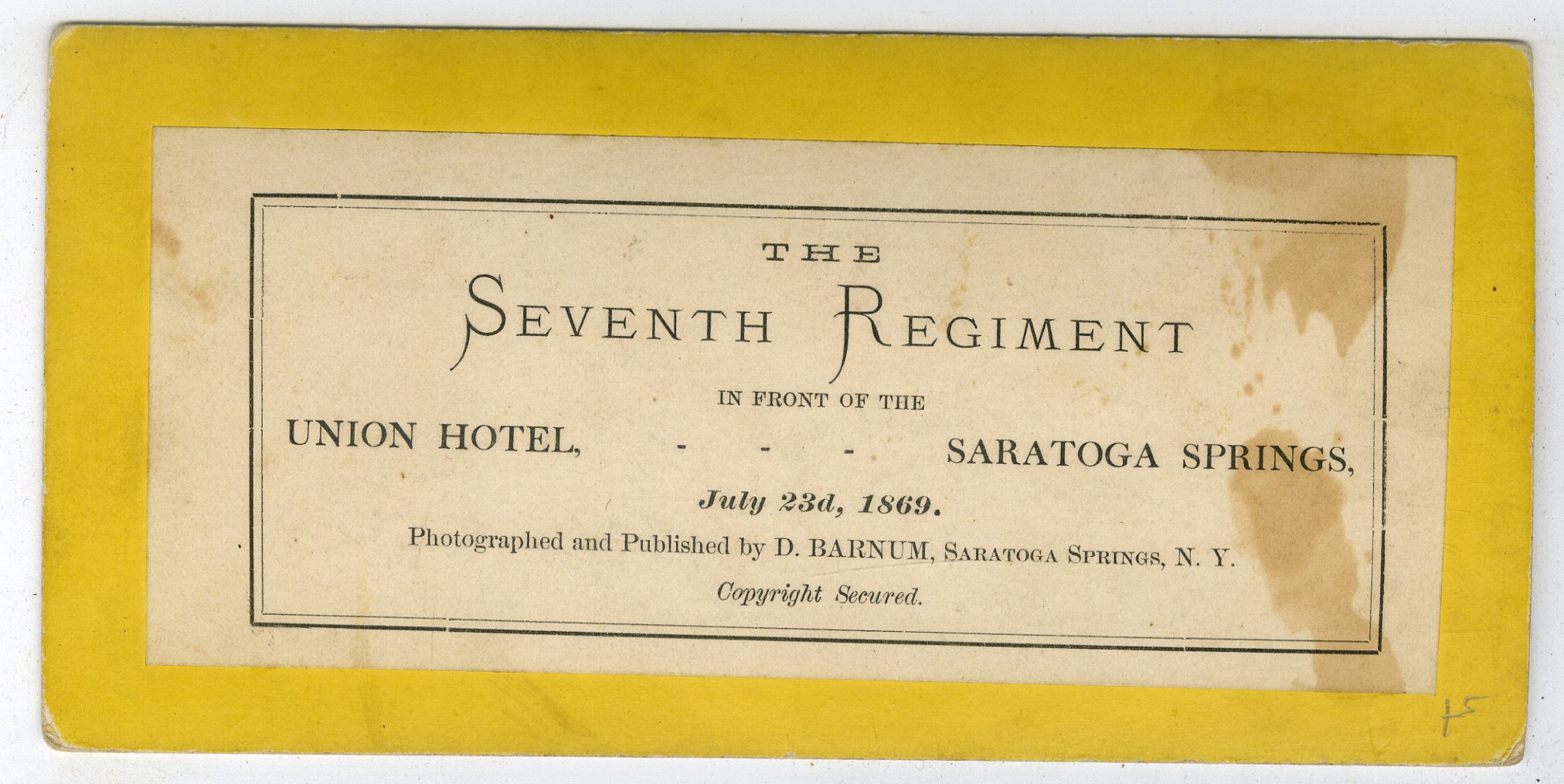 Bar29. The Seventh Regiment in front of the Union Hotel, Saratoga Springs, July 23d, 1869. VG. $125