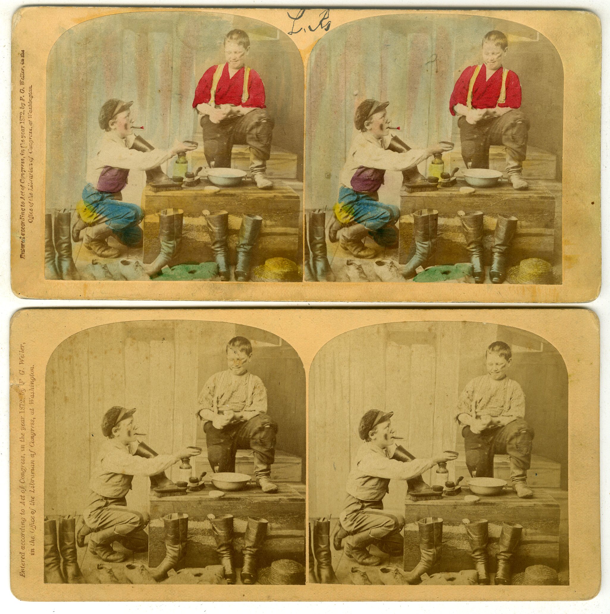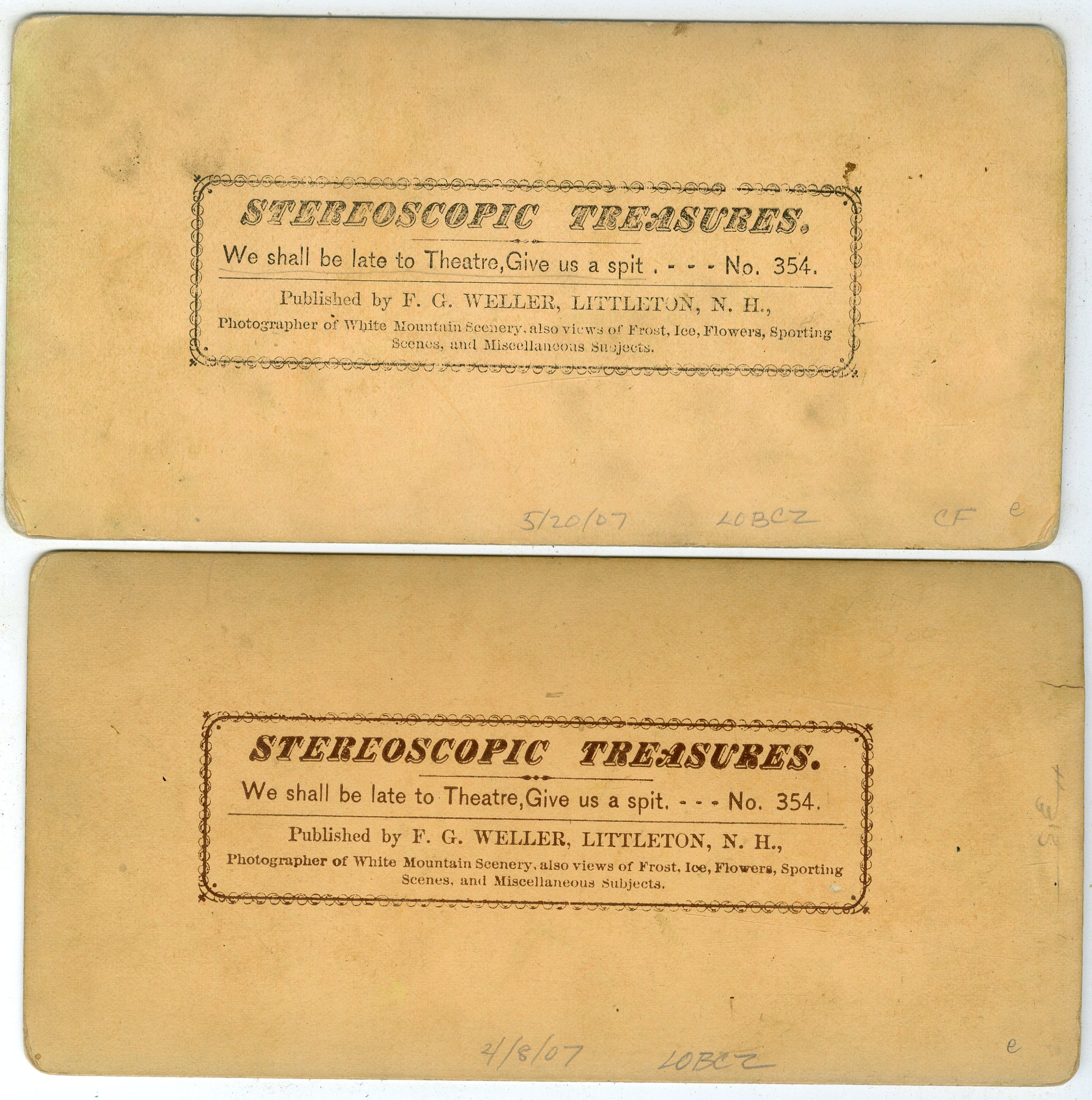 CH140. F.G. Weller, Littleton, N.H. We shall be late to Theatre, Give us a spit. No. 354. Pair of views, one tinted, one not. G. $15