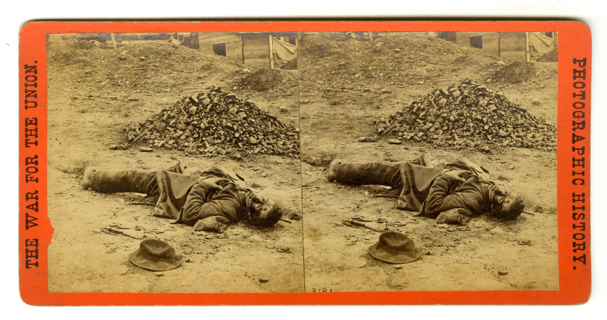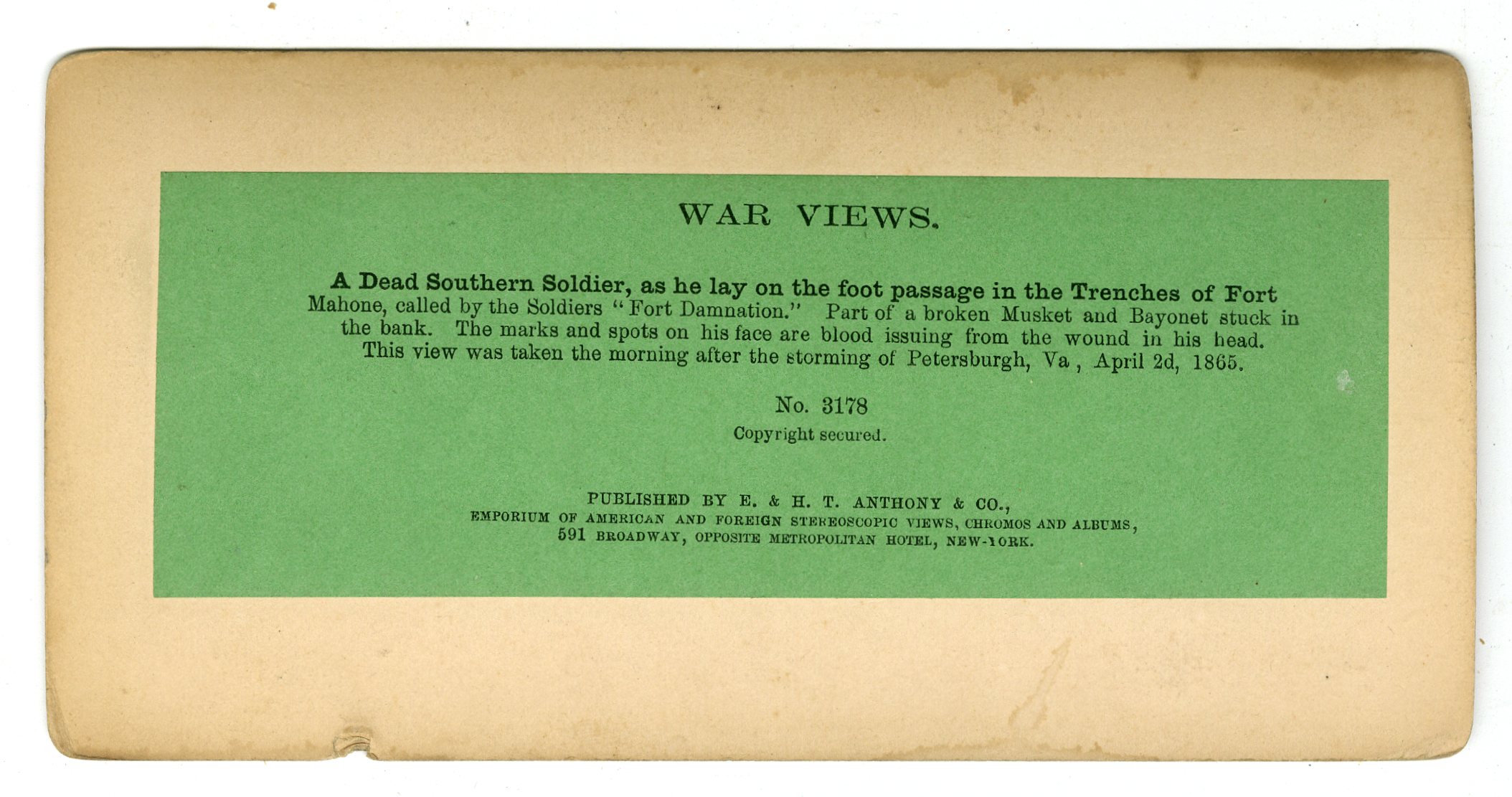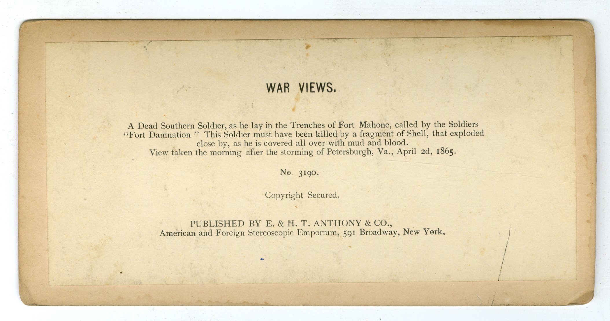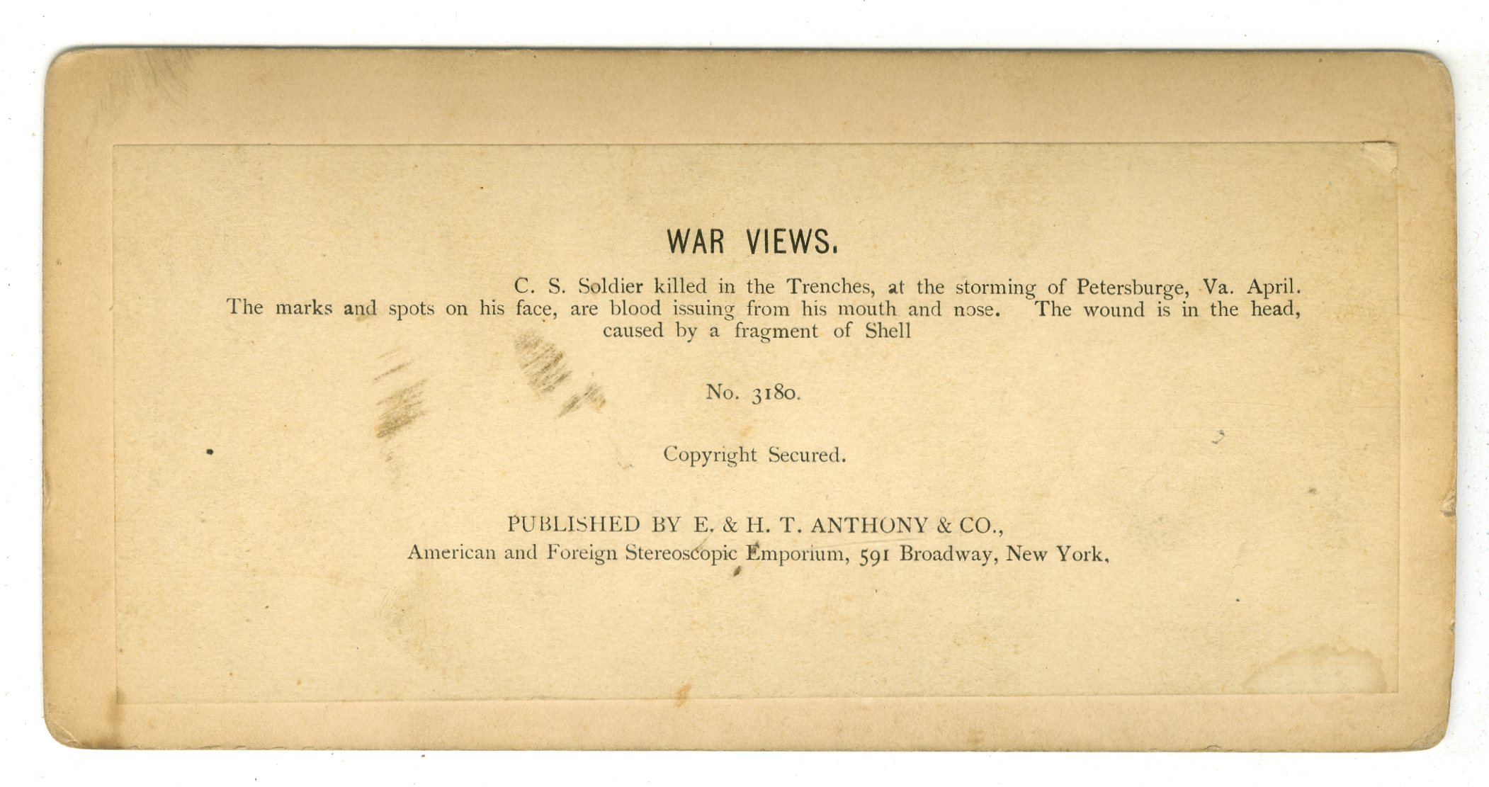 CW1583. E&HT Anthony. War Views. No. 3177. C.S. Soldier killed by a shell in the Trenches of Fort Mahone, called by the Soldiers “Fort Damnation.” This view was taken the morning after the storming of Petersburgh, Va., April 2d, 1865. G. $111