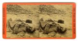CW1580. Negative by Alex. Gardner, published by E&HT Anthony. Photographic Incidents of the War. No. 554. He Sleeps His Last Sleep. A Confederate Soldier who after being Wounded had evidently dragged himself to a little ravine on the hill side, where he died. Card has an old crease at center but is firm. G. $250