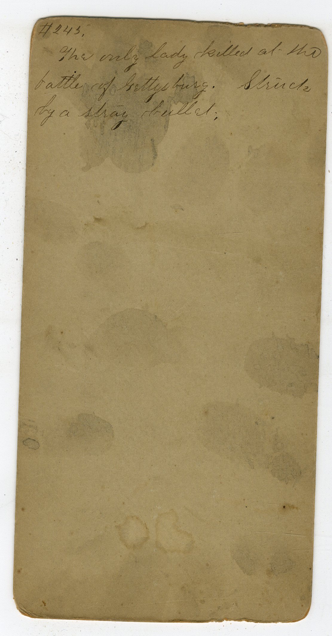 CW1813. Stereoview with the following written on verso: “#245. The only lady killed at the Battle of Gettysburg. Struck by a stray bullet.” Printed on recto “Jennie Wade.” G. $100