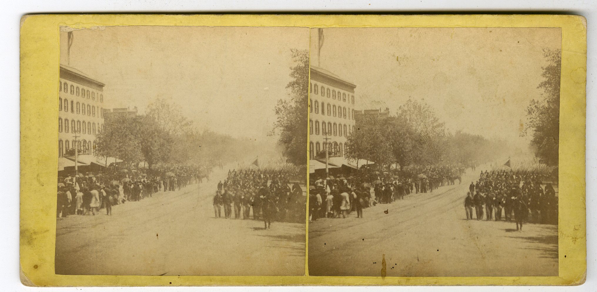 CW1475. E&HT Anthony. War Views. No. 3393. Grand Review of the Great Veteran Armies of Grant and Sherman at Washington, on the 23d and 24th of May, 1865. Instantaneous. Sherman’s Grand Army. Looking up Pennsylvania Avenue from the Treasury Buildings. Maj. Gen. Slocum and Staff and Army of Georgia passing in Review. G. $200