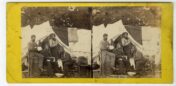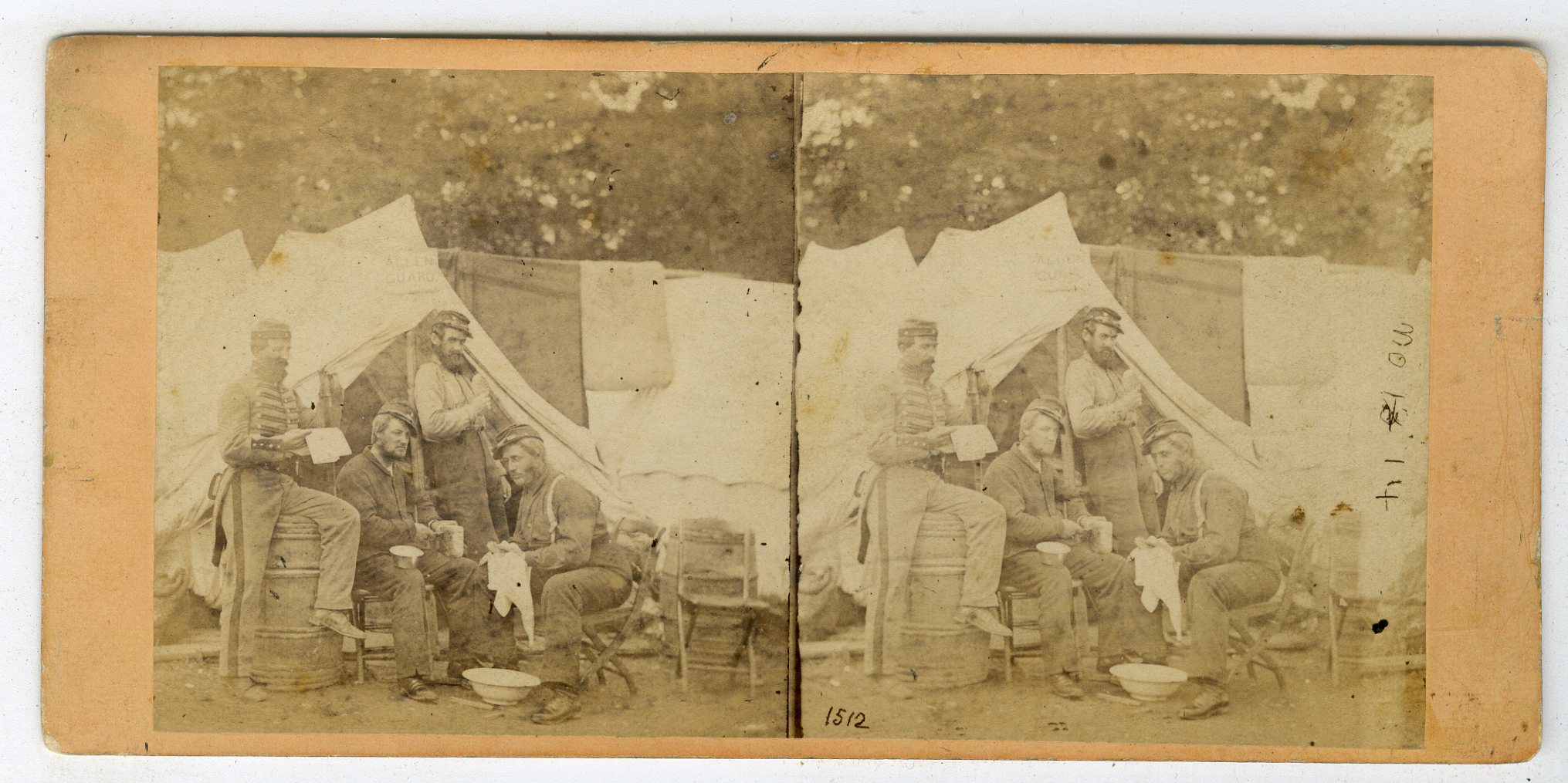 CW726. Negative by James F. Gibson for Gardner’s Gallery, Wash, DC. Photographic Incidents of the War. No. 356. Group, Duc de Chartres and Friends, Camp Winfield Scott, Near Yorktown, May 3, 1862. Looks like they are playing dominoes. Spot on lower left image. View may be pseudoscopic or flat. G. $300