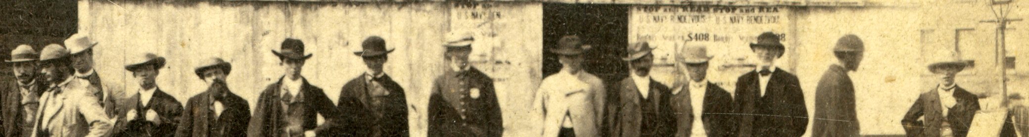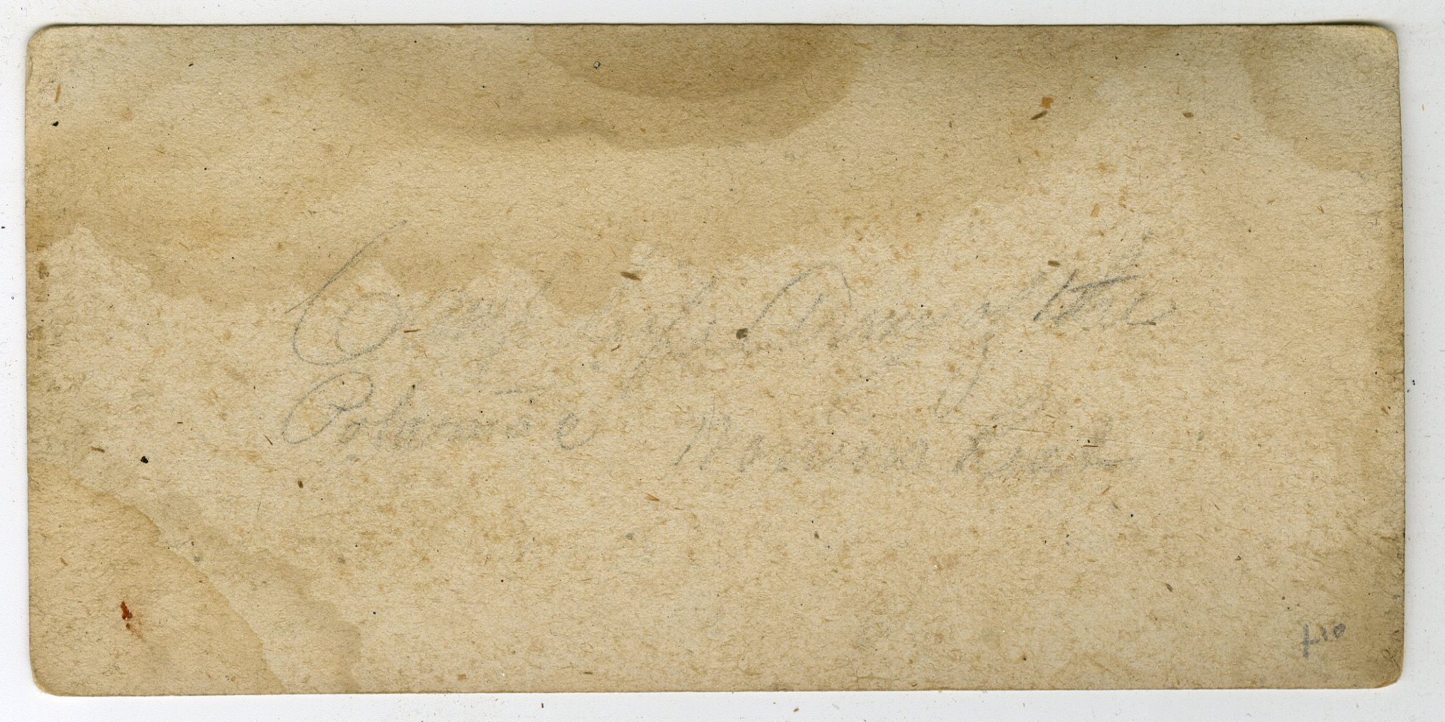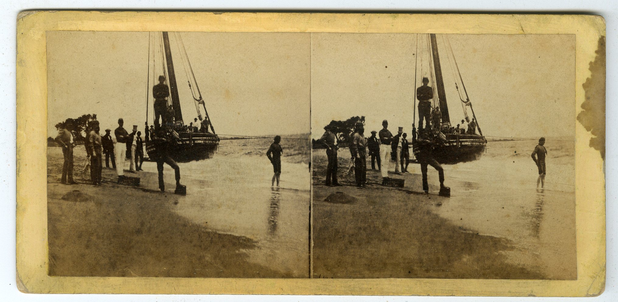 CW769. Alexandre Pouget, Cap Haytien. Officers of U.S.S. Rhode Island. Manuscript title on verso. This is the first U.S.S. Rhode Island. It was a side-wheel steamer in the US Navy, commissioned in 1861. Built at New York, NY in 1860 by Lupton & McDermut, named John P. King, burned and rebuilt, renamed Eagle in 1861, purchased by the Navy 27 June 1861, renamed Rhode Island, Comdr. Stephen D. Trenchard in command. The Rhode Island was employed as a supply ship visiting various ports and ships with mail, paymasters officers stores, medicine and other supplies. Nevertheless the ship captured a chased a number of confederate vessels. The Rhode Island towed the Monitor from Hampton Roads, rounded Cape Hatteras and encountered a heavy storm. The Monitor sank taking four officers and 12 enlisted men with her. E. $325