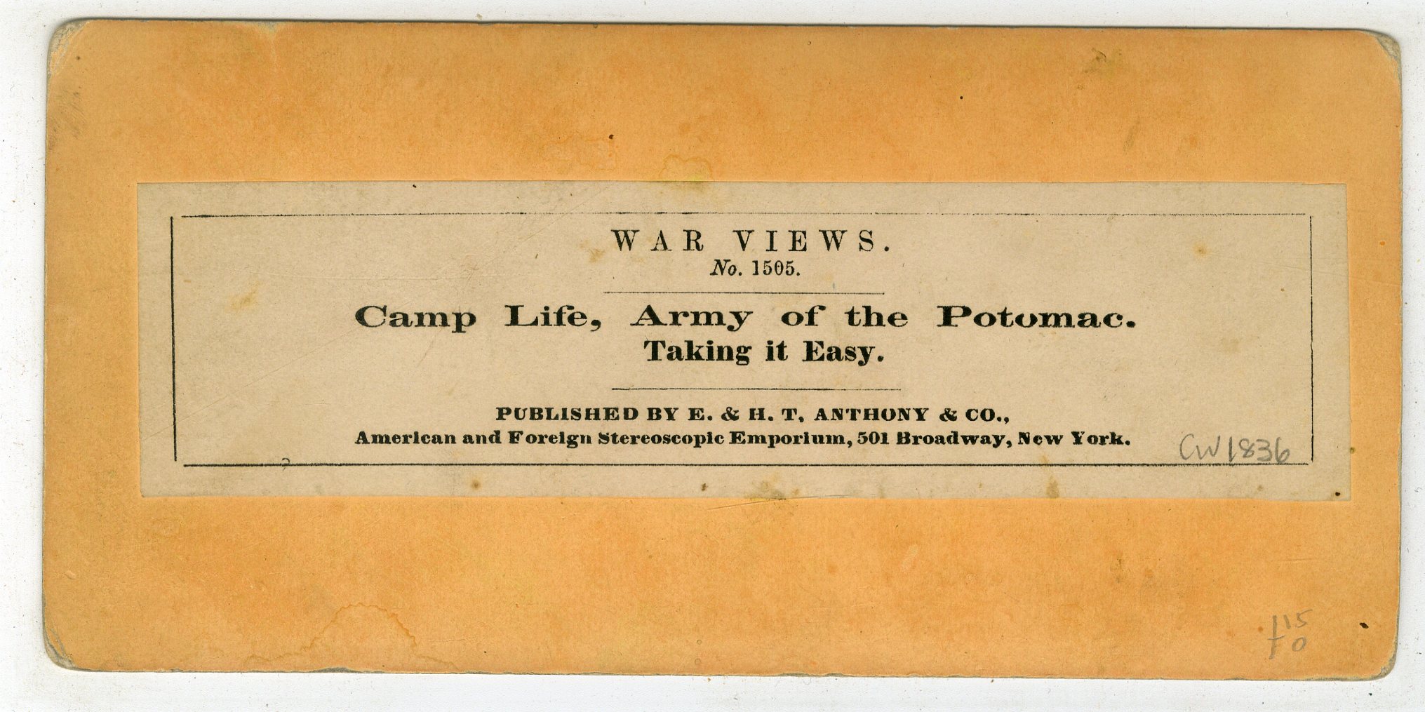 CW1836. E&HT Anthony. War Views. No. 1505. Camp Life, Army of the Potomac. Taking It Easy. Tinted. $300