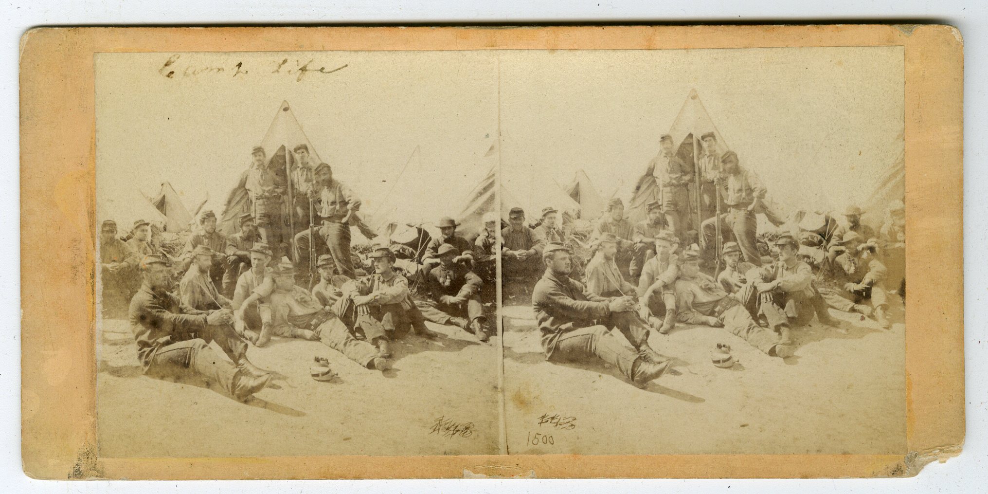 CW1206. Rare Civil War Glass Stereoview. Image is by George Stacy although published by Platt D. Babbitt titled Col. Duryea’s Adjutant’s Mess. Possibly taken at Fort Schuyler in the Bronx NY before they headed south. VG. $650