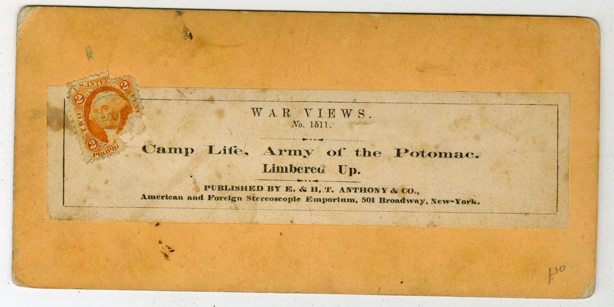 CW1843. E&HT Anthony. War Views. No. 1511. Camp Life. Army of the Potomac. Limbered Up. Tinted. Partial tax stamp on verso. VG. $200