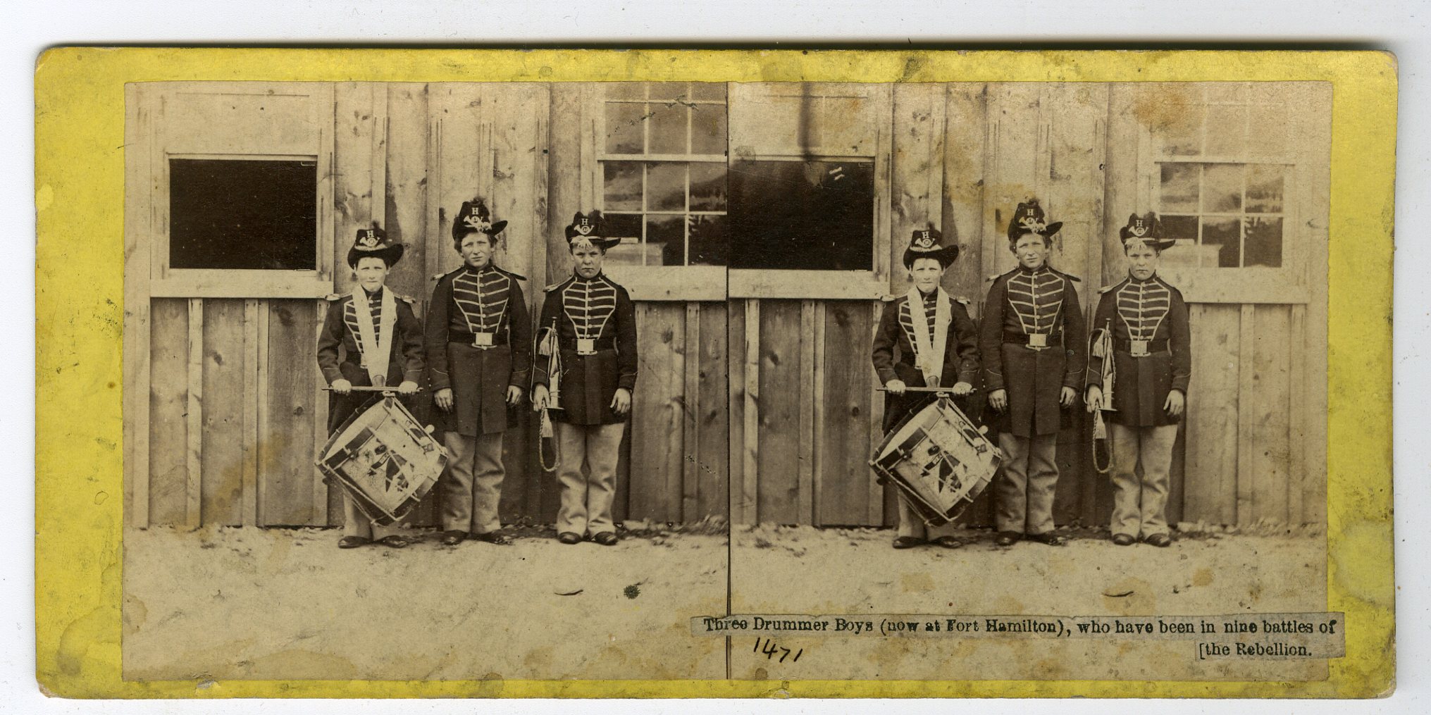 CW1847. [E&HT Anthony]. Unlabeled. War Views. No. 1471. Three Drummer Boys (now at Fort Hamilton) who have been in nine Battles of the Rebellion. G. $350