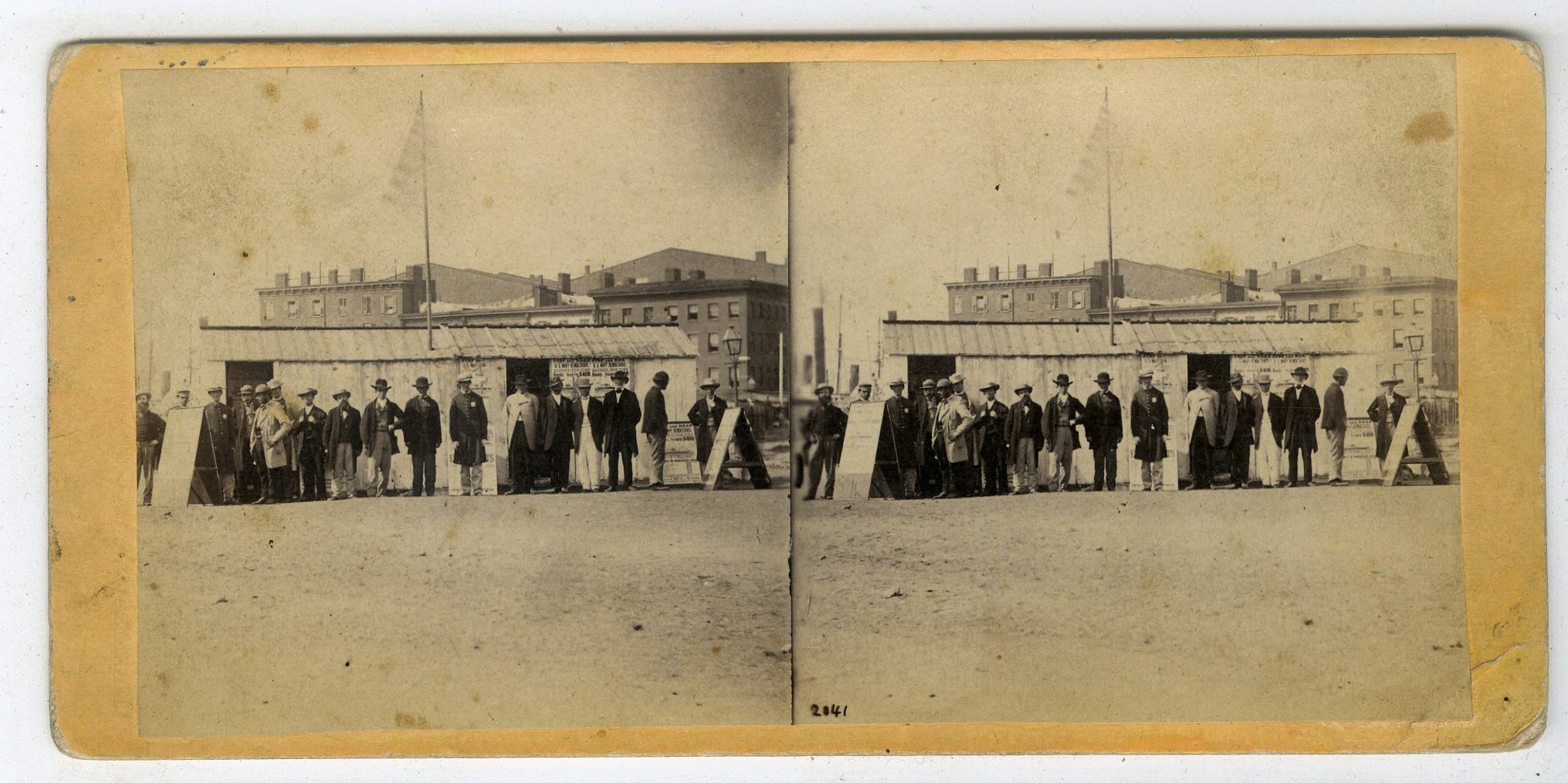 CW1849. E&HT Anthony. War Views. No. 2041. Bounty Brokers Looking Out for Substitutes. Signs read “Stop and Read, US Navy Rendezvous, Battery New York, Bounty Seamen $408.” 2-cent tax stamp on verso. VG. $350