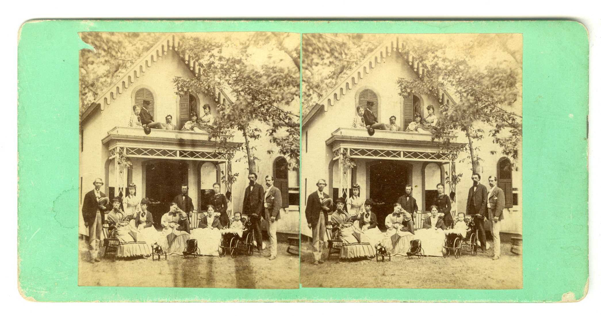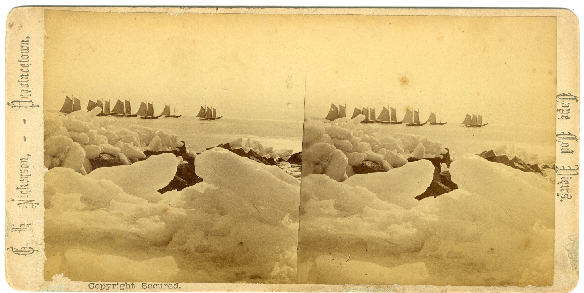 Mass379. Proctor Brothers, Gloucester, Mass. Cape Ann Scenery. 1775-1875. Gloucester’s Centennial, August 9th. Stereoscopic Views of the Celebration. 227. Defiance Engine Co. No. 5, at Cape Pond Grove. Also titled on back No. 10. Members of Defiance Engine Co. No. 5, Joseph M. Marsh, Foreman, in line at the wharf at Cape Pond Grove. G-. $35