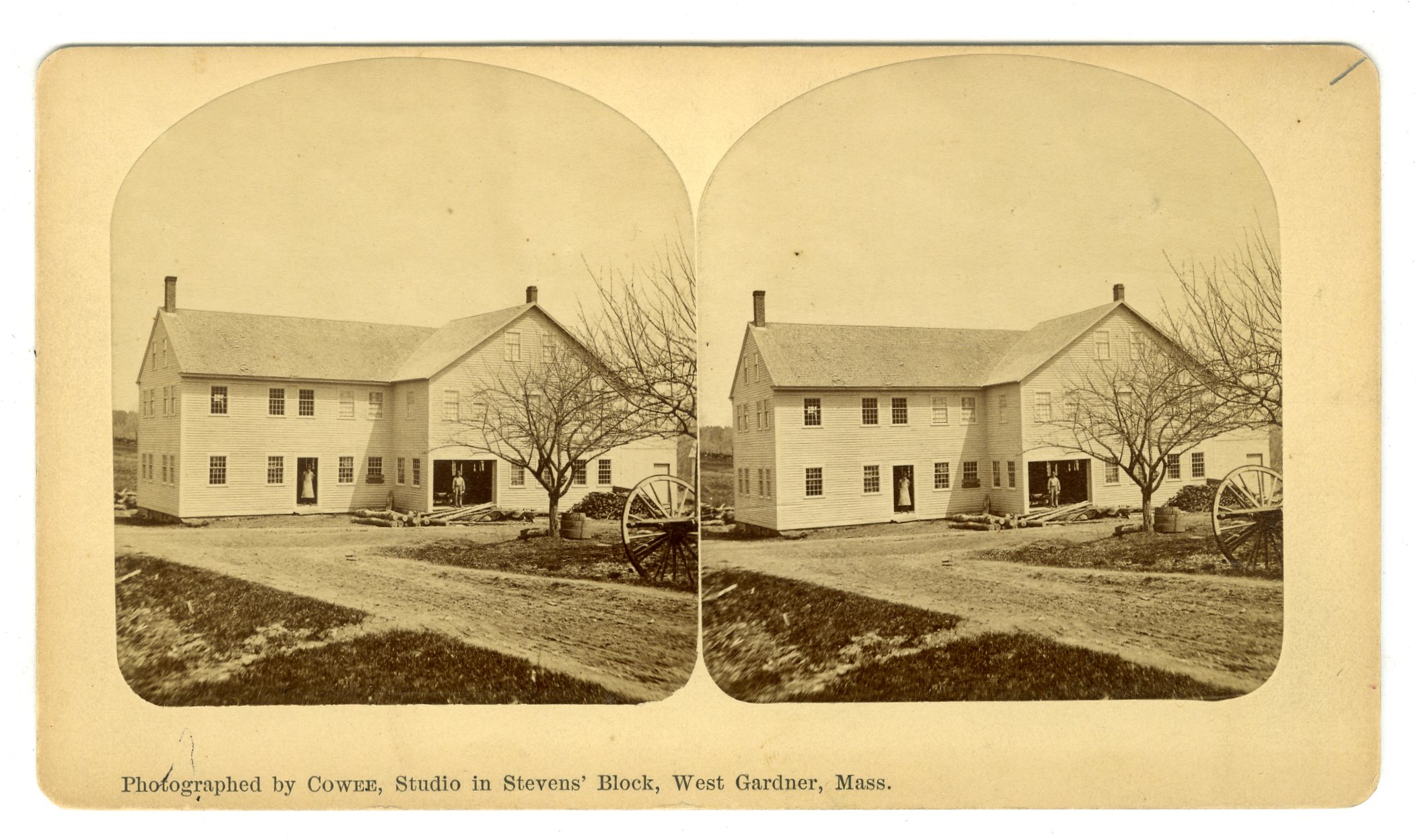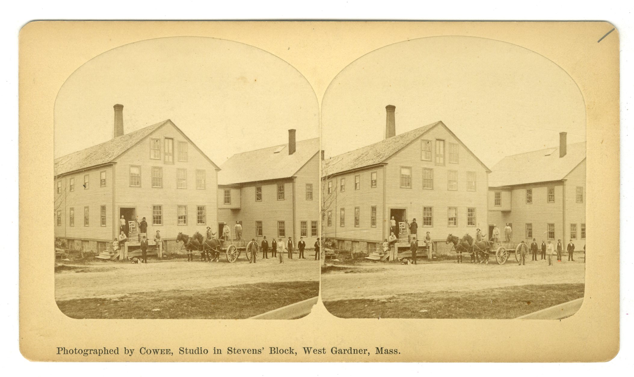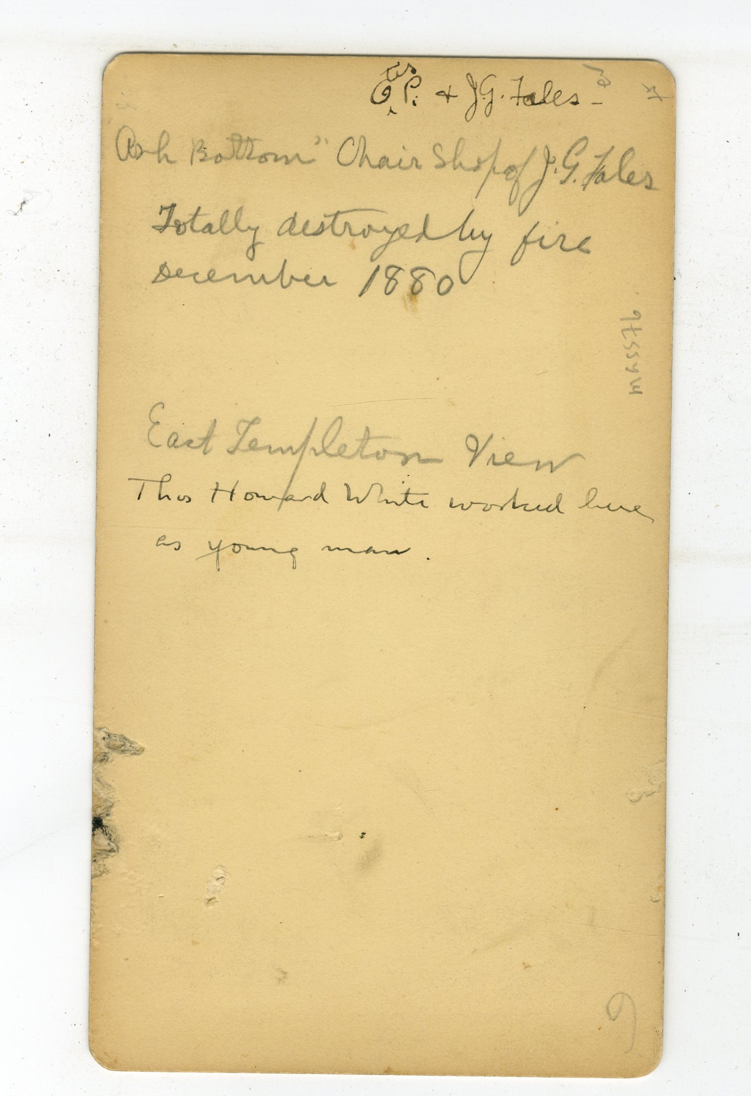 MASS76. Cowee, West Gardner, Mass. Written on back: “G.P. & J.G. Tales. Ash Bottom Chair Shop of J.G. Tales. Totally destroyed by fire December 1880. East Templeton View. This Howard White worked here as young man.” VG. $50
