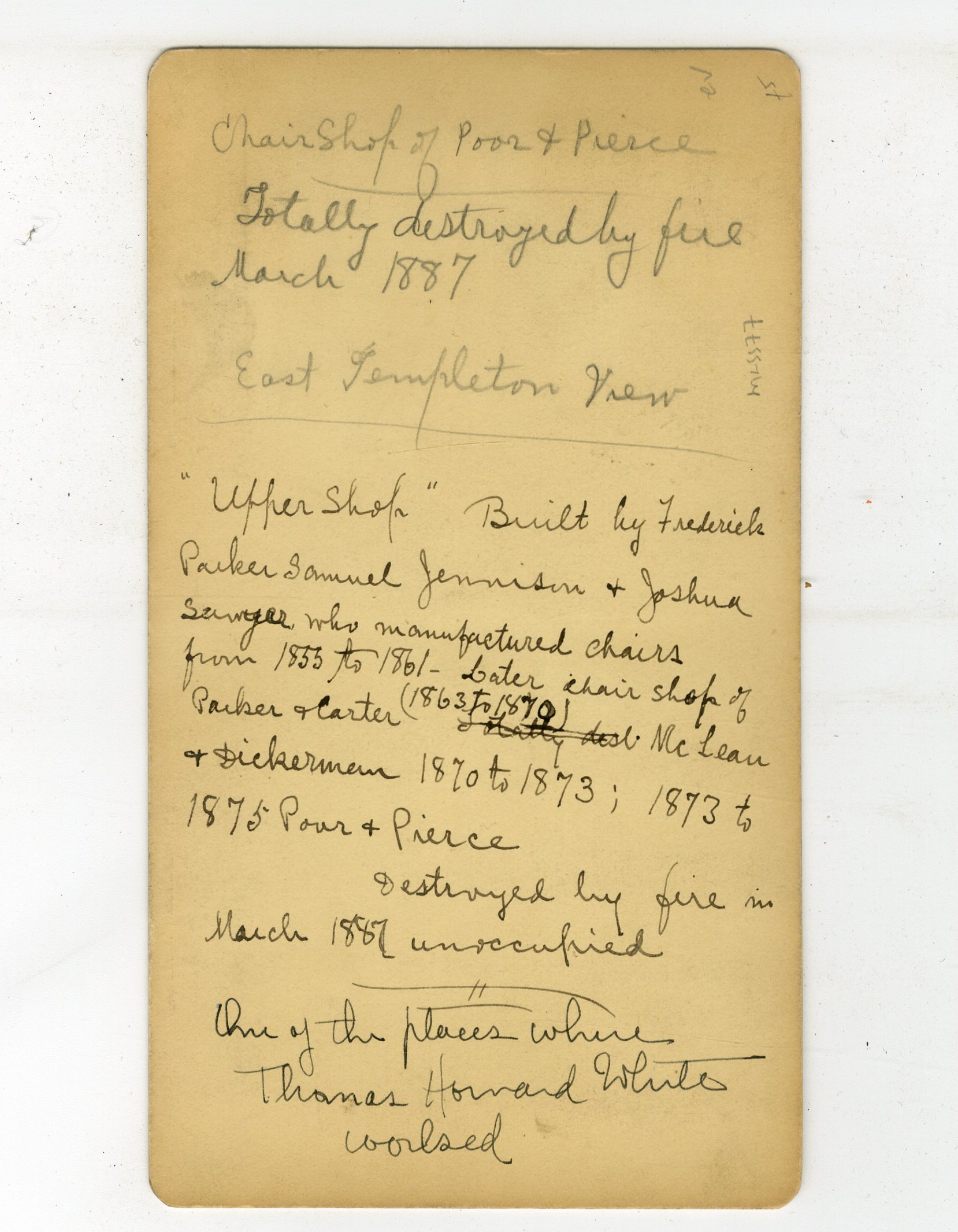 MASS77. Cowee, West Gardner, Mass. Written on back: “Chair Shop of Poor & Pierce. Totally destroyed by fire March 1887. East Templeton View. Upper Shop Built by Frederick Parker Samuel Jennison & Joshua Sawyer who manufactured chairs from 1853 to 1861. Later chair shop of Parker & Carter (1863 to 1870). McLean & Dickerman 1870 to 1873; 1873 to 1875 Poor & Pierce. Destroyed by fire in March 1887 unoccupied. One of the places where Thomas Howard White worked.” VG. $50